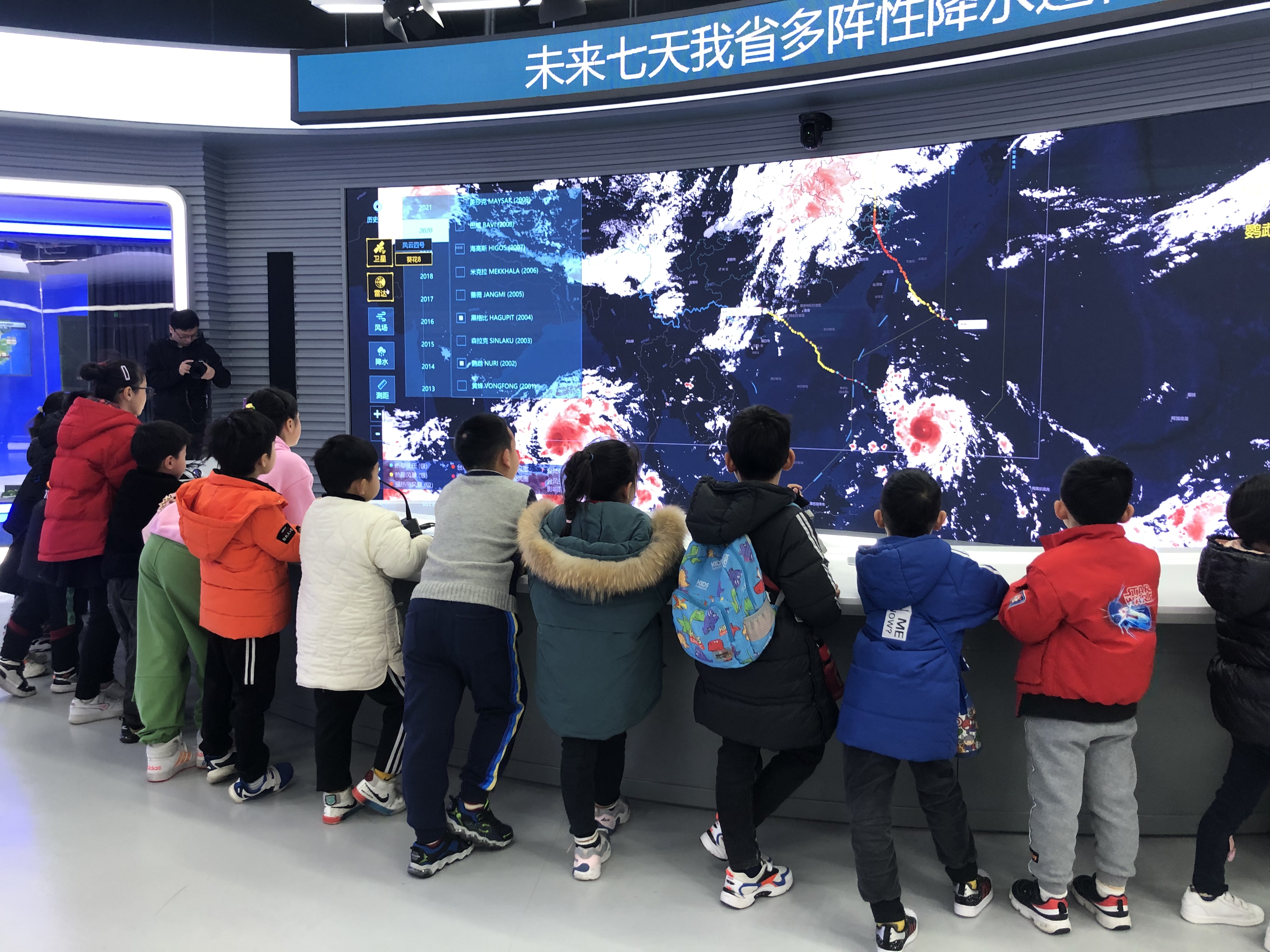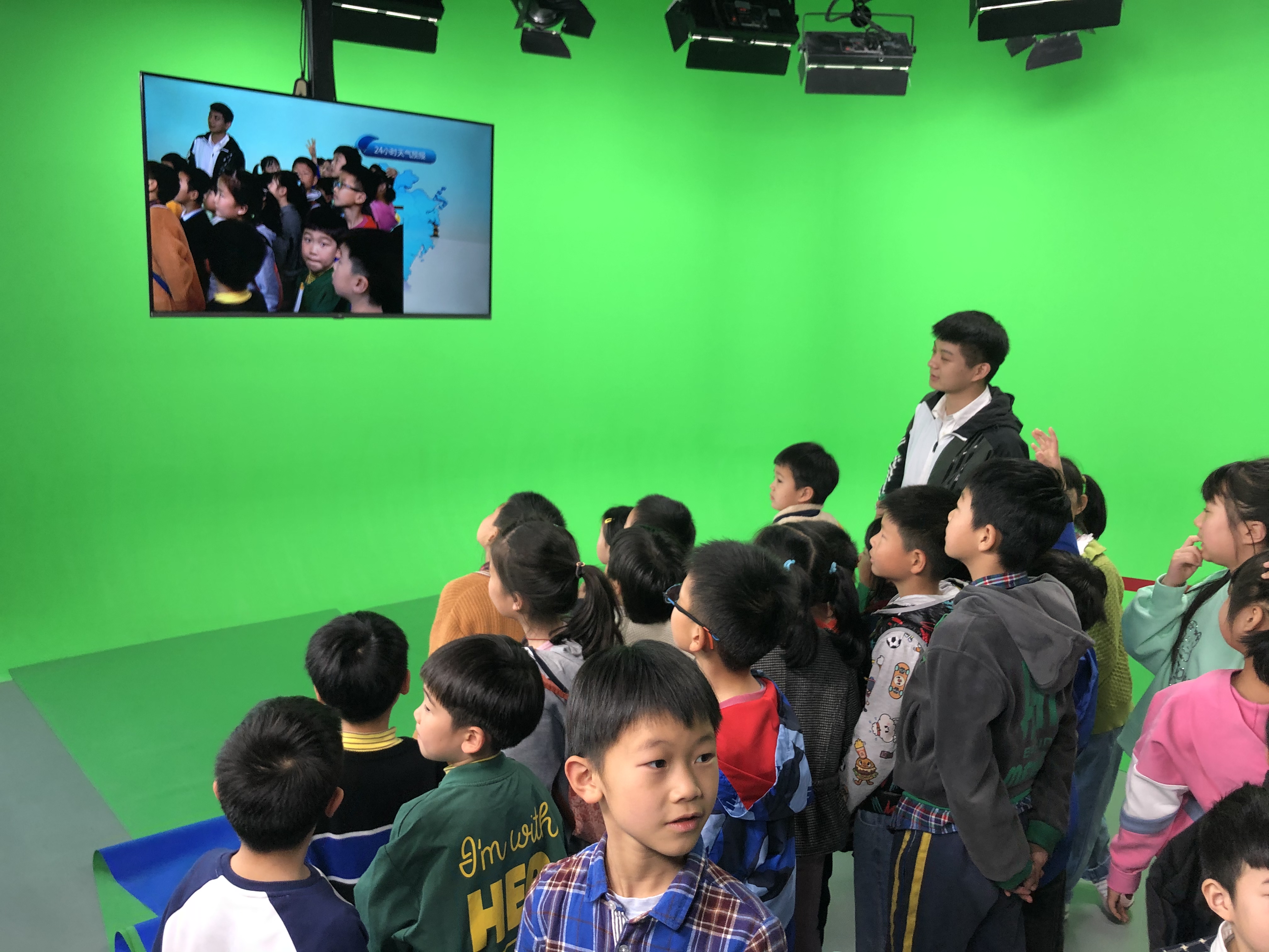 一组小朋友参观浙江卫视《天气预报》演播室,并体验节目录制;另一组小朋友留在原地,做实验小手工。