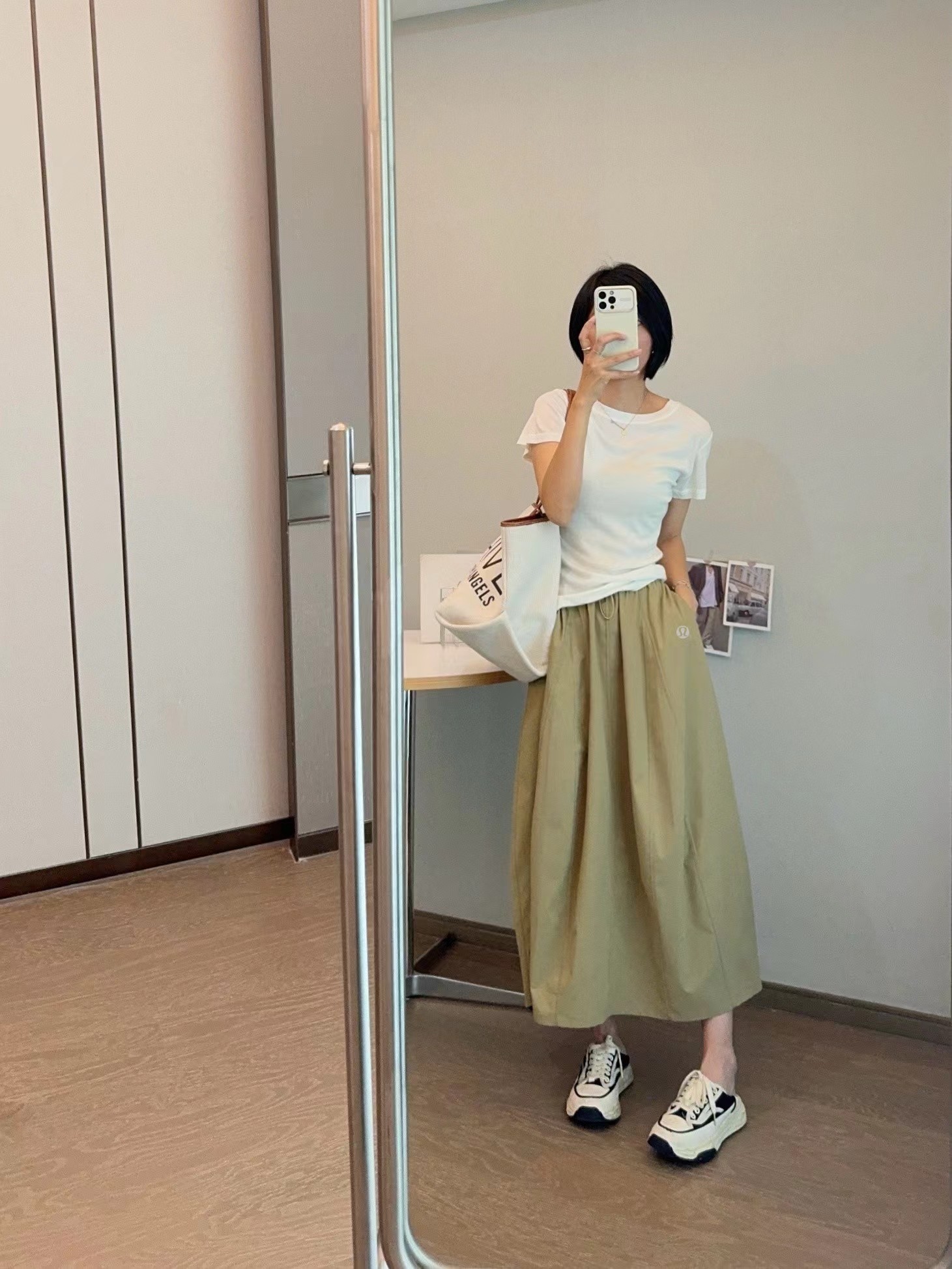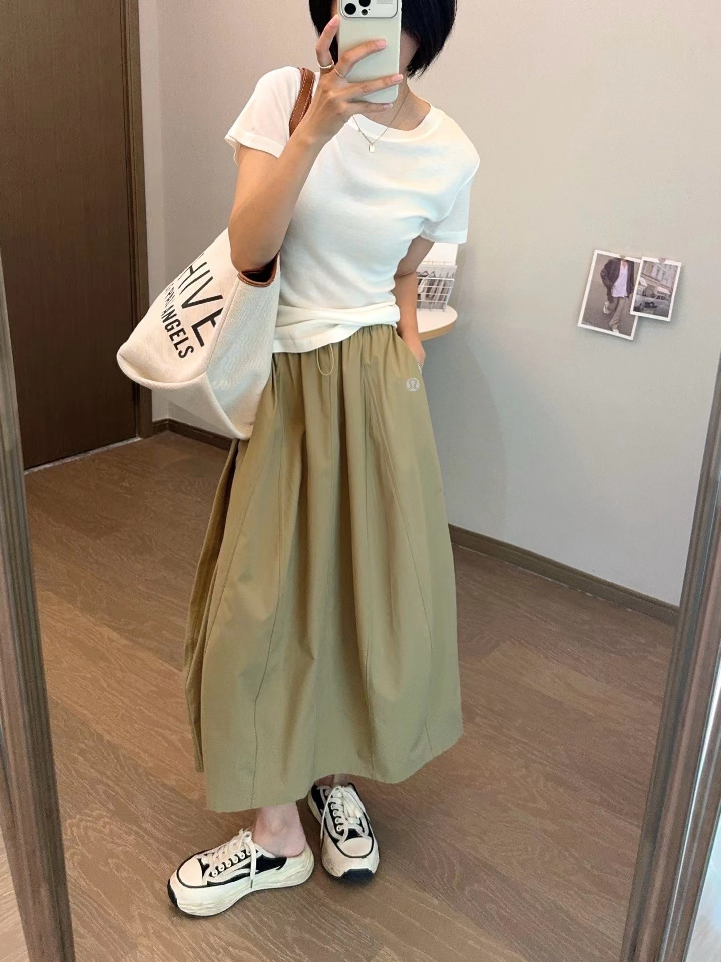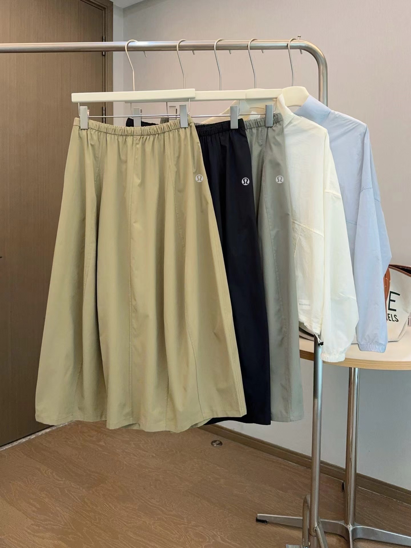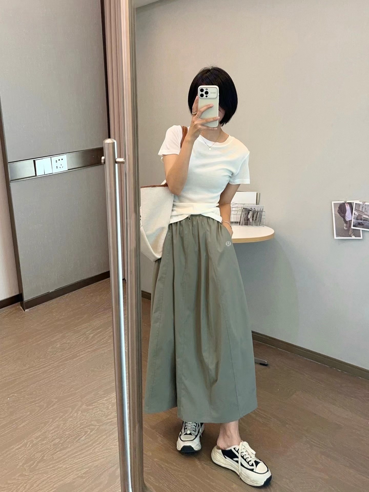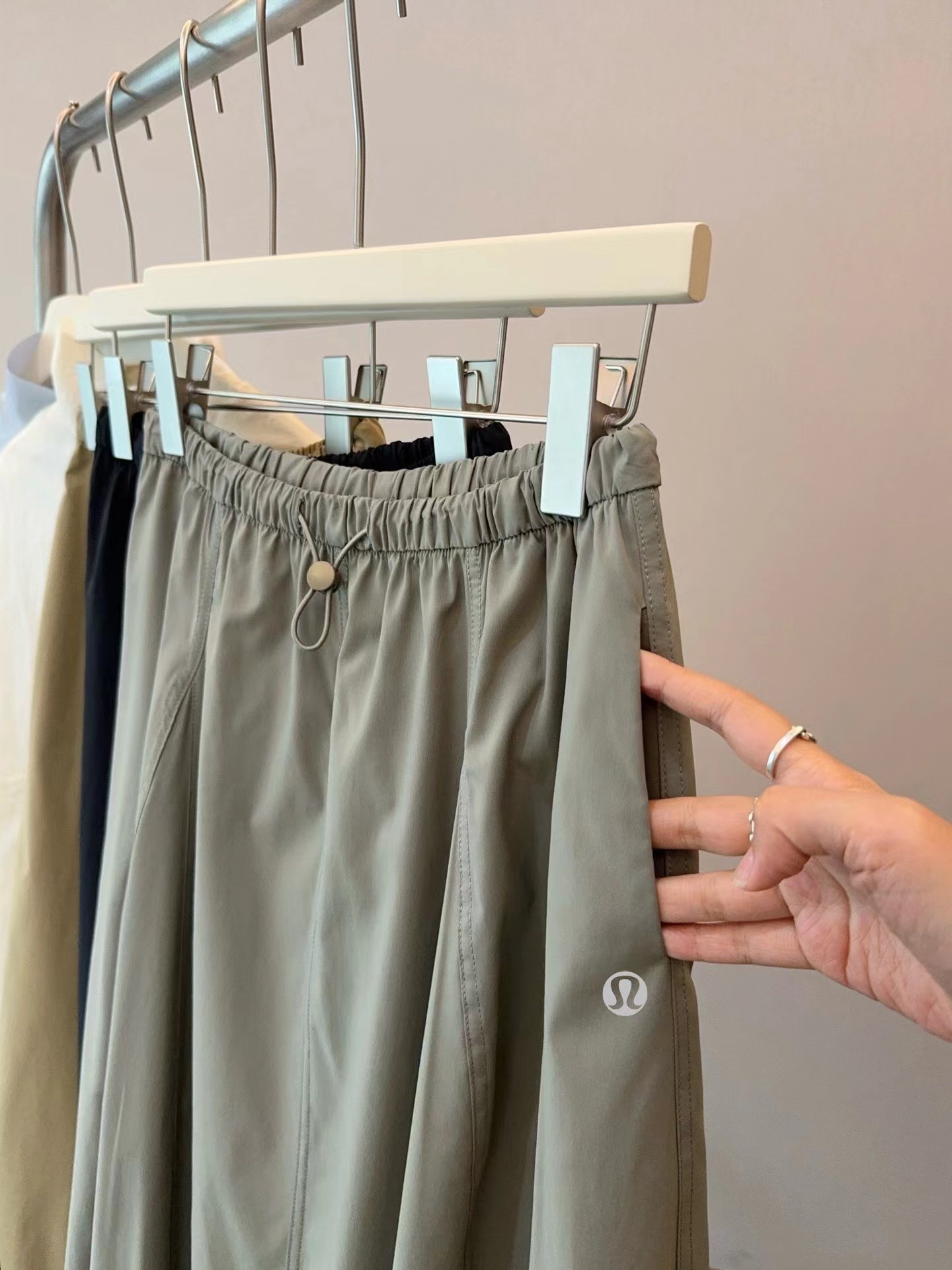 轻量复合防晒松紧腰A字宽松百搭工装半身裙,松紧腰设计?腰部细节做的非常好?没有任何毛边?内置弹力绳?可调节腰围?包容性更强?地雷扣点缀?更加时髦休闲?整体偏A字版型?裙身多处分割拼接?下摆微微内收?呈花苞状?非常显瘦又遮肉?裙长刚刚好到小腿肚的位置