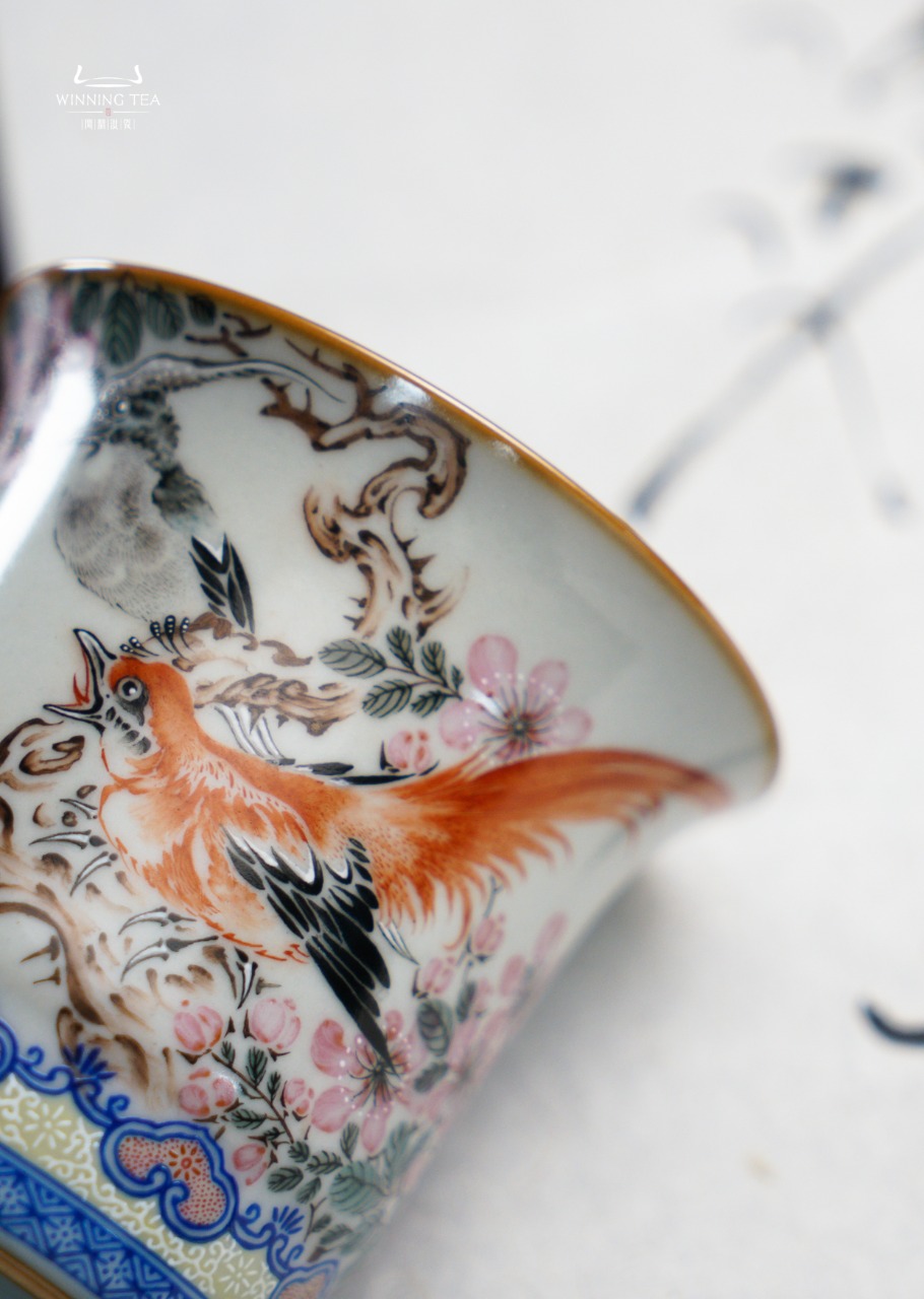 问鼎汝瓷鼎峰柴窑月白观月杯(梵红描金狮子绣球)