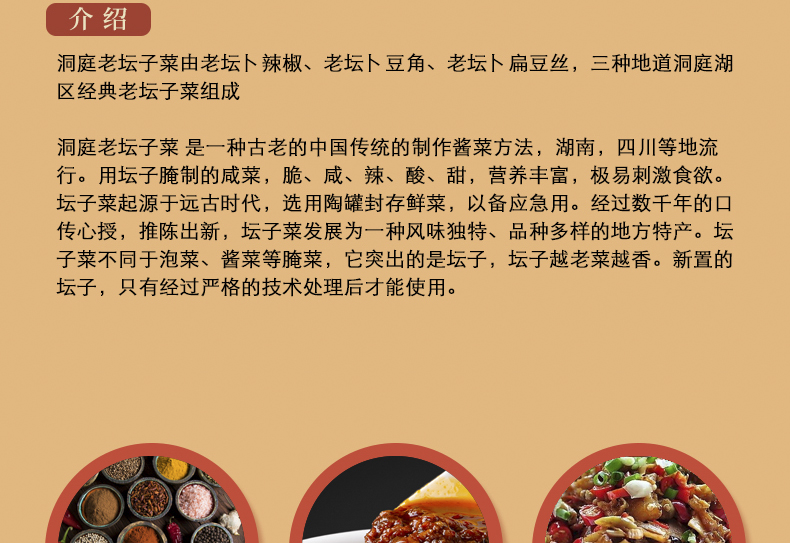 洞庭老坛子菜 源于纯粹的湖湘文化,最早起源于洞庭湖周边的常德和南县地区,质朴的洞庭湖人民用自己的勤劳和智慧,诠释不一样的坛子菜色彩。卜豆角,卜辣椒,卜扁豆丝 等都是智慧的结晶。在祖国高速发展壮大的70年代-80年代,陪伴无数的湖湘儿女度过最艰苦的岁月,响应主席的号召“人是铁饭是钢”,坛子菜正因为有特别下饭的特性,也使得苦尽甘来的70-80年代的我们有了一种对坛子菜独有的情怀,也成了一种岁月回忆的味道........尤其在外地的湖湘儿女吃一碗地道的湖南坛子菜,能多吃几碗饭以解乡愁。