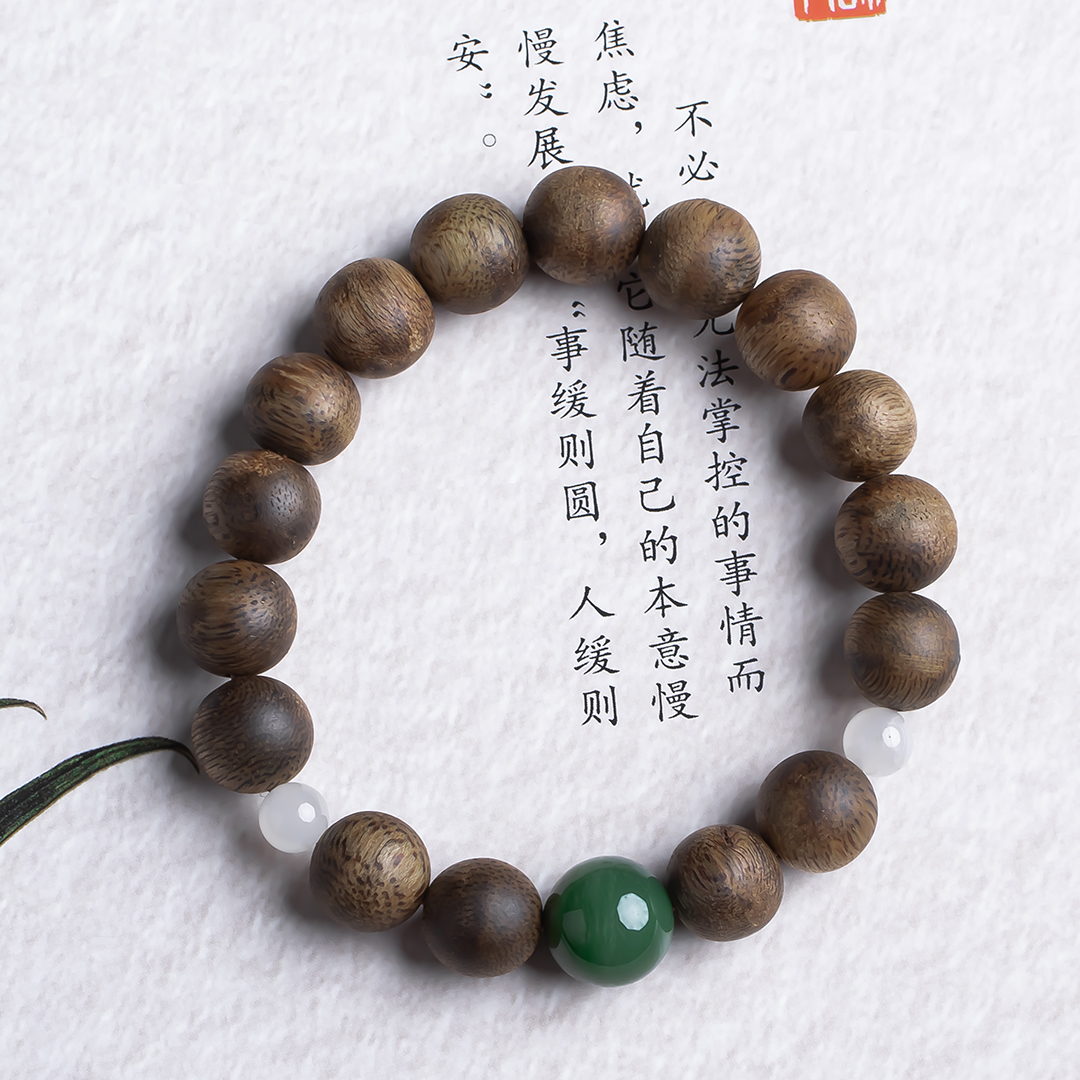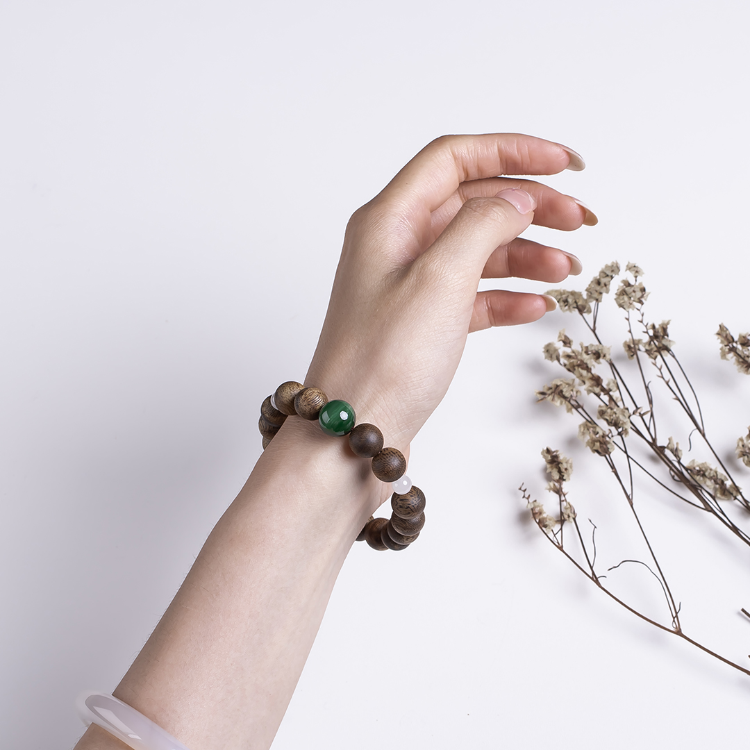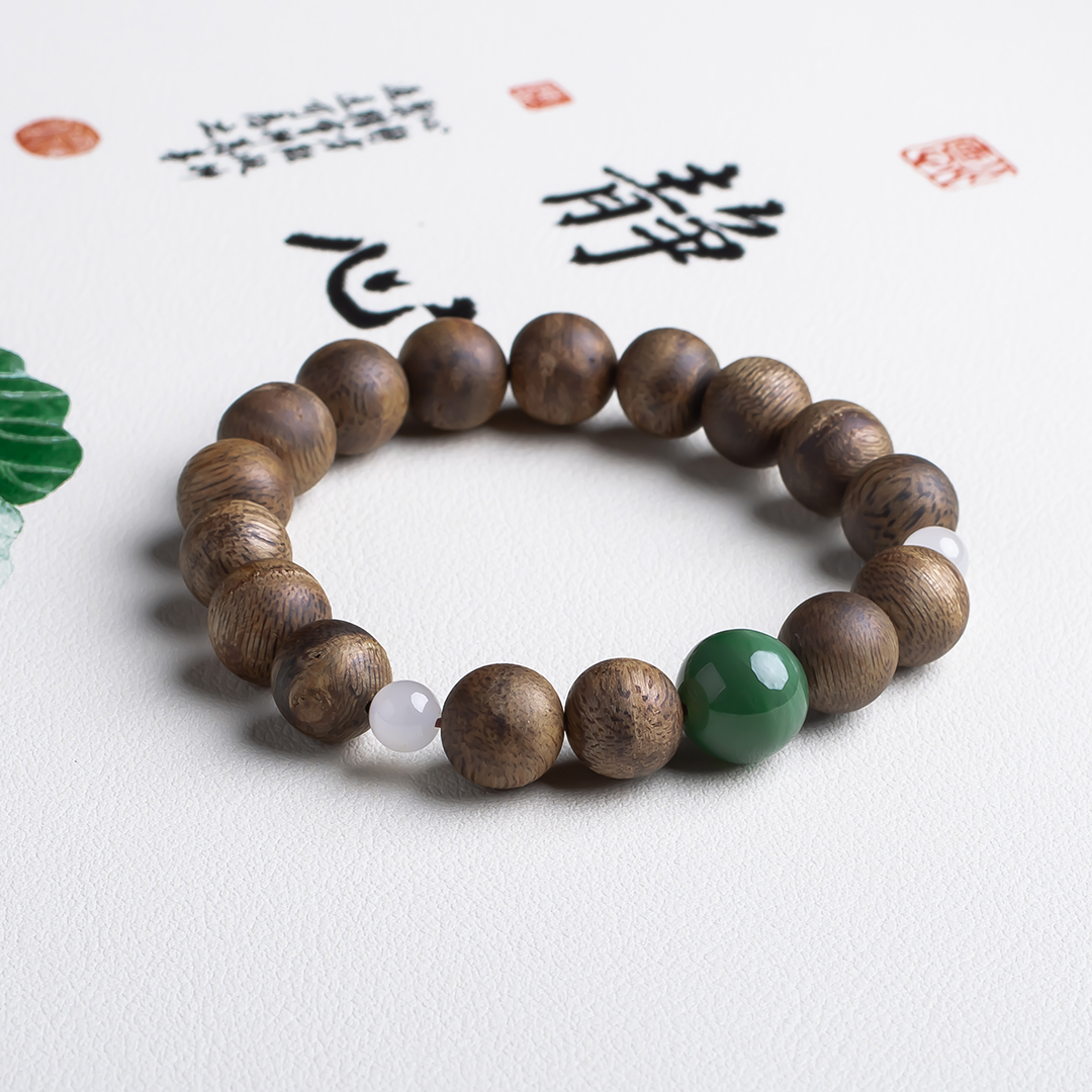 xy0486沉香+碧玉大手串,天然沉香约10.3mm,原色原味,香味自然清甜,一颗碧玉大圆珠搭两颗白玉小珠子,款式简约大方,上手大气。