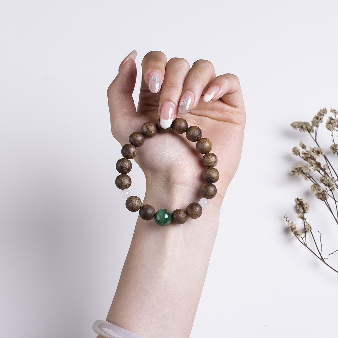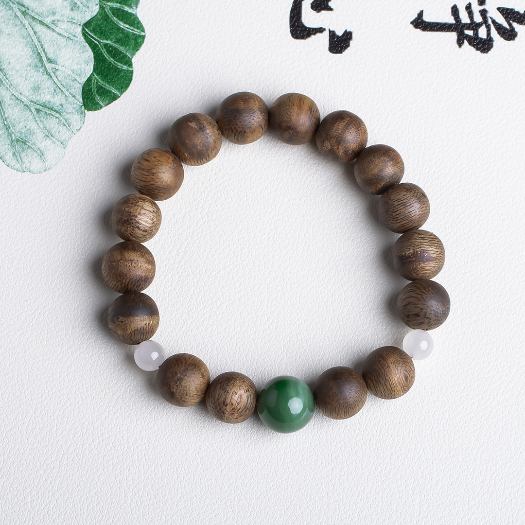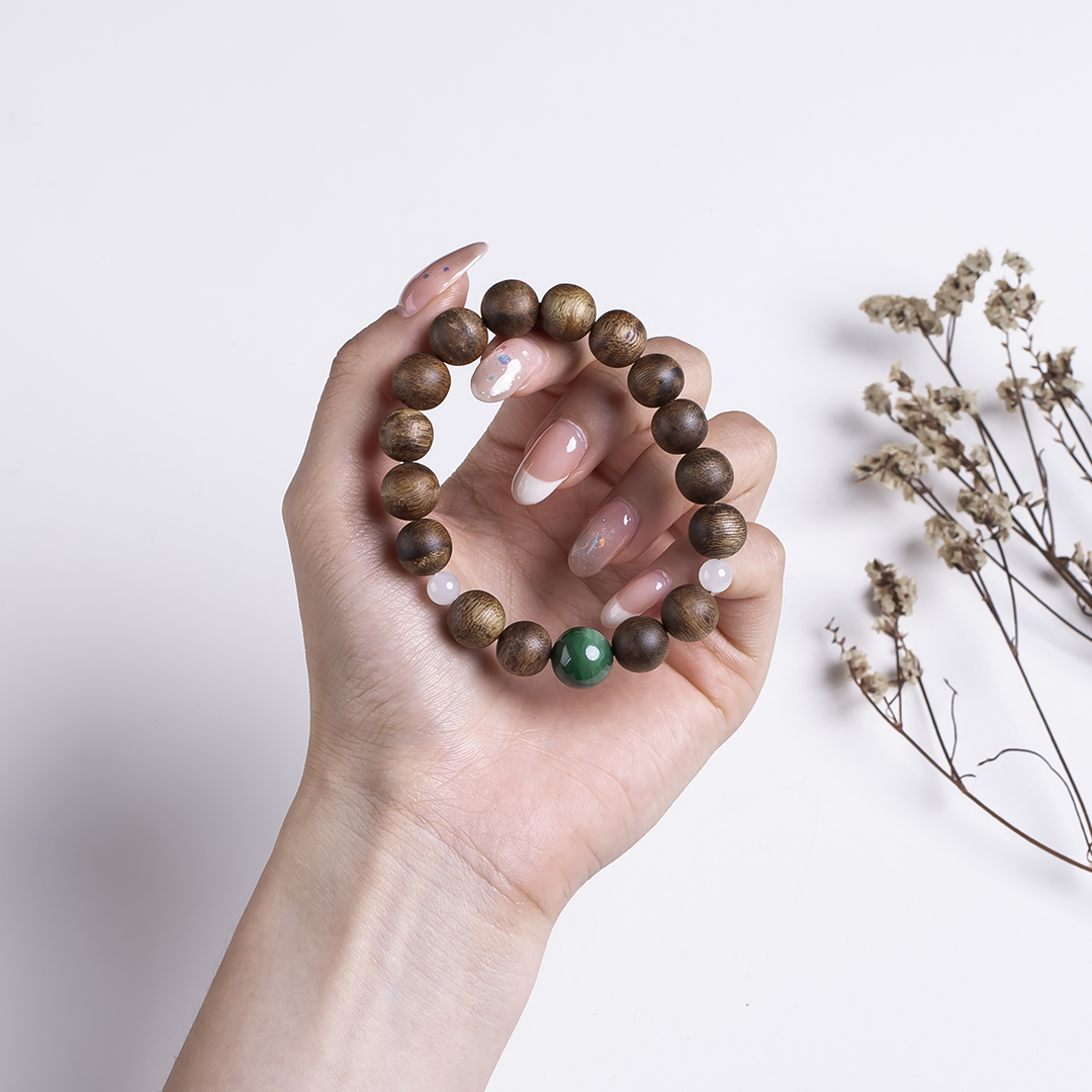 xy0486沉香+碧玉大手串,天然沉香约10.3mm,原色原味,香味自然清甜,一颗碧玉大圆珠搭两颗白玉小珠子,款式简约大方,上手大气。