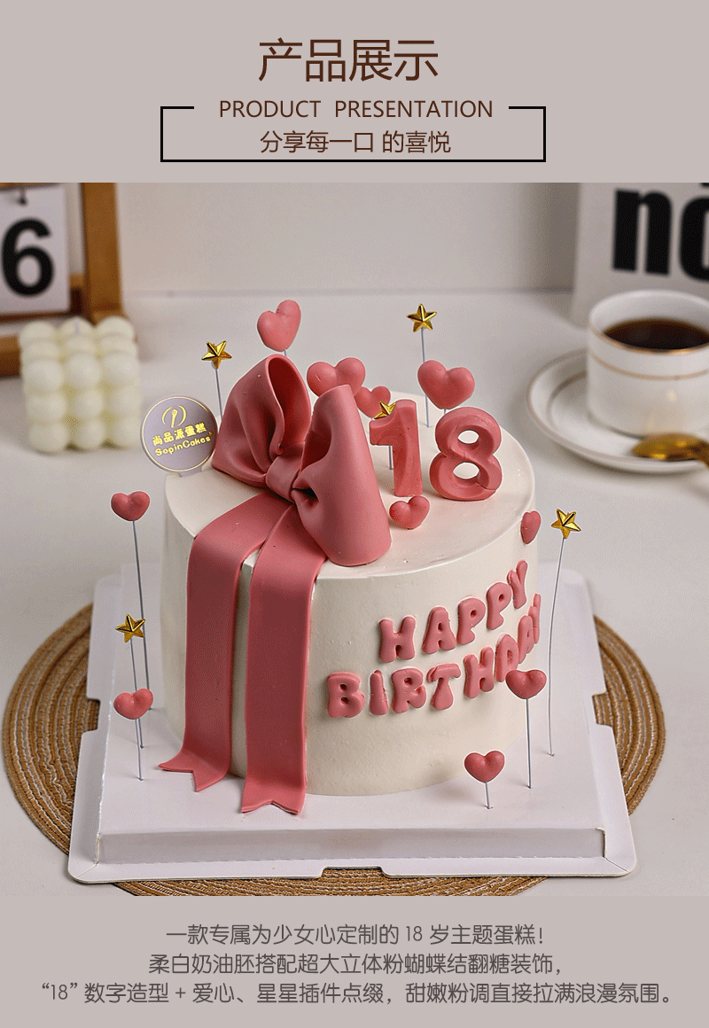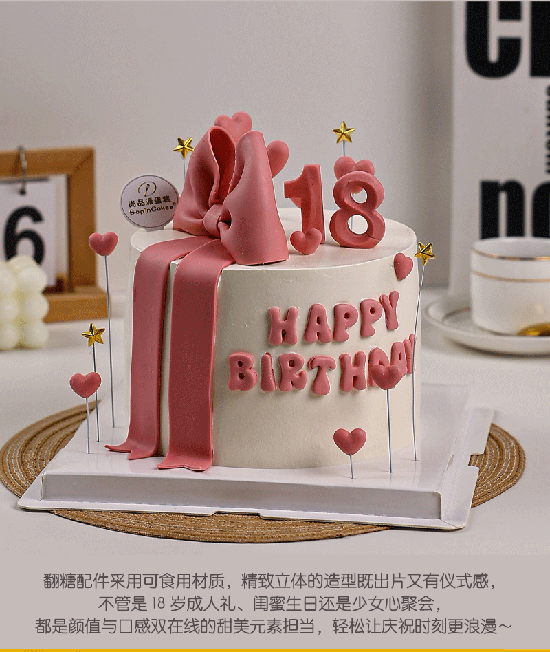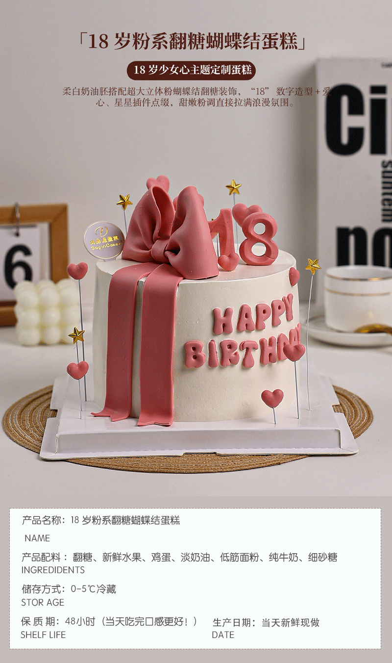 「18 岁粉系翻糖蝴蝶结鲜果蛋糕」,专属为少女心定制的 18 岁主题蛋糕【惠州】
