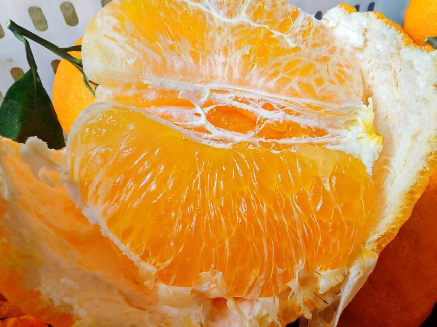 丑柑、不知火、丑八怪,其实都是一种,名字很多,所以一定要记清哦。丑橘是由日本农水省园艺试验场于1972年以清见与中野3号椪柑杂交育成的新品种柑橘,2000年引进四川种植。现在四川丹棱和蒲江是丑橘最大产地。丑橘果型较大,特点是有个凸顶(一般树龄越小越明显,所以也有凸顶不明显),果皮呈金黄色,果面粗糙,易剥皮,无核或少核。丑橘可花果同株,两代同堂,一年而生。丑柑3、4月开始开花,10月上旬开始着色,12月上旬完全着色,次年1月开始上市,一直到4月底下市。到3、4月又同时结果。品质好的丑橘生长期超过一年,所以越晚上市的丑橘越甜,糖度可达13-16度。丑橘果肉丰盈多汁,多吃不上火,健康又营养。