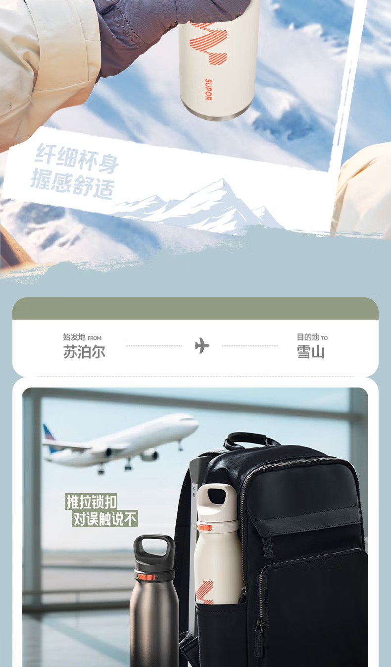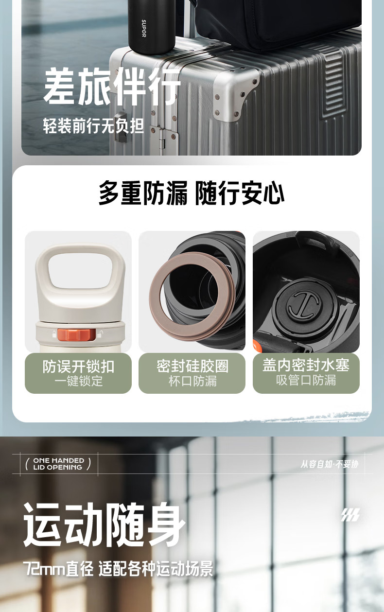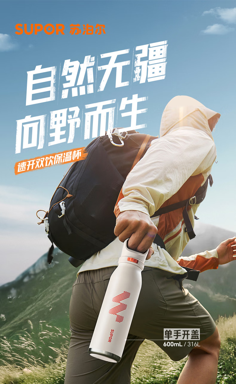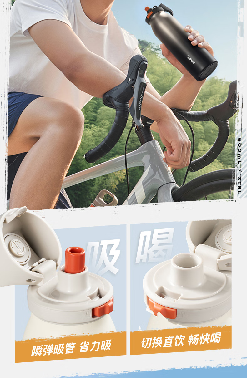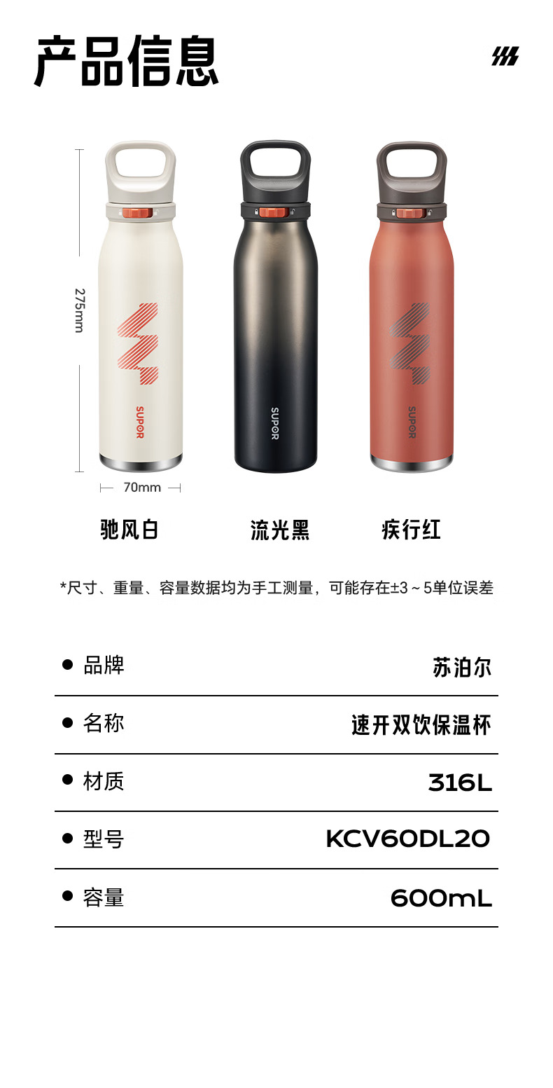 SUPOR苏泊尔保温杯男士大容量水杯不锈钢运动户外便携学生杯子 KCV60DL20红 600ML