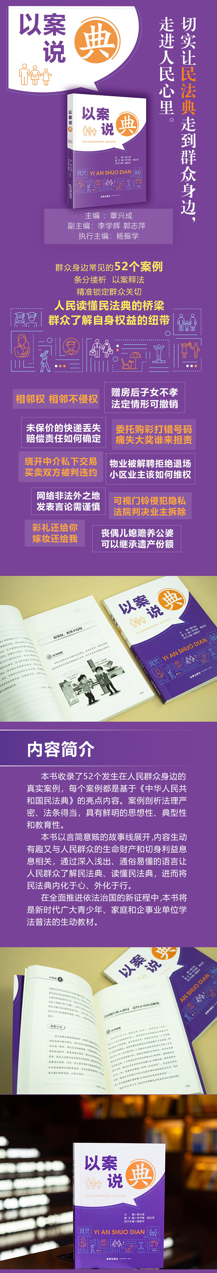本书收录了52个发生在人民*众身边的真实案例,每个案例都是基于《中华人民共和国民法典》的亮点内容。案例剖析法理严密、法条得当,具有鲜明的思想性、典型性和教育性。
