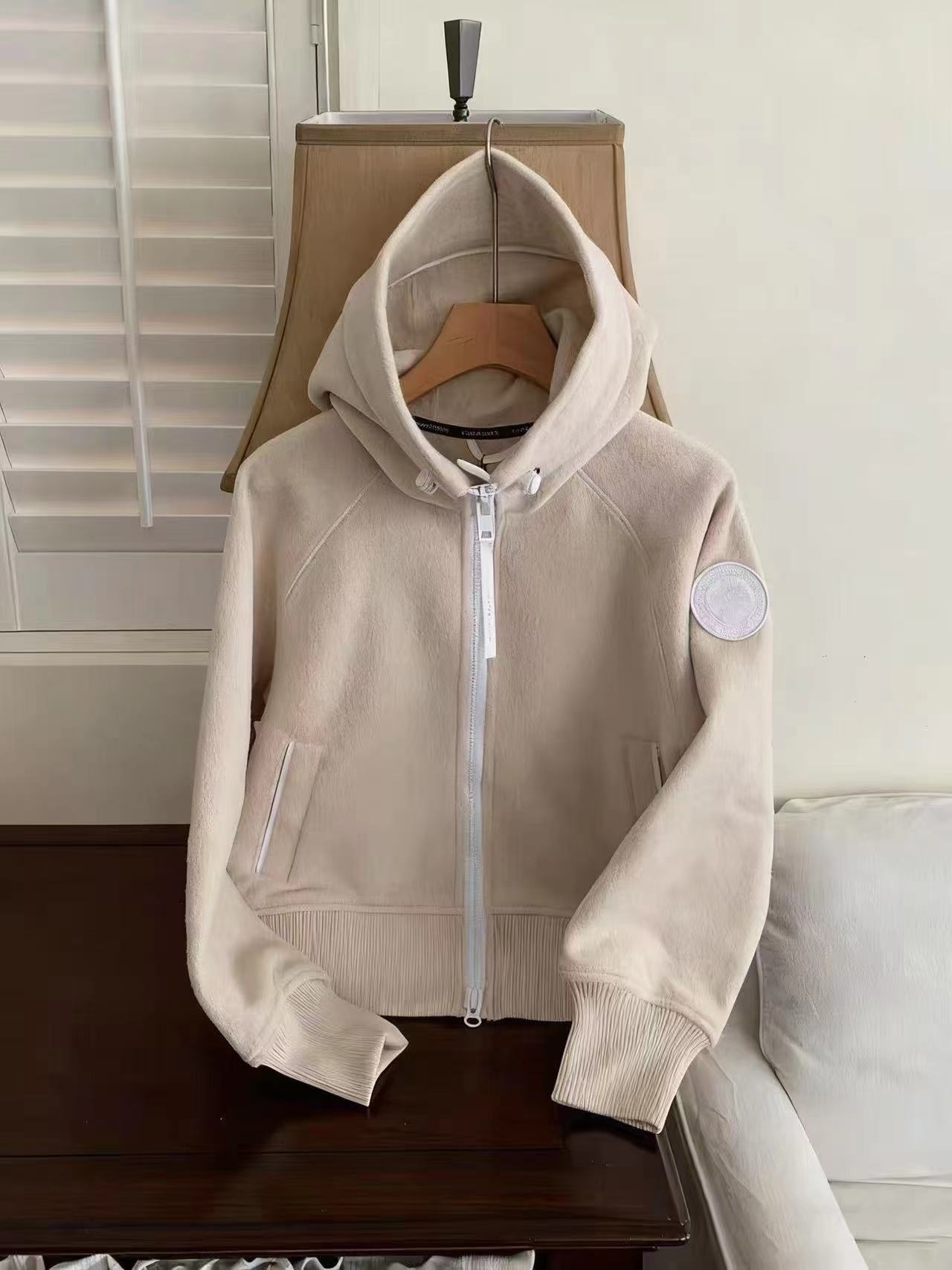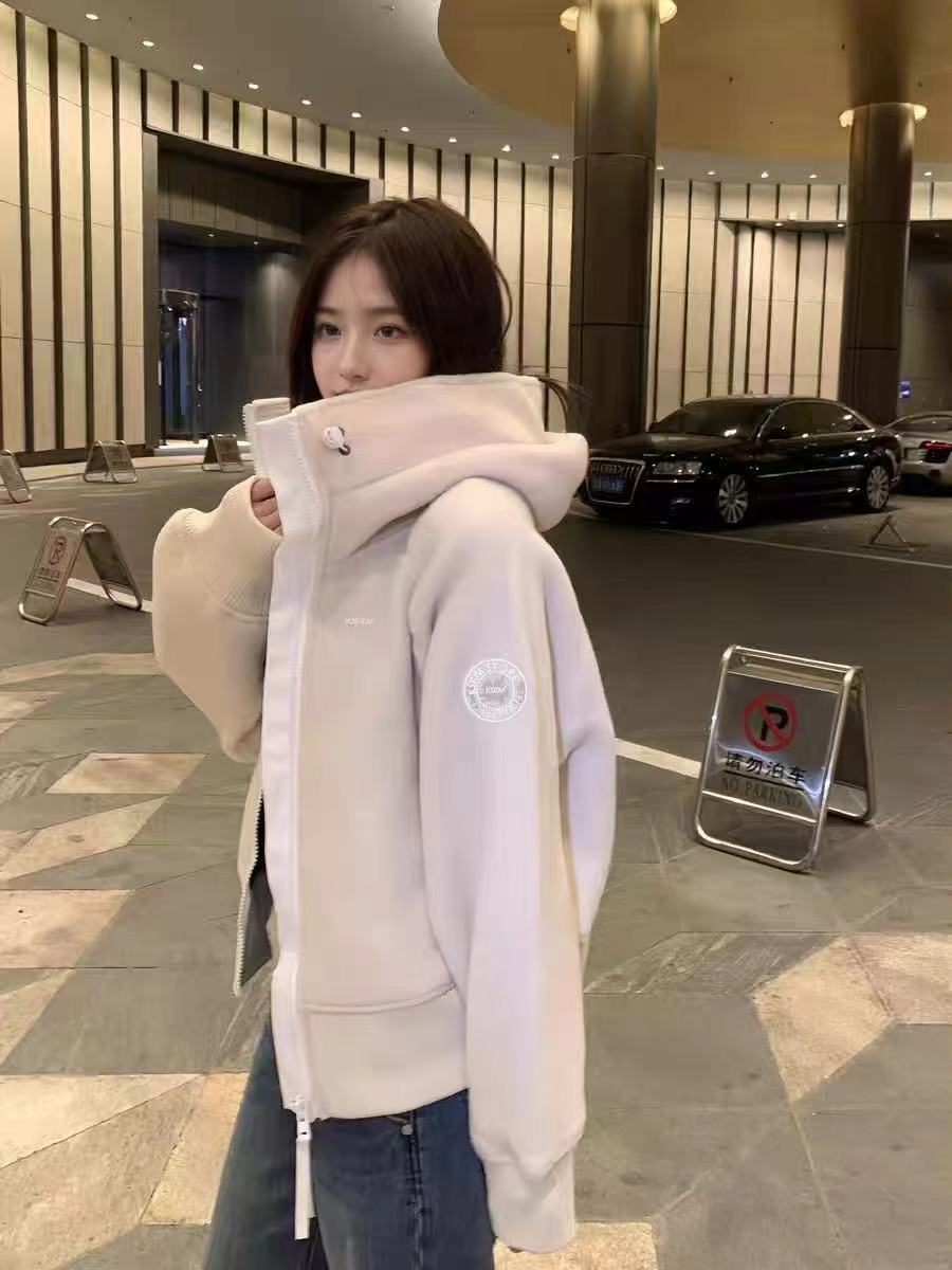 细节2:兜帽设计与松紧扣的搭配提升穿戴时的保暖度与防风性能。辅料:定制弹性抽绳松紧扣定制拉链吊坠定制臂章