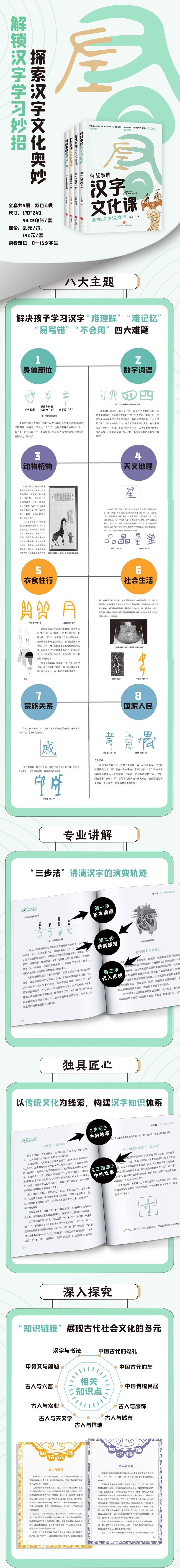 《有故事的汉字文化课》是著名学者、作家王弘治老师,专为中小学生讲读汉字文化的读本,包含4册60篇内容。本套书以汉字为源头串起博大精深的中国古代文化,涉及“身体部位”“动物植物”“天文地理”“衣食住行”“数字词语”“社会生活”“国家人民”“宗族关系”八大领域。内容以分析文字形体源流为主,穿插解读相关的历史文化背景、典故,带领孩子了解古代社会生活的点点滴滴。作者王弘治是名副其实的文字专家,用独具特色“归纳+串讲”的讲述方法,趣味剖析与小学语文紧密相关的汉字,通过串讲汉字背后的中国故事,深挖汉字之间的密切联系,做到触类旁通, 解决孩子学习汉字难理解、难记忆、易写错、不会用四大难题,对传承中华优秀传统文化起到了积极的引领作用。