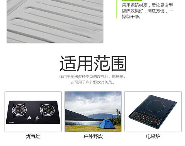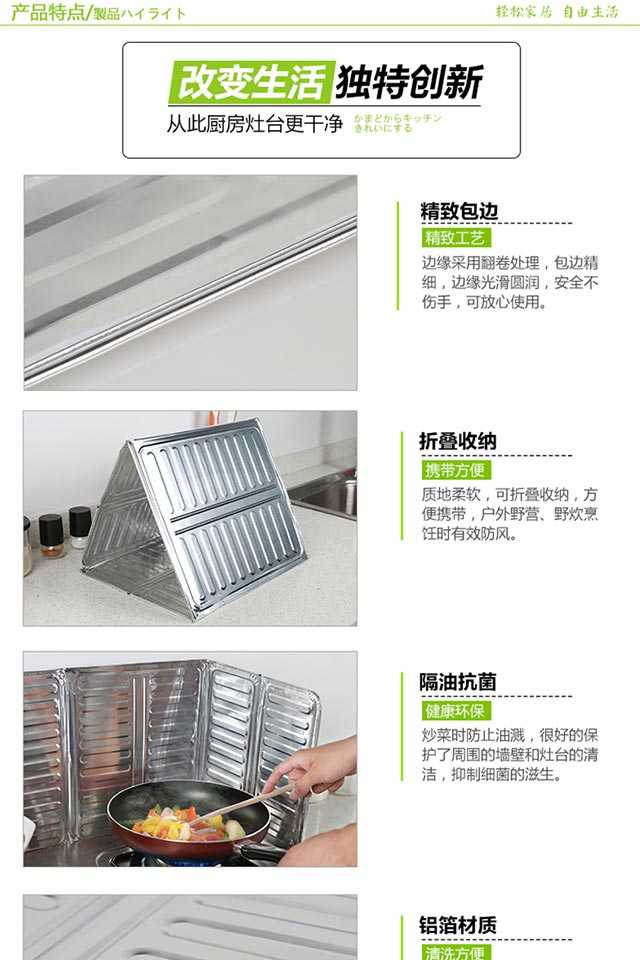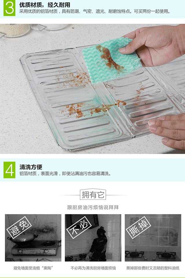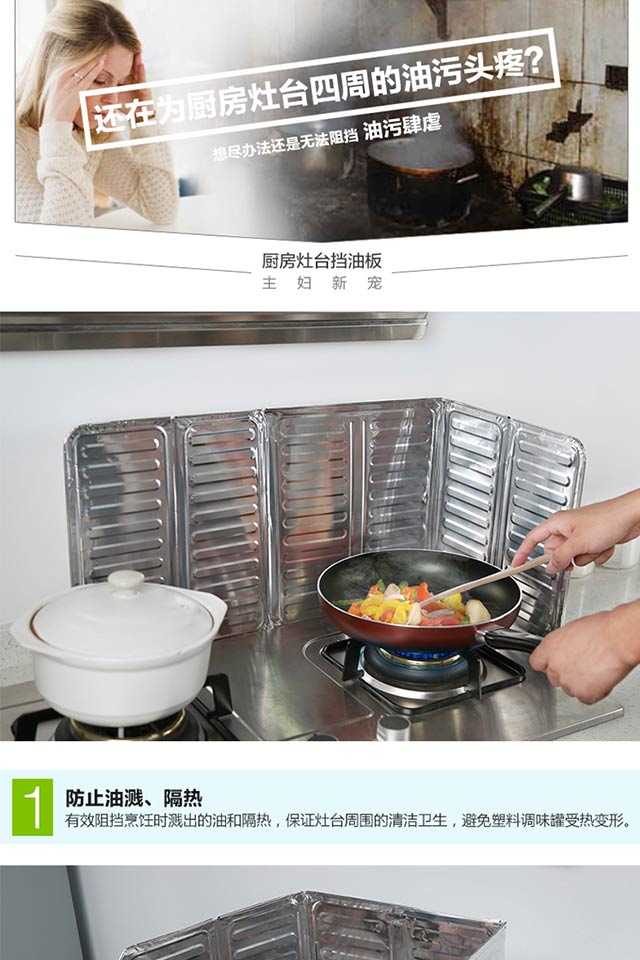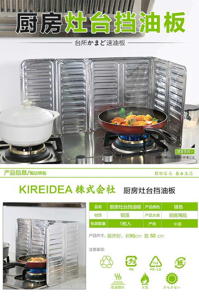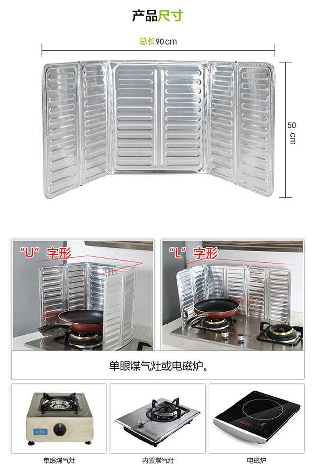 材质:进口铝箔板 尺寸:高50cm*宽90cm可以挡住阻隔烹饪时溅出来的油污染周围及墙壁,铝箔锡板材质,使用时,可根据需要折叠成“同”字型,或者L型。用后,可以折叠收纳。用于厨房内挡溅出来的油和隔热,防止灶台的墙壁沾满油污,周边的塑料调料罐等受热融化、变形。铝质材质,柔软易造型,清洗方便,一擦就干净。建议买 2 张