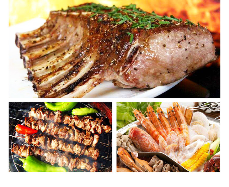 烤羊腿、烤羊排、烤鸡翅、烤羊肉串、烤玉米、烤德国香肠2种、烤秋葵串 、烤虾串、特色烤菠萝;