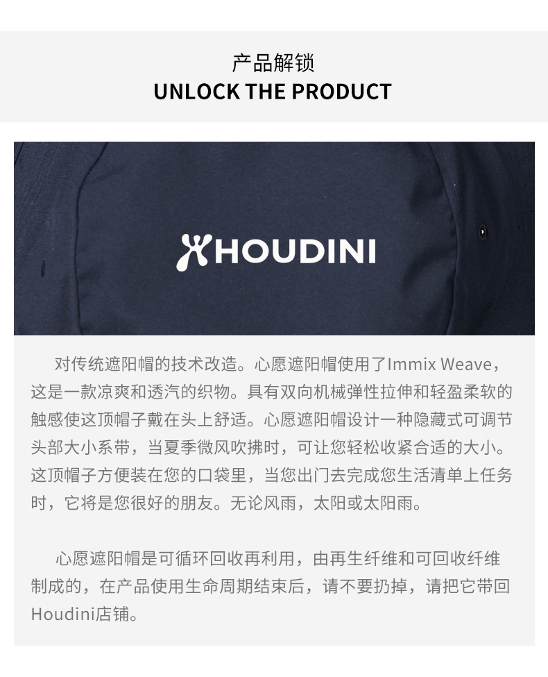 HOUDINI胡丁尼 Bucket List Hat 心愿 男女同款户外速干遮阳帽850017