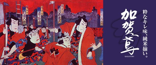江戸の昔、加賀藩お抱えの大名火消し加賀鳶は、面たくましく、力あくまでも強く、火消しの技と、喧嘩早さは天下一品。賑々しくも勇ましく、粋な集団として江戸八百八町の人気をさらっていました。そんな加賀鳶の粋の良さを表現したのが、歌舞伎の出しもの『盲長屋梅加賀鳶(めくらながやうめがかがとび)』。加賀鳶と江戸の町火消しとのケンカがらみの、江戸の人情や風俗を生き生きと表現した河竹黙阿弥のヒット作です。長半纏に染め抜かれた雲に雷をモチーフにした「加賀鳶」のロゴマークは、加賀鳶連中の心意気と地酒の力強さを表しています。