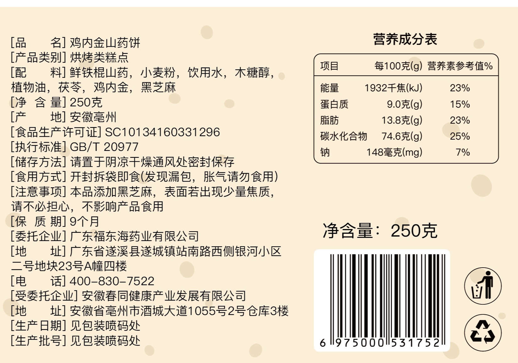 福东海 鸡内金山药饼250克/盒 宝宝健康零食饼干