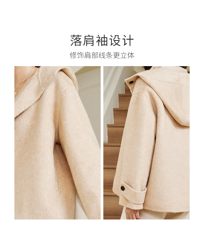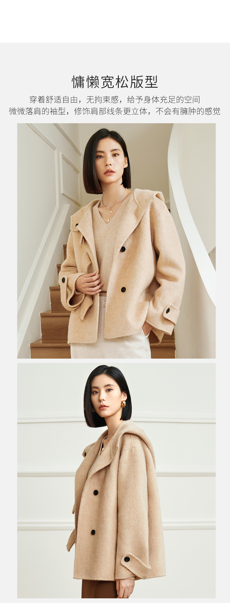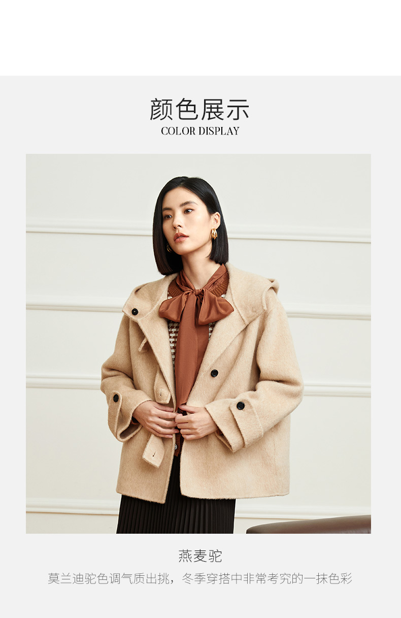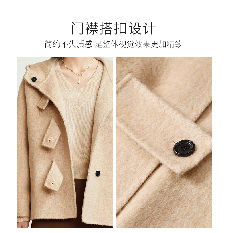 【驼绒】玳莎双面呢短款外套冬季新款驼色连帽一手长毛呢大衣 DD39304