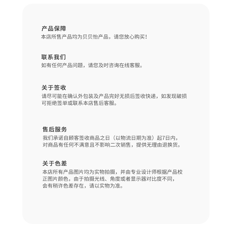 - 贝贝怡专注0-6岁婴幼儿服饰,坚持安全、柔软、舒适的产品理念,为千万中国家庭提供超高品质、安全可靠的婴幼儿服饰产品,妈妈放心,宝宝开心!