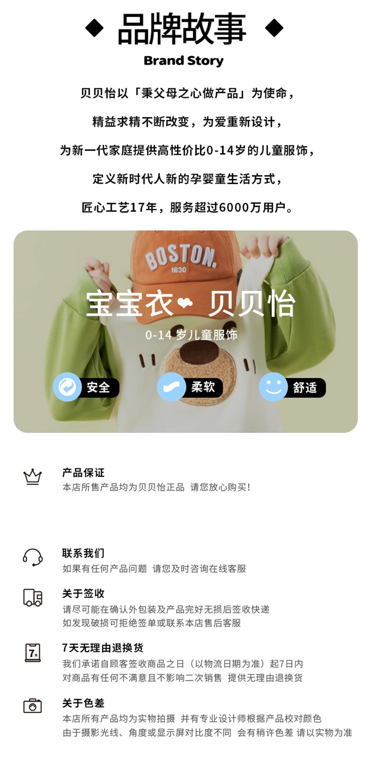 - 贝贝怡专注0-6岁婴幼儿服饰,坚持安全、柔软、舒适的产品理念,为千万中国家庭提供超高品质、安全可靠的婴幼儿服饰产品,妈妈放心,宝宝开心!
