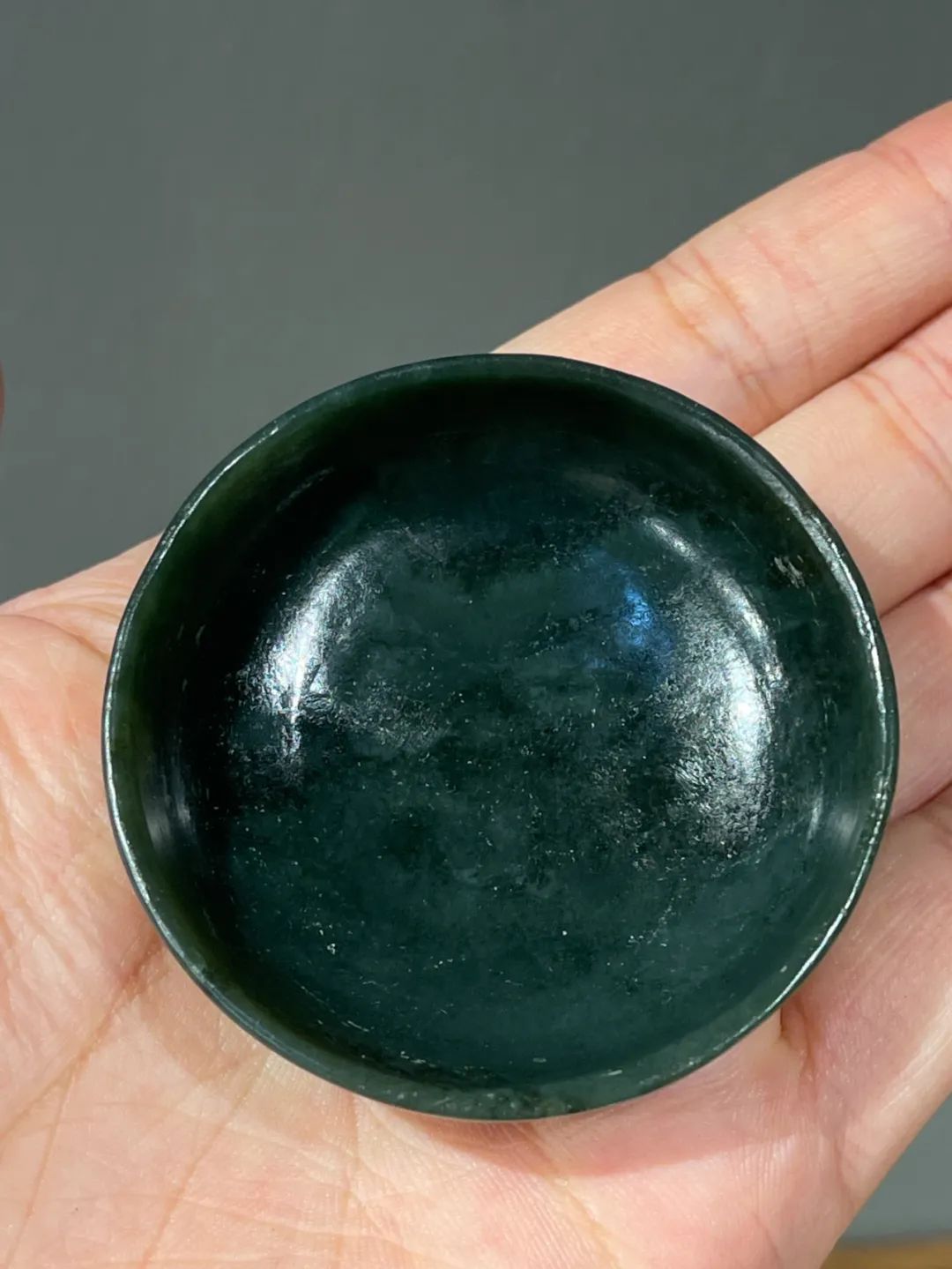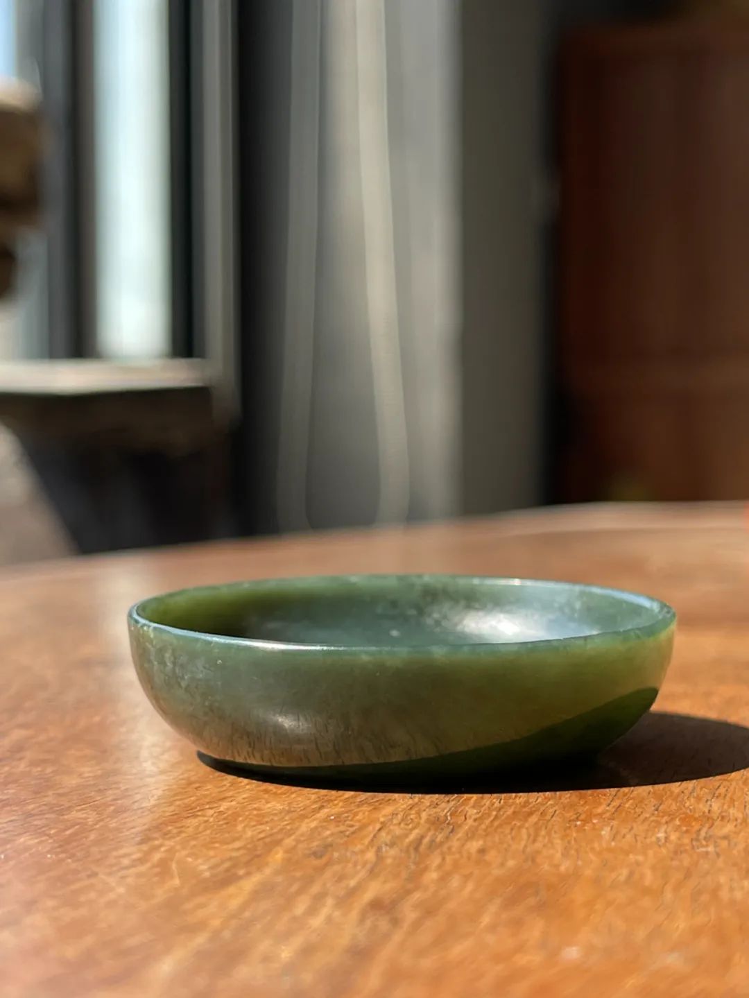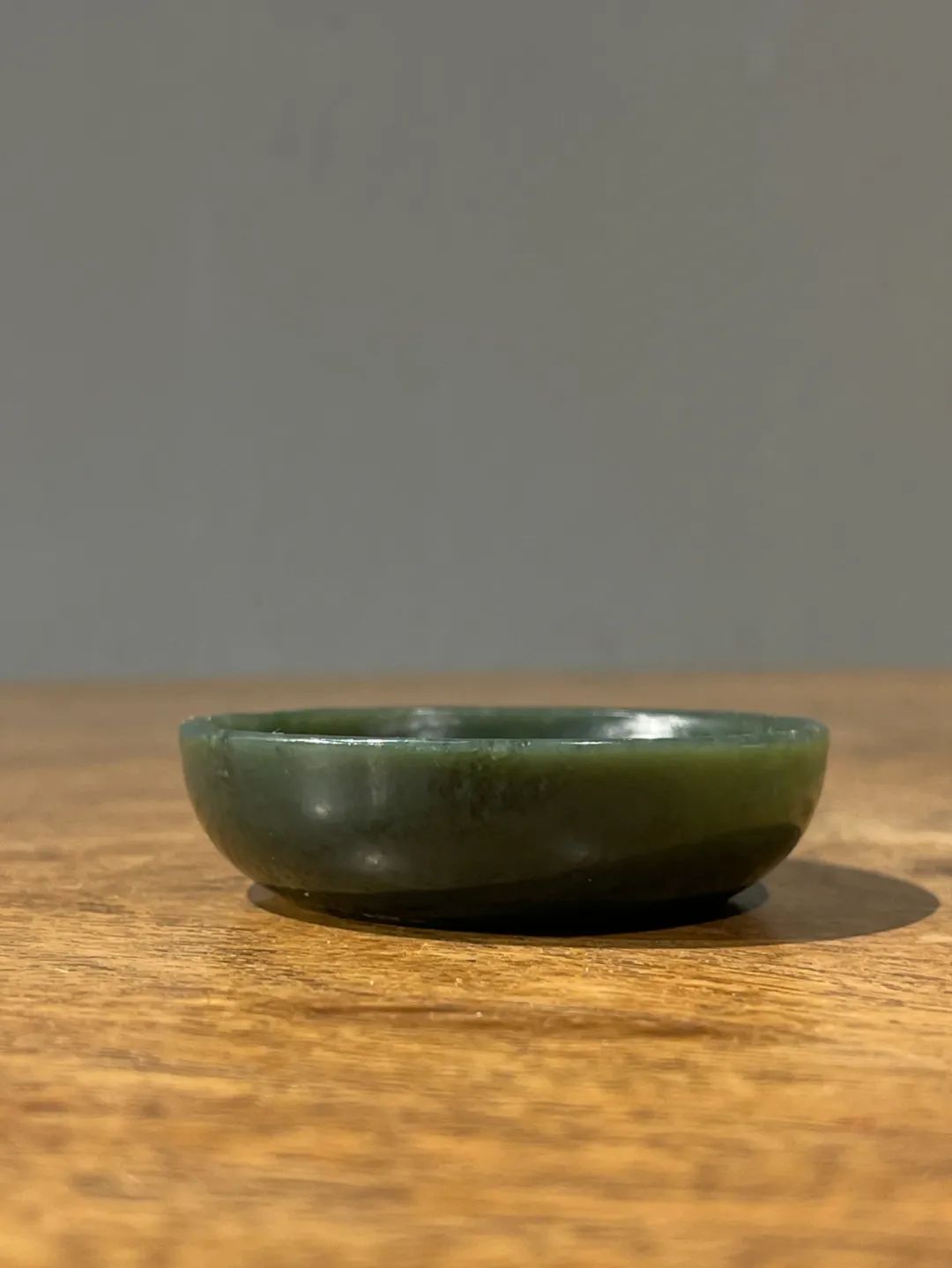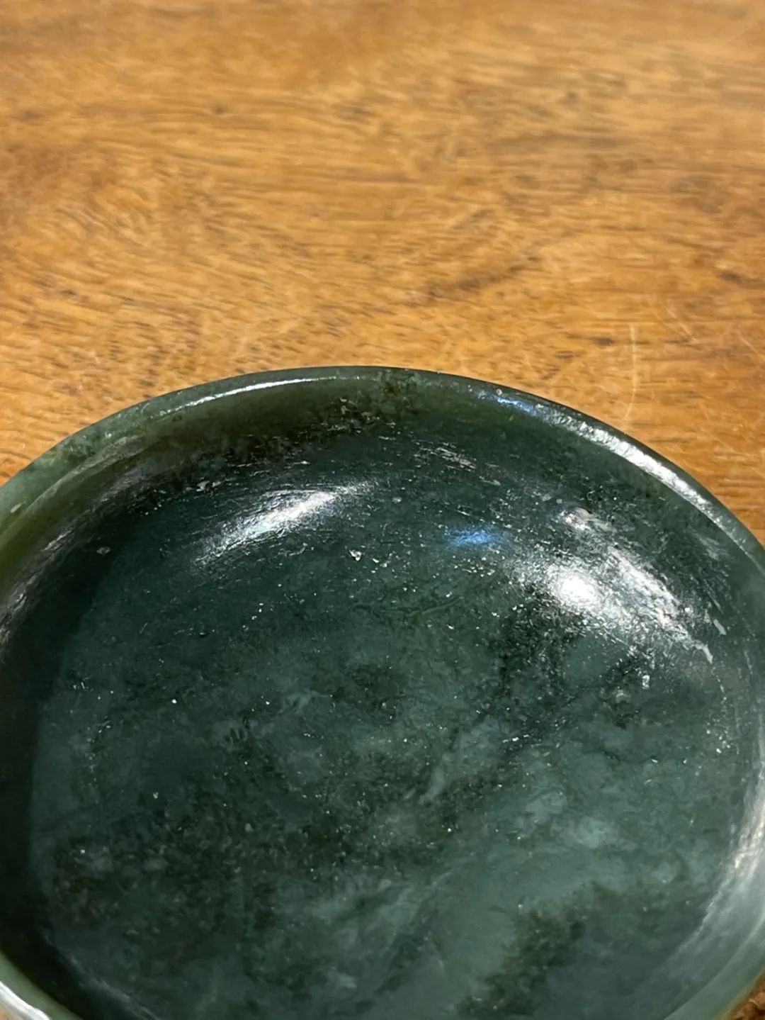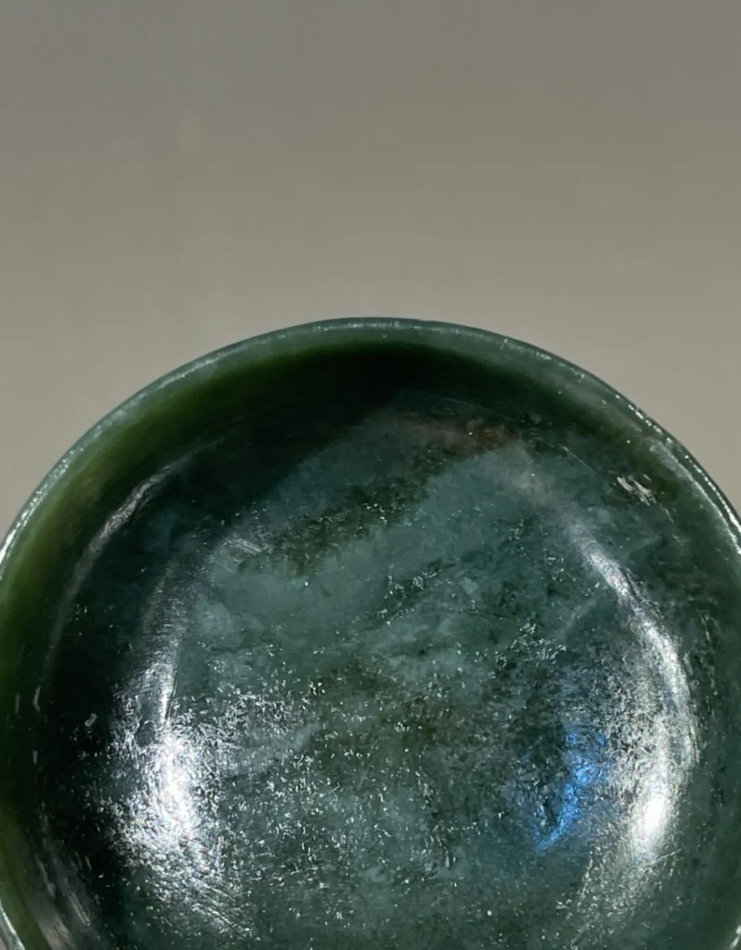 这是一件以和田碧玉掏膛琢磨而成的平底浅碗,取材糯性高的新疆和田碧玉、质地细腻、色泽深绿少瑕疵,质地光亮与温润,强光下透视可见和田碧玉特有的深绿斑点。