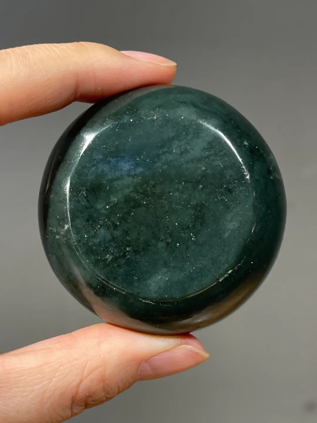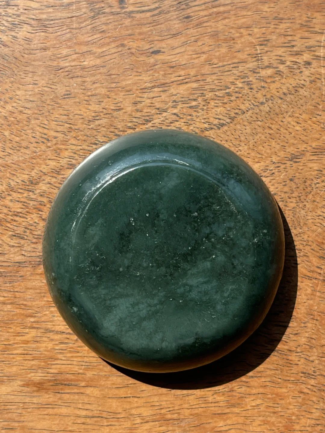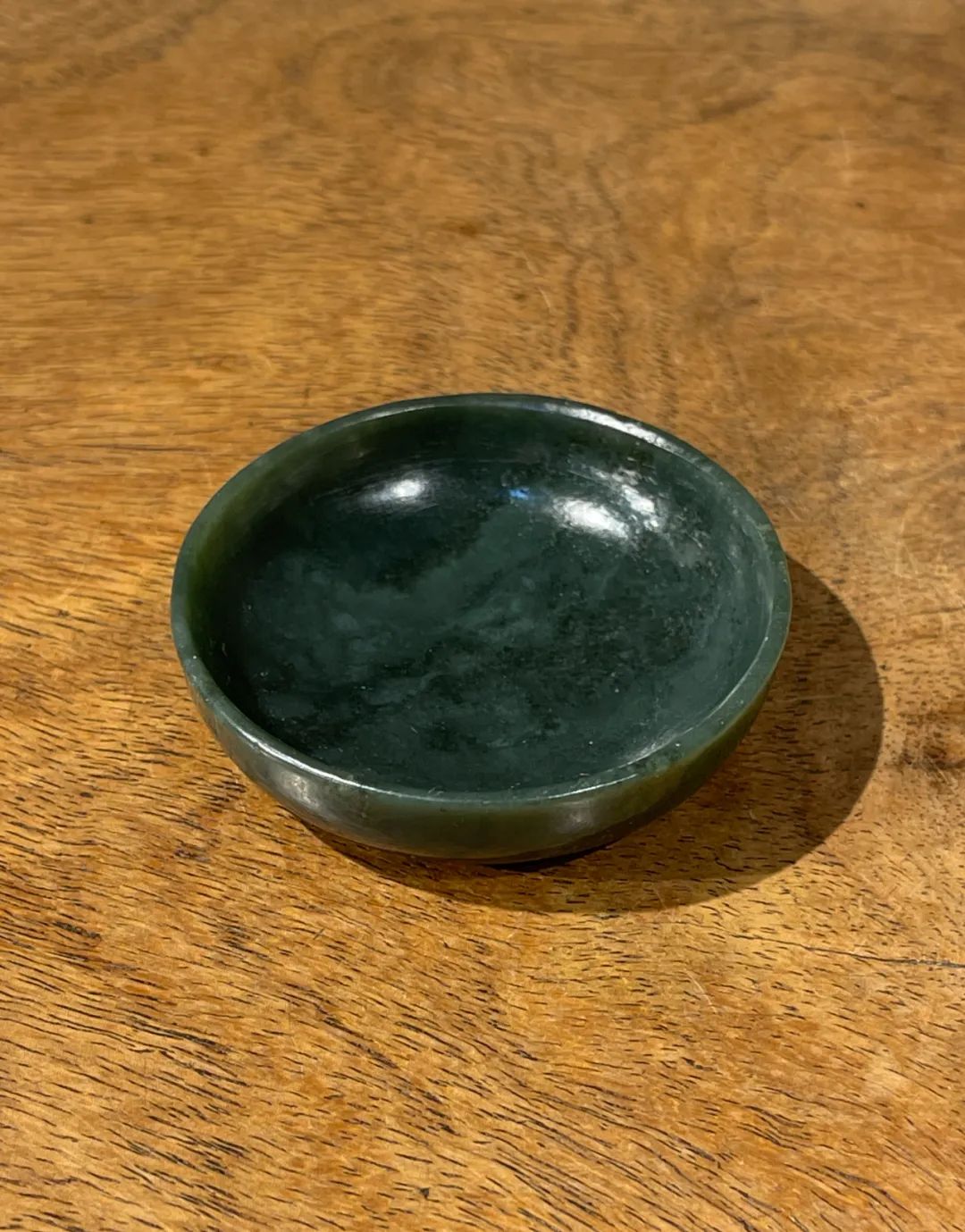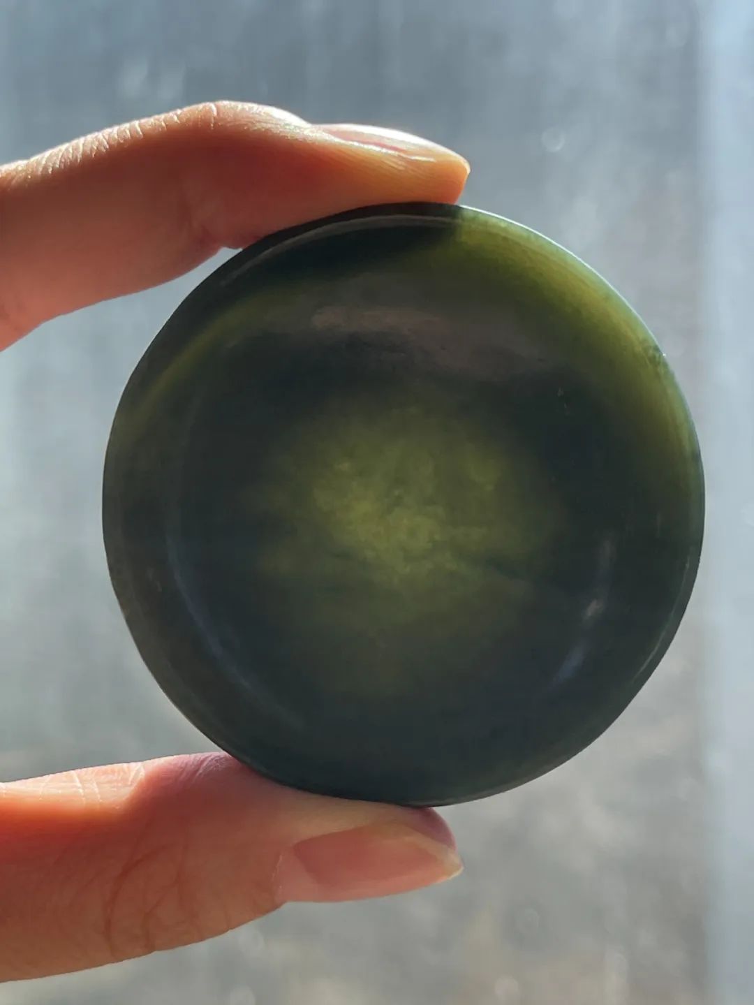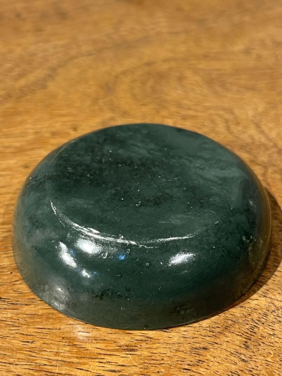 这是一件以和田碧玉掏膛琢磨而成的平底浅碗,取材糯性高的新疆和田碧玉、质地细腻、色泽深绿少瑕疵,质地光亮与温润,强光下透视可见和田碧玉特有的深绿斑点。