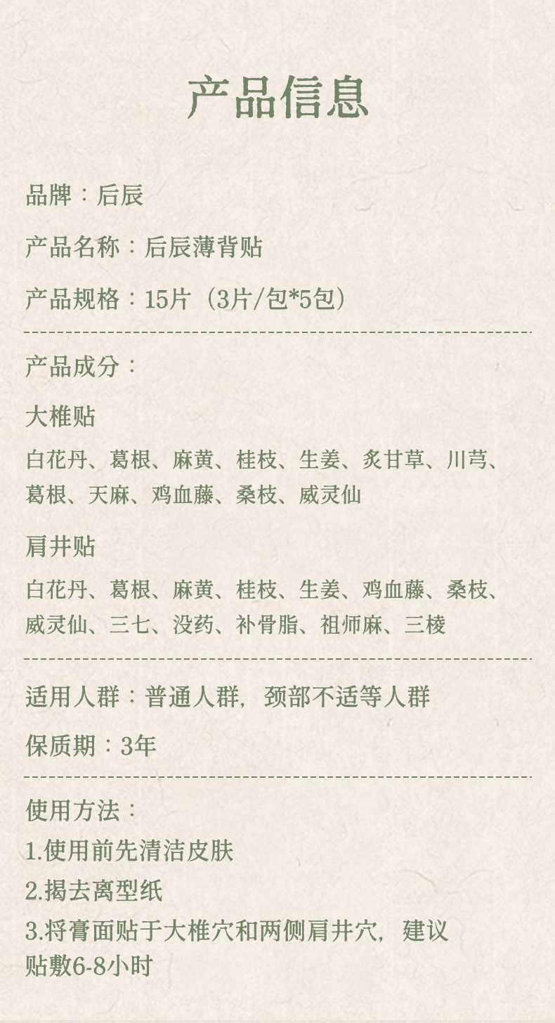 【品名】「送鸸鹋霜小样」后辰薄背贴 15片/袋 【规格】15片/袋(每小袋含3片) 【产地】国内 【保质期】3年 【发货包装】独立包装 【发货地】河南 【发货快递】中通、圆通、申通随机发 【补邮费地区】新疆、西藏+20元 内蒙古、宁夏、甘肃、青海、海南+10元 【发货时效】48-72小时,周末节假日顺延 |