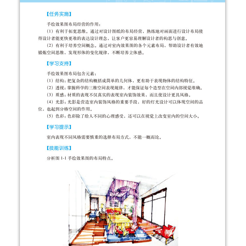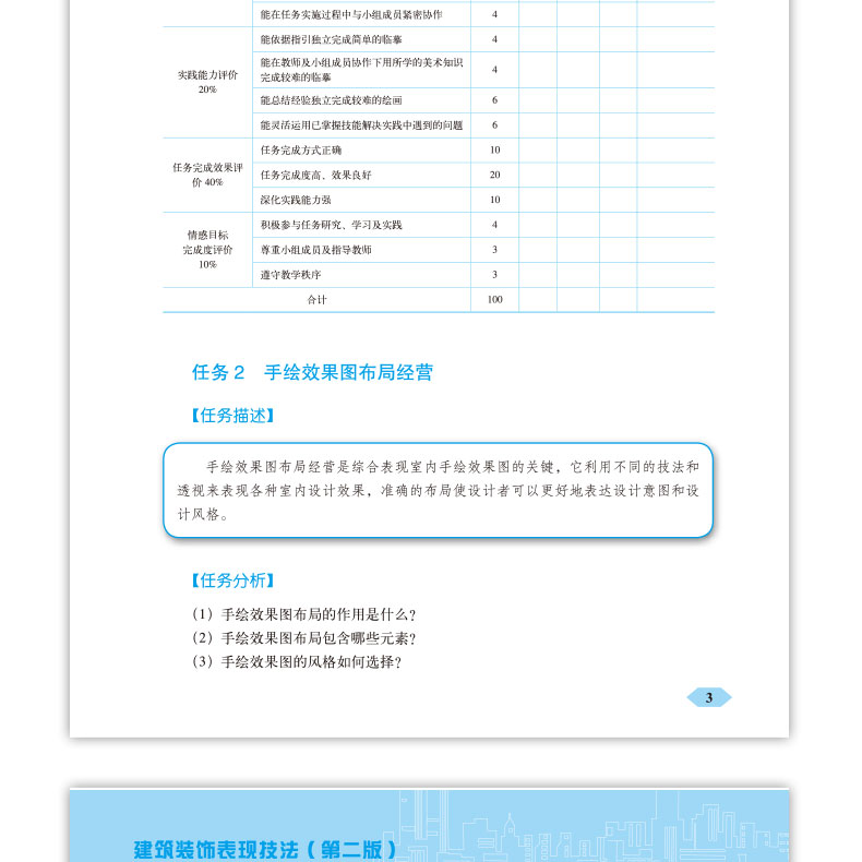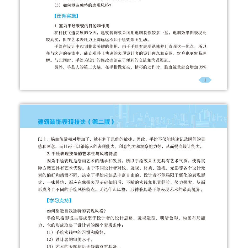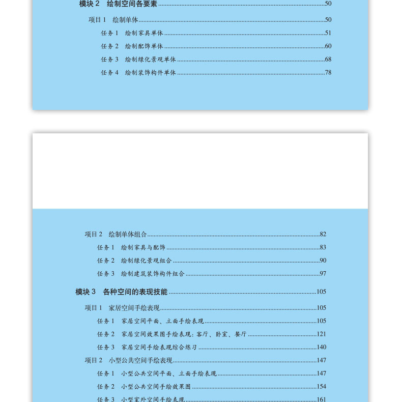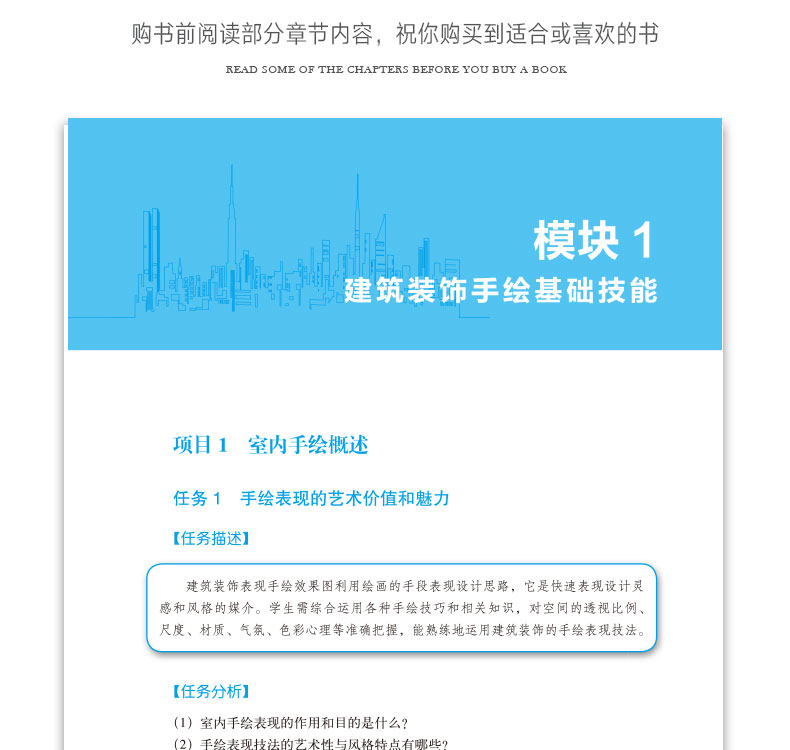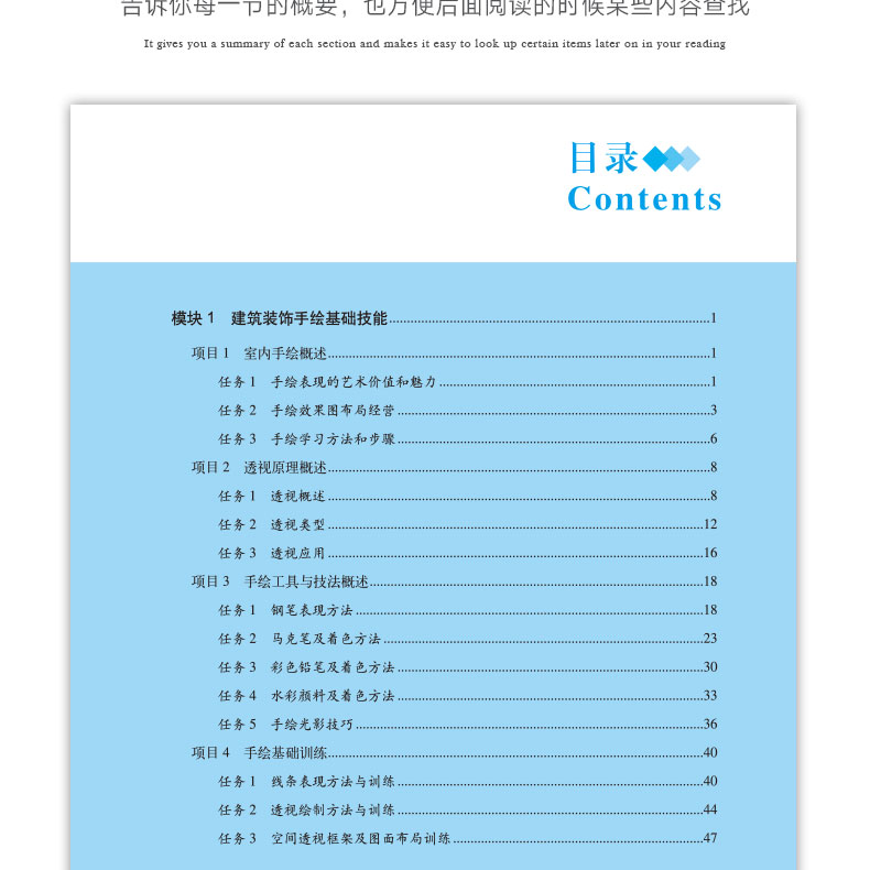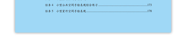 本教材住房和城乡建设部 “十四五”规划教材 “十二五”职业教育国家规划教材 经全国职业教育教材审定委员会审定 住房和城乡建设部中等职业教育建筑施工与建筑装饰专业指导委员会规划推荐教材。为编者结合多年教学实践经验,针对中职院学生的基础和未来发展的需要以及建筑装饰表现技法的特点,内容分为三大模块,第一模块要求学生学完之后,能够掌握手绘的通用美术基础技能;第二模块要求学生运用通用美术的基本技能表现专业空间要素的手绘技能,第三模块要求学生具备通用美术基础和专业手绘基础之后,独立完成一个居室装饰和公共空间装饰项目的手绘。