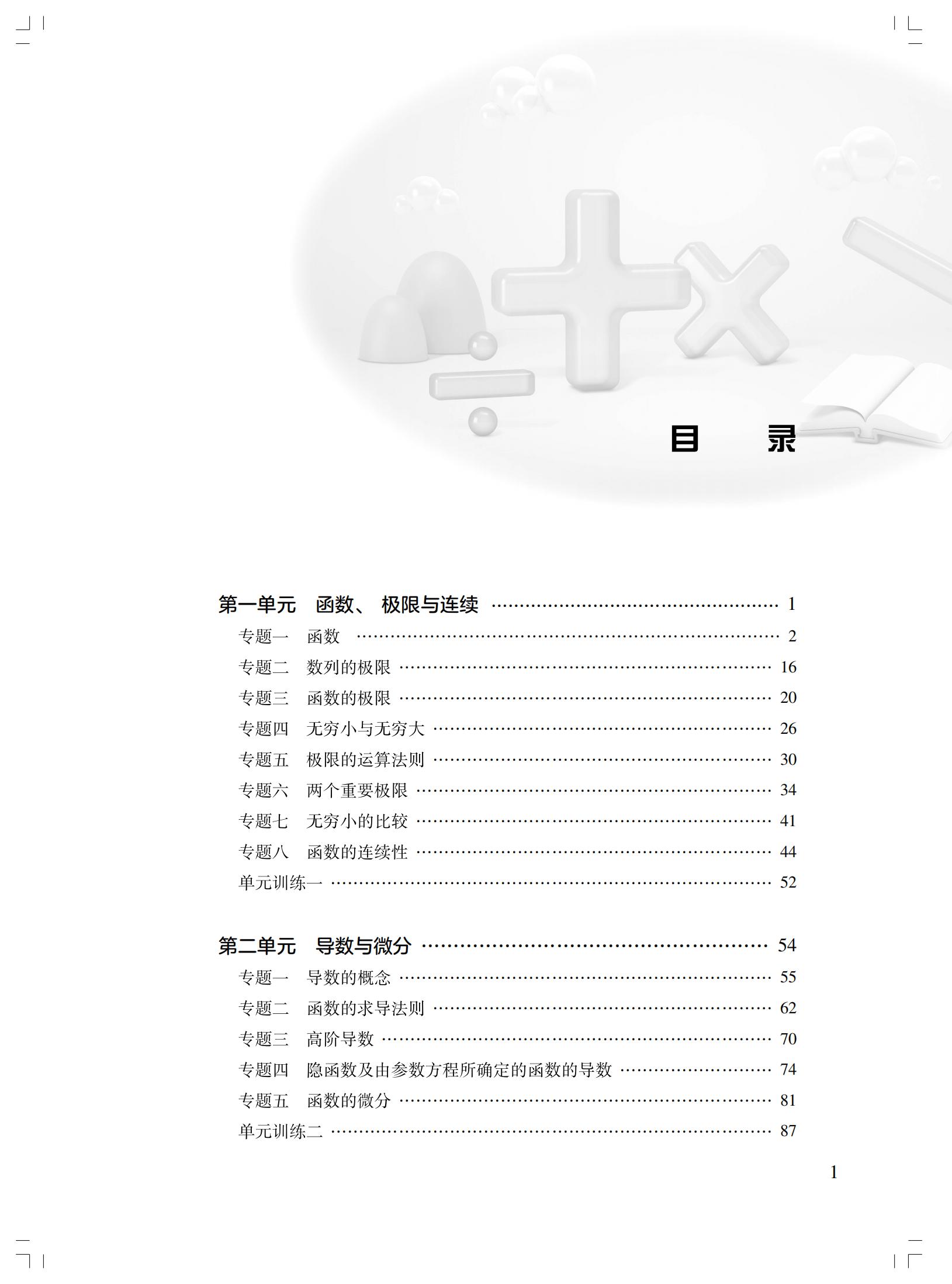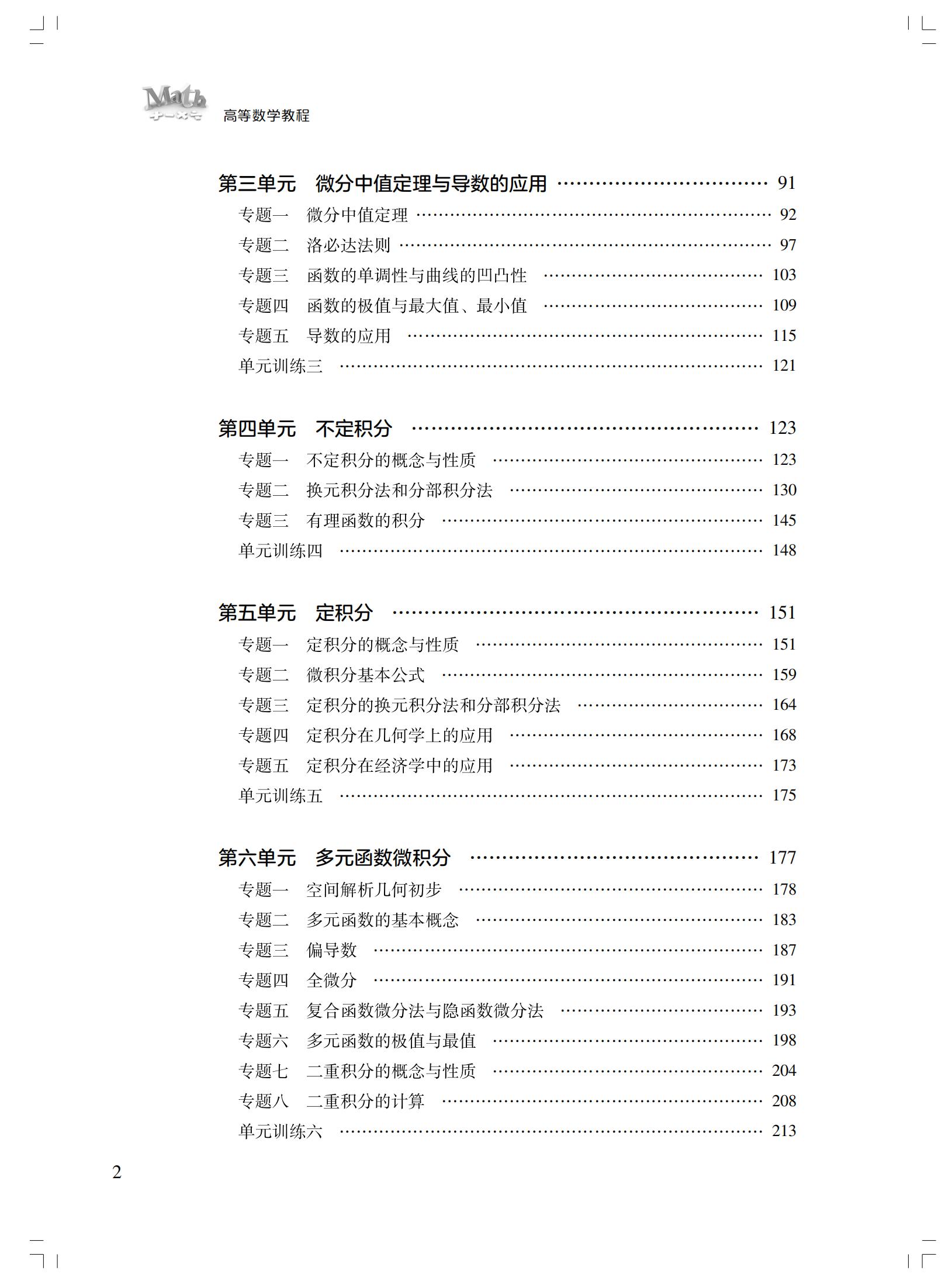本书共分八章,内容包括函数、极限与连续,导数与微分,微分中值与导数的应用,不定积分,定积分,多元函数微积分,无穷级数,常微分方程。每章后配有一定数量的习题。