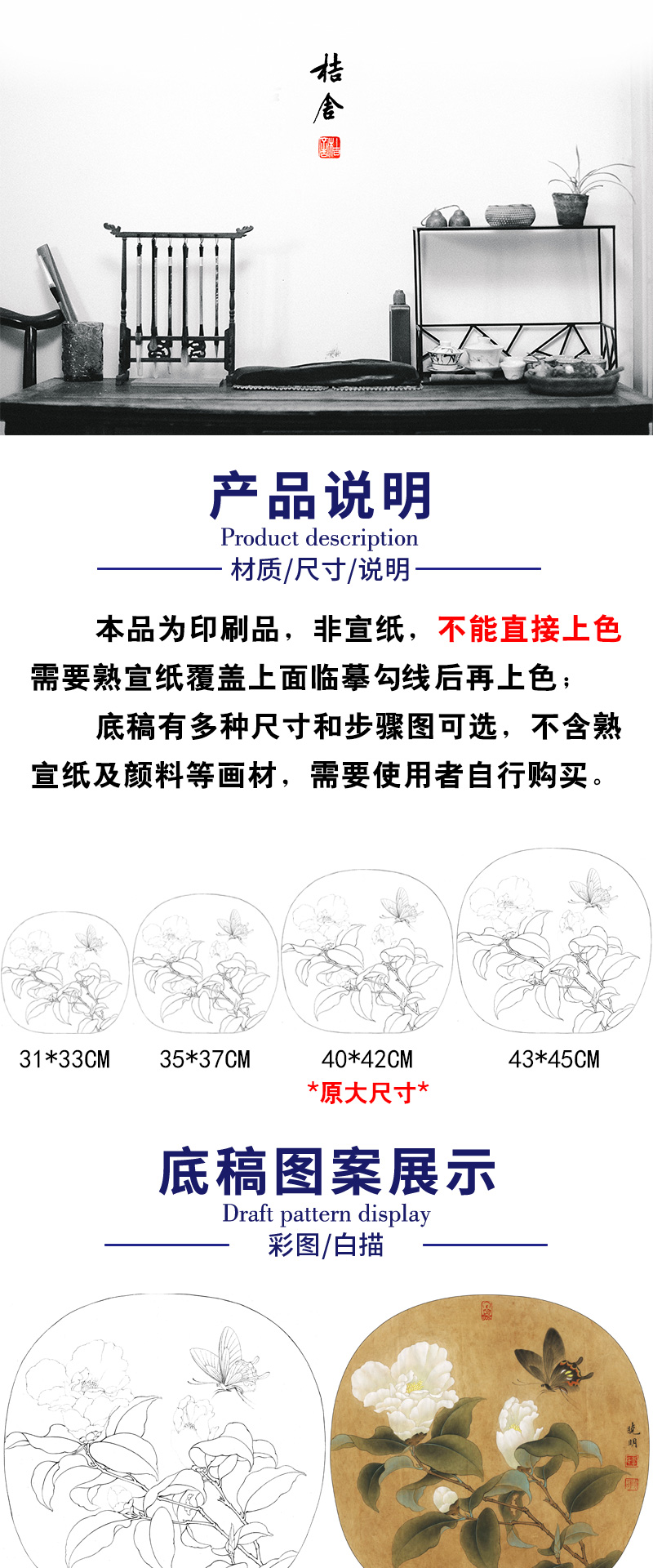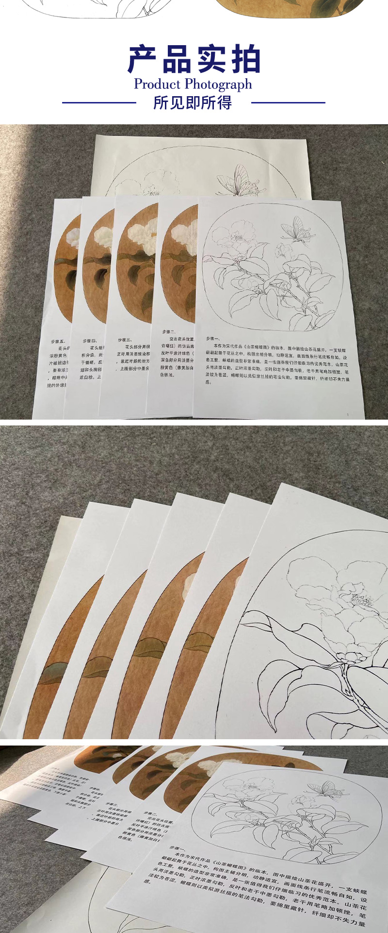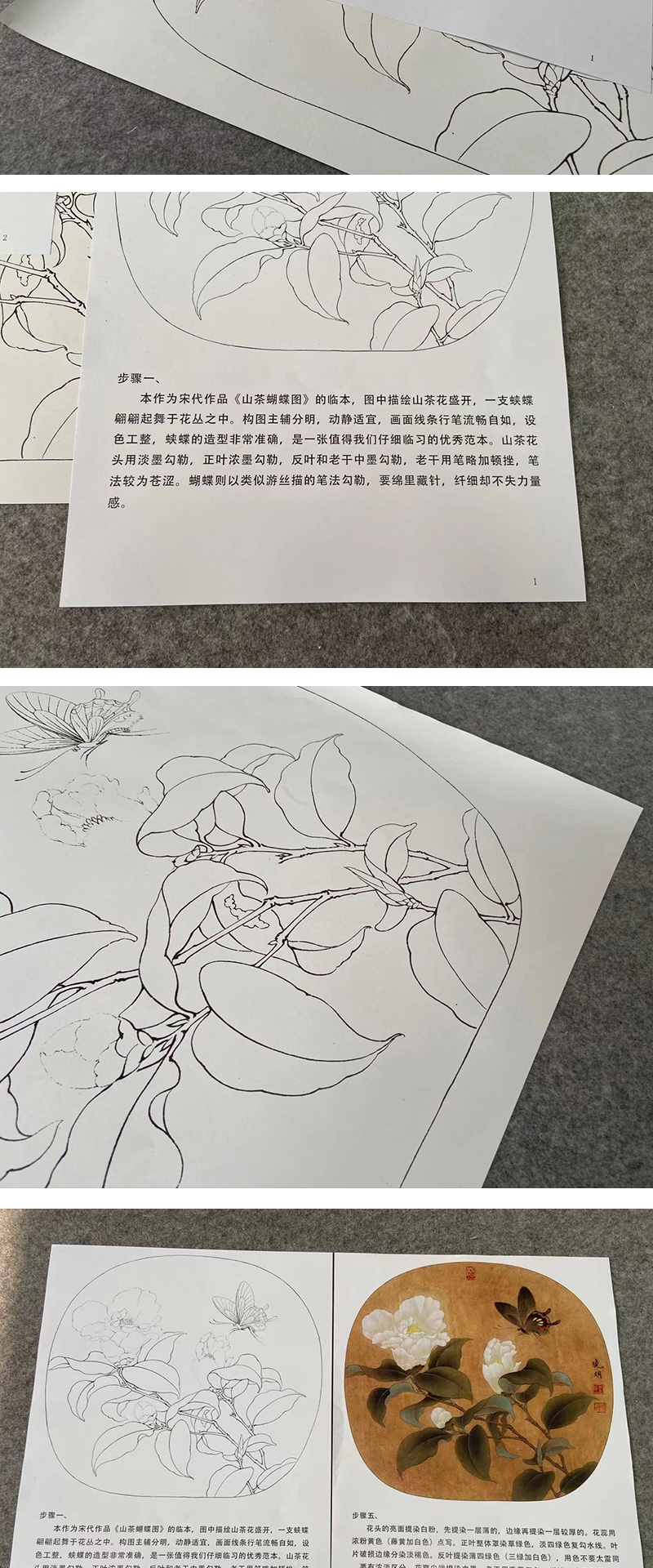 【有步骤、大彩图】李晓明工笔画白描底稿圆形小品《茶花蝴蝶图》初学者临摹花鸟线稿KC01