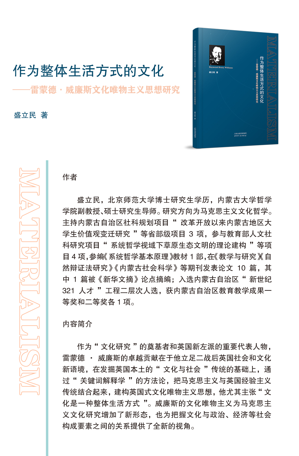 书稿的整体质量较好,作者概括了威廉斯文化唯物主义的核心观点、方法、思想主张及其论证逻辑,同时指出了其研究中存在的民族性、本土性等思想局限,做到了通俗易懂、有理有据。
