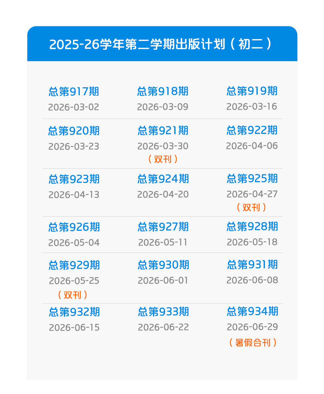 本学期出版计划共包含4期合刊。其中3期为双刊,定价6.4元,出版日期分别为3月30日、4月27日、5月25日;1期为暑假合刊,定价16元,出版日期为6月29日。