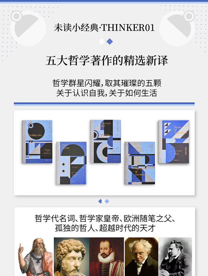 4.精装珍藏,开源之作。装帧时尚而庄重,有别于市场上大多数的公版哲学书,未读小经典·THINKER01仅仅是个开始,还有更多被忽视的经典等待发掘