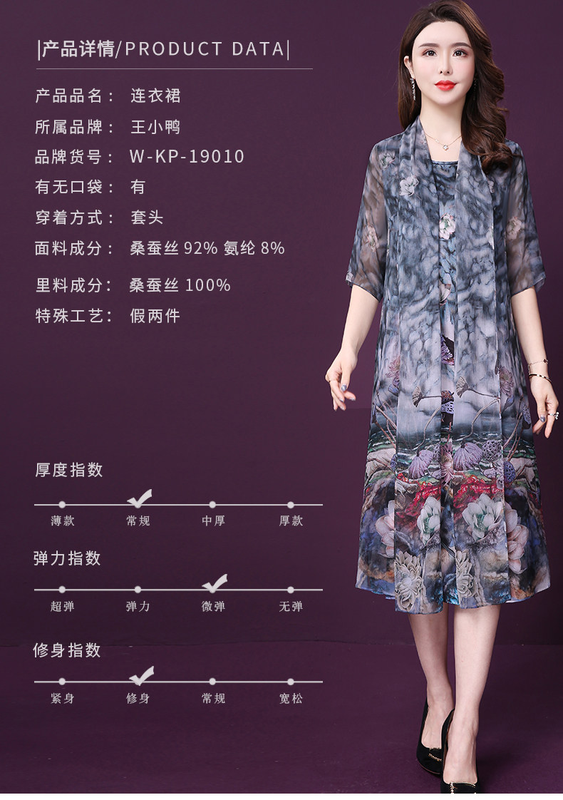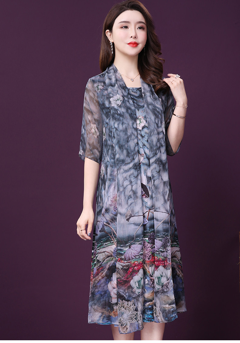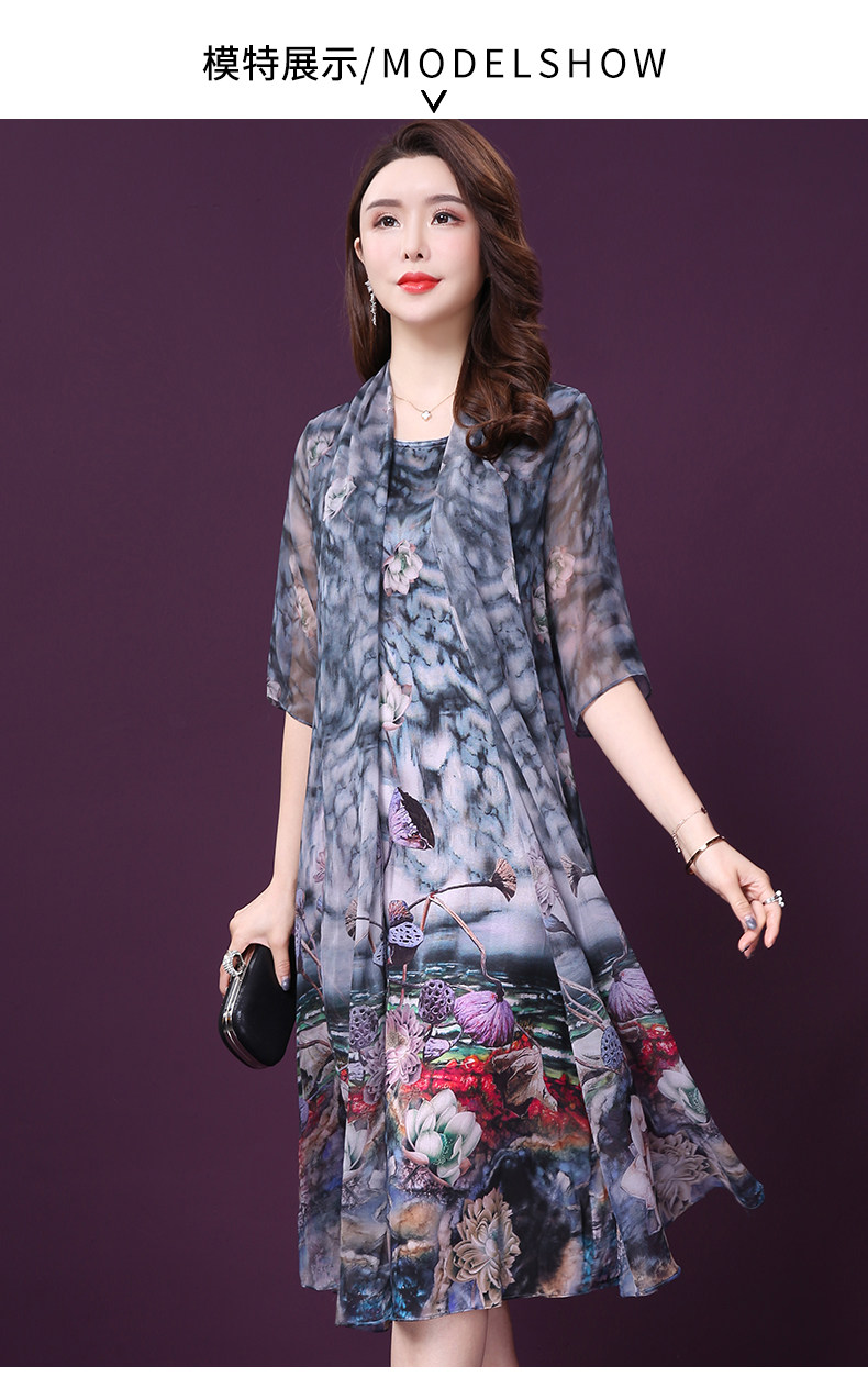 WXY-19010新款假两件五分袖桑蚕丝大码妈妈重磅真丝连衣裙
