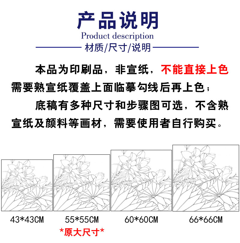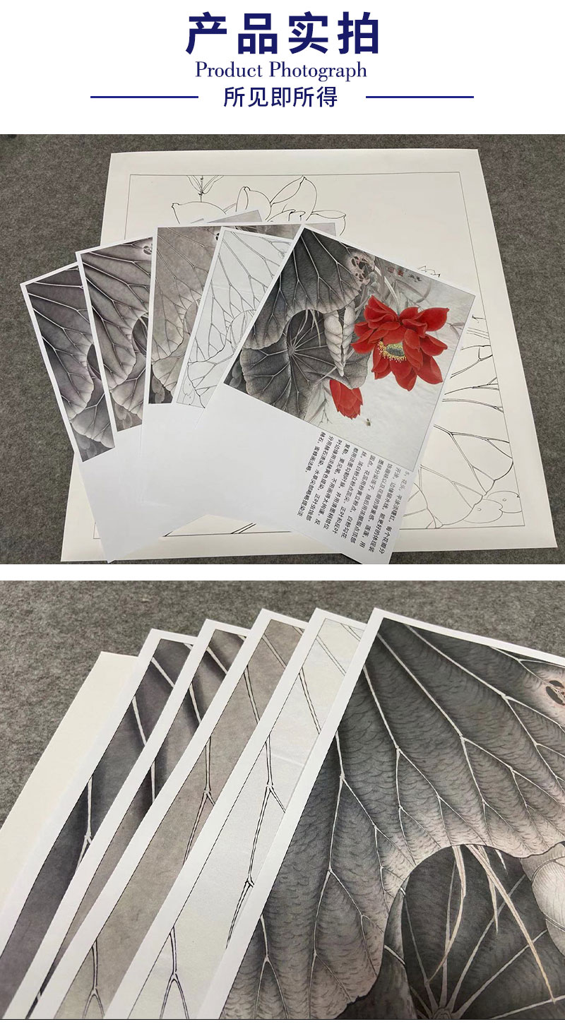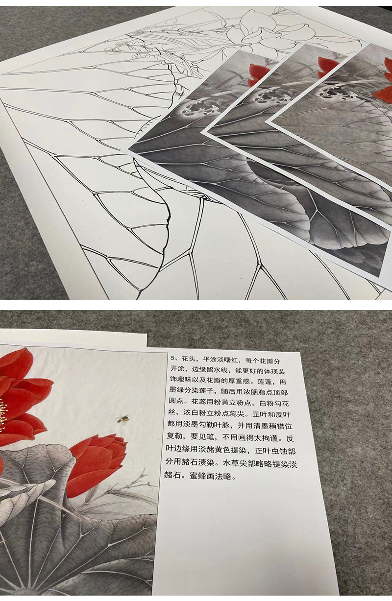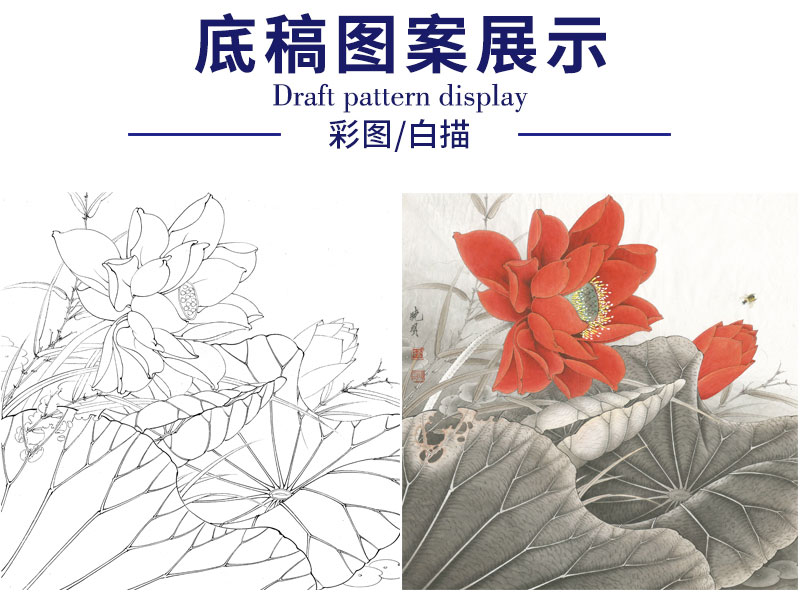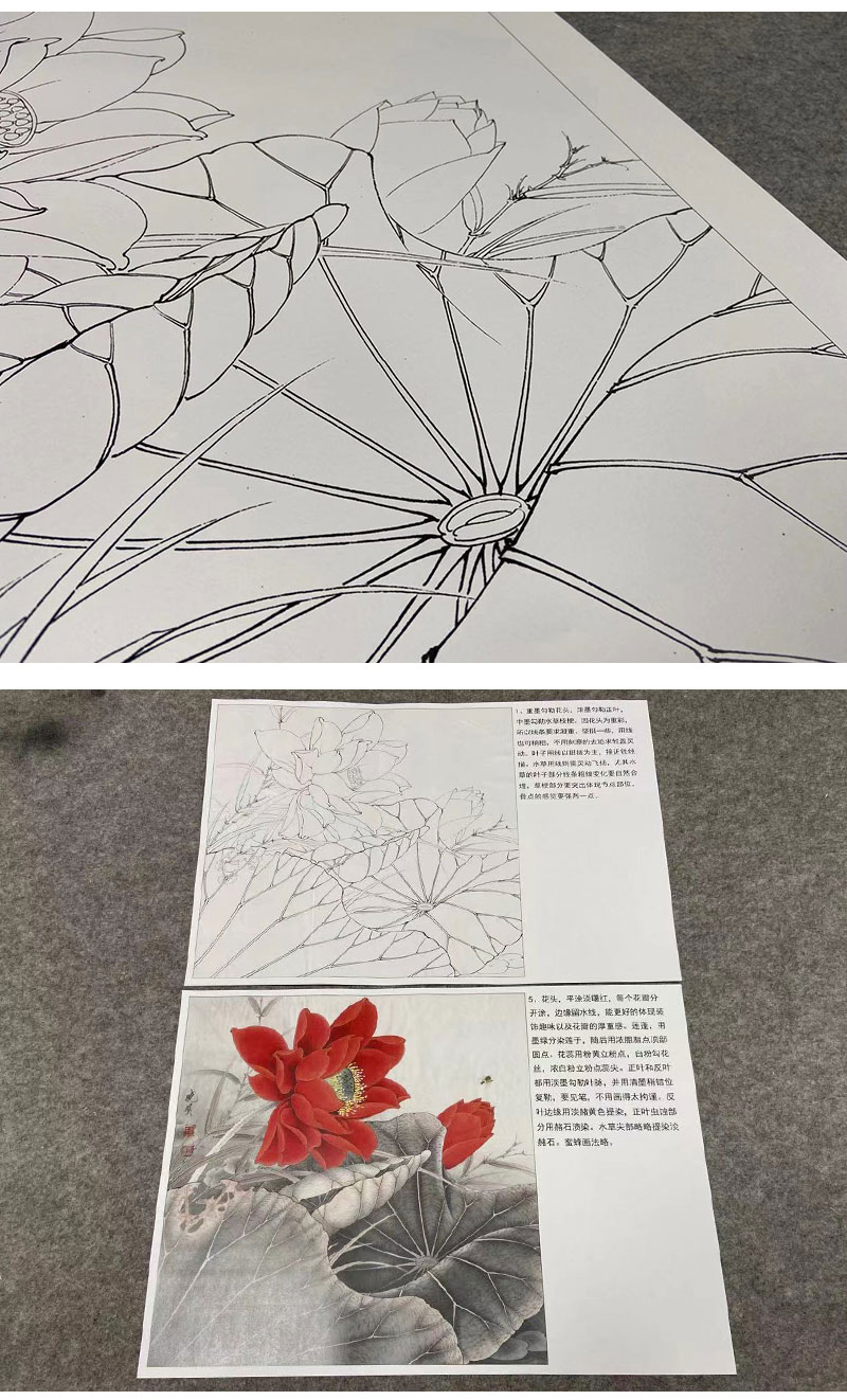 【有步骤、大彩图】李晓明工笔画白描底稿斗方小品《红荷艳阳天》红荷花初学者临摹花鸟线稿KE05