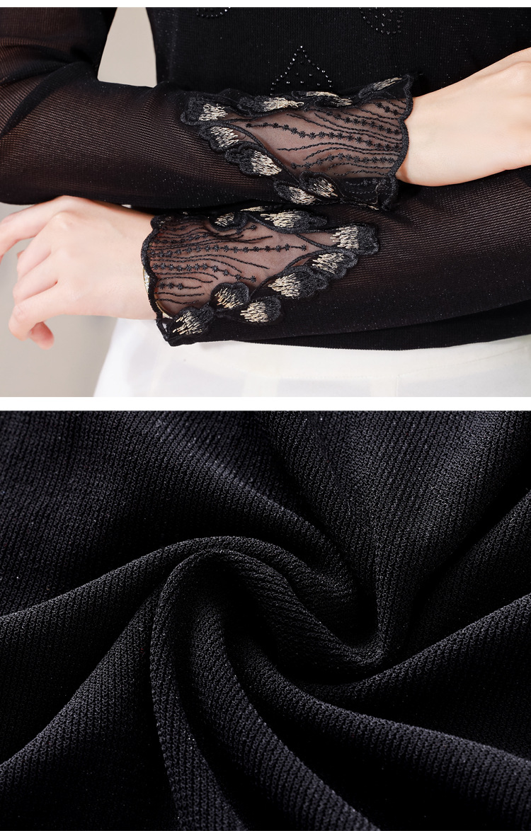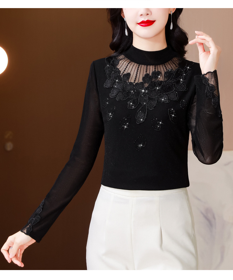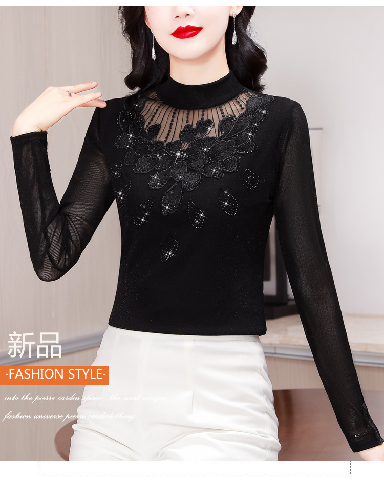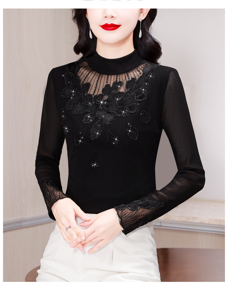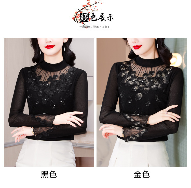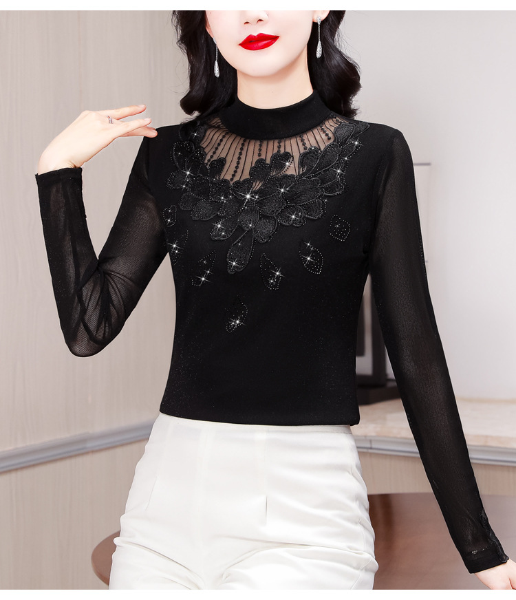 KQL E305N9562蕾丝网纱半高领花边烫钻打底衫修身长袖T恤