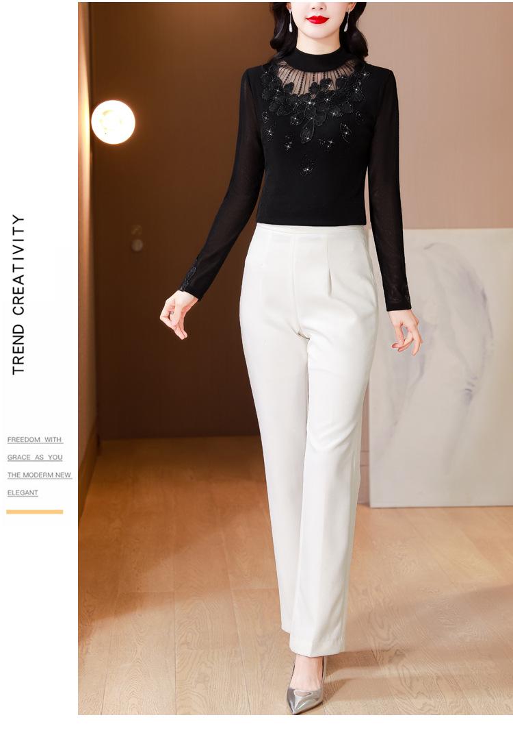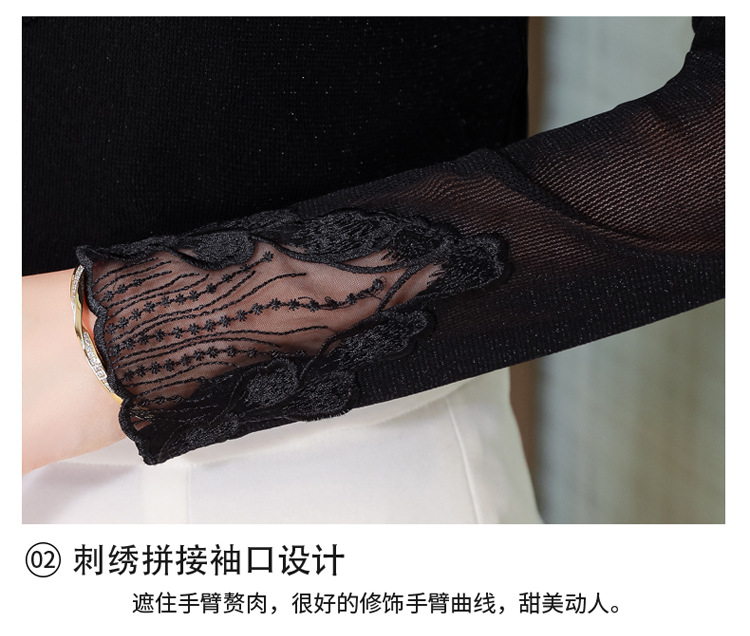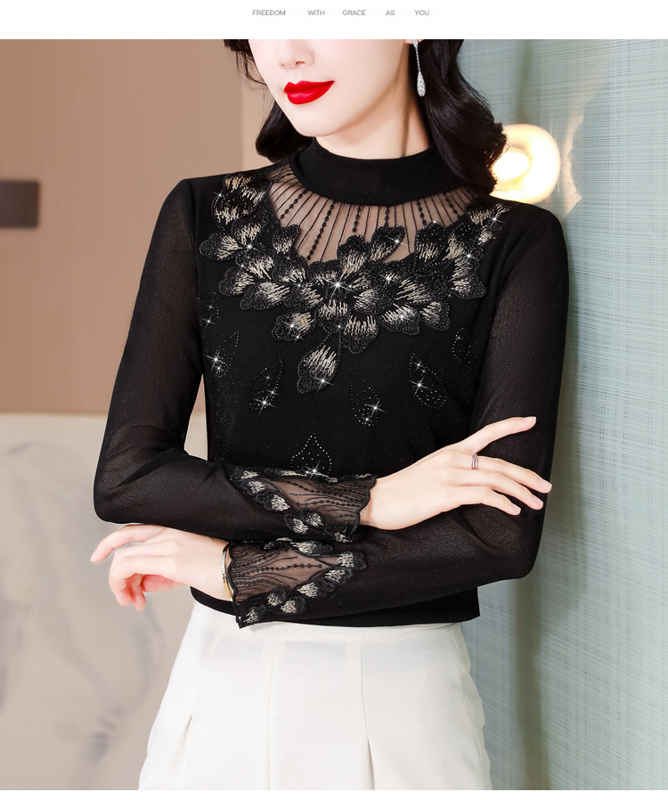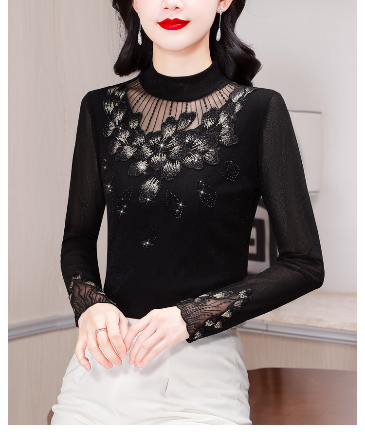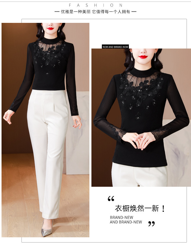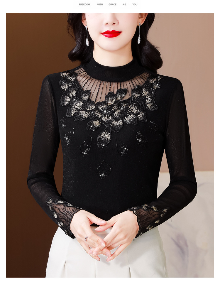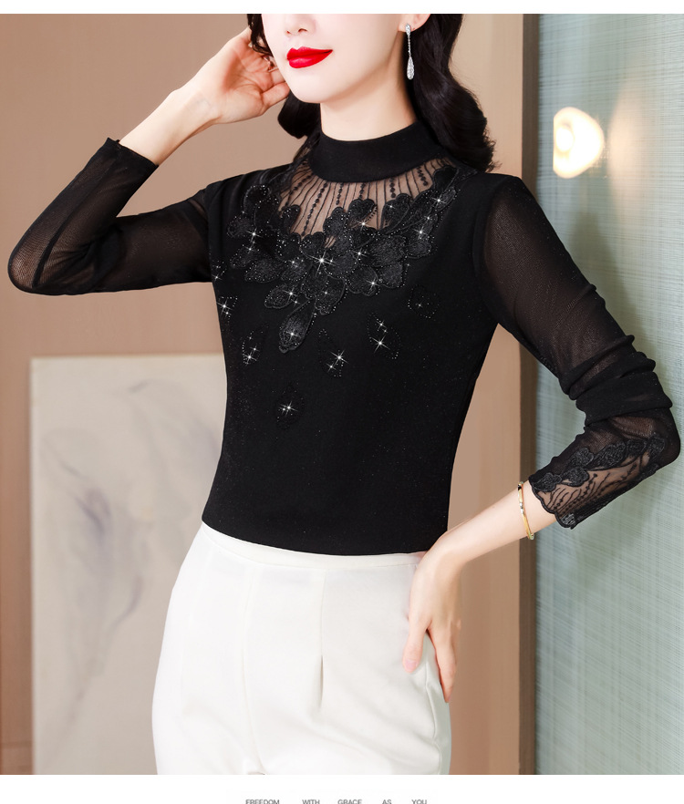KQL E305N9562蕾丝网纱半高领花边烫钻打底衫修身长袖T恤