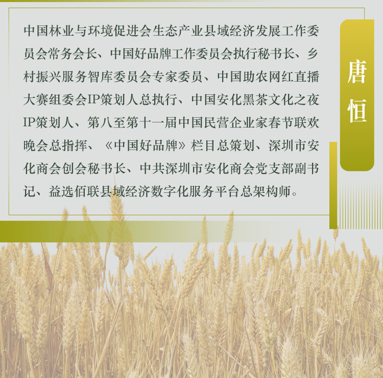 唐恒,中国林业与环境促进会生态产业县域经济发展工作委员会常务会长、中国好品牌工作委员会执行秘书长、乡村振兴服务智库委员会专家委员、中国助农网红直播大赛组委会IP策划人总执行、中国安化黑茶文化之夜IP策划人、第八至第十一届中国民营企业家春节联欢晚会总指挥、《中国好品牌》栏目总策划、深圳市安化商会创会秘书长、中共深圳市安化商会党支部副书记、益选佰联县域经济数字化服务平台总架构师。