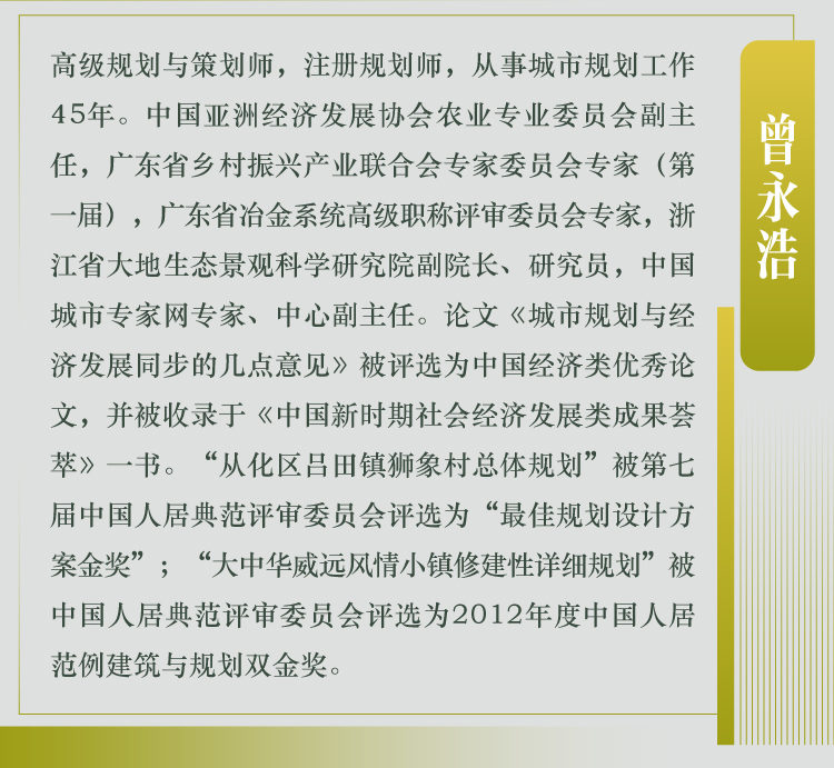 曾永浩,高级规划与策划师,注册规划师,从事城市规划工作45 年。中国亚洲经济发展协会农业专业委员会副主任,广东省乡村振兴产业联合会专家委员会专家(di一届),广东省冶金系统高级职称评审委员会专家,浙江省大地生态景观科学研究院副院长、研究员,中国城市专家网专家、中心副主任。论文《城市规划与经济发展同步的几点意见》被评选为中国经济类优秀论文,并被收录于《中国新时期社会经济发展类成果荟萃》一书。“从化区吕田镇狮象村总体规划”被第七届中国人居典范评审委员会评选为“zui佳规划设计方案金奖”; “大中华威远风情小镇修建性详细规划”被中国人居典范评审委员会评选为2012年度中国人居范例建筑与规划双金奖。