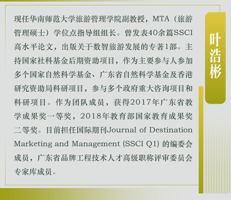 叶浩彬,现任华南师范大学旅游管理学院副教授,MTA(旅游管理硕士)学位点指导组组长。曾发表40余篇SSCI高水平论文,出版关于数智旅游发展的专著1部。主持国家社科基金后期资助项目,作为主要参与人参加多个国家自然科学基金、广东省自然科学基金及香港研究资助局科研项目,参与多个政府重大咨询项目和科研项目。作为团队成员,获得2017年广东省教学成果奖一等奖,2018年教yu部国jia教育成果奖二等奖。目前担任国际期刊Journal of Destination Marketing and Management (SSCI Q1) 的编委会成员,广东省品牌工程技术人才高级职称评审委员会专家库成员。