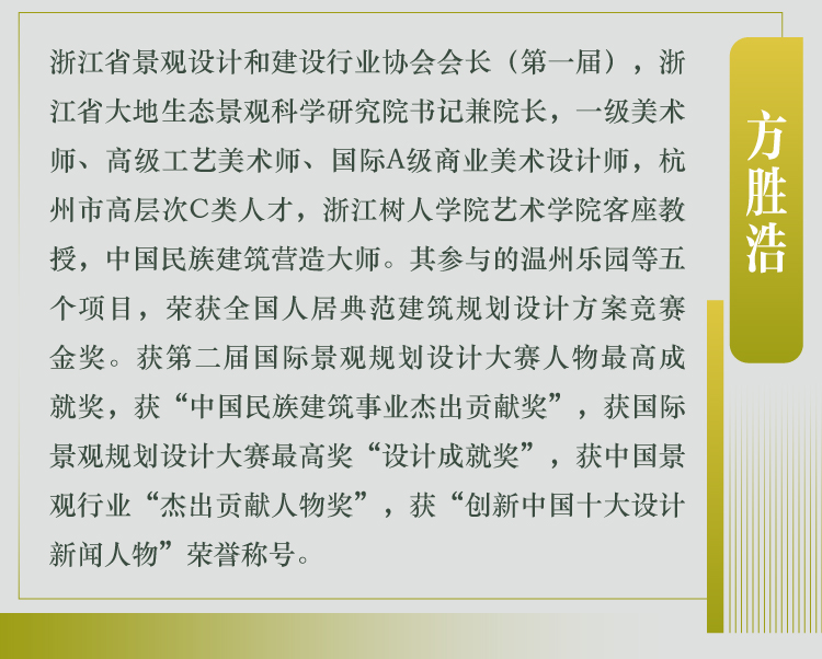 方胜浩,浙江省景观设计和建设行业协会会长(di一届),浙江省大地生态景观科学研究院书记兼院长,1ji美术师、高级工艺美术师、国际A级商业美术设计师,杭州市高层次C类人才,浙江树人学院艺术学院客座教授,中国民族建筑营造大师。其参与的温州乐园等五个项目,荣获全国人居典范建筑规划设计方案竞赛金奖。获第二届国际景观规划设计大赛人物zui高成就奖,获“中国民族建筑事业杰出贡献奖”,获国际景观规划设计大赛最高奖“设计成就奖”,获中国景观行业“杰出贡献人物奖”,获“创新中国十大设计新闻人物”荣誉称号。