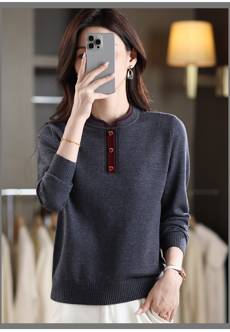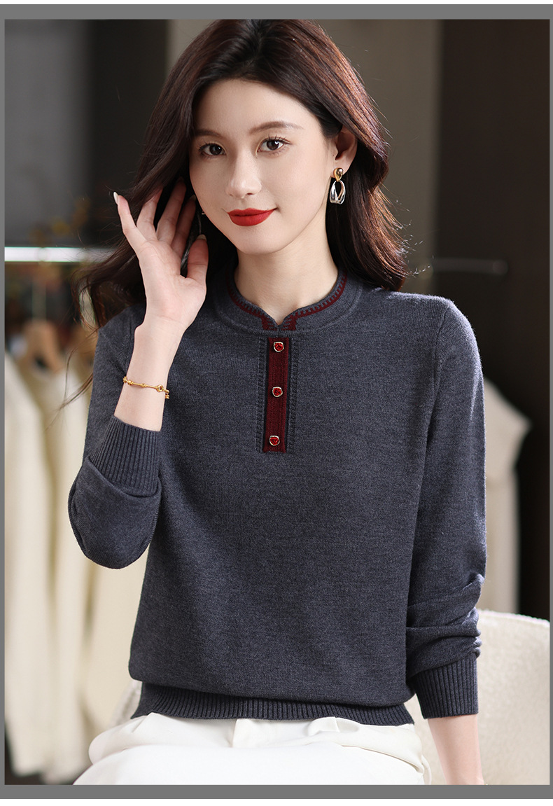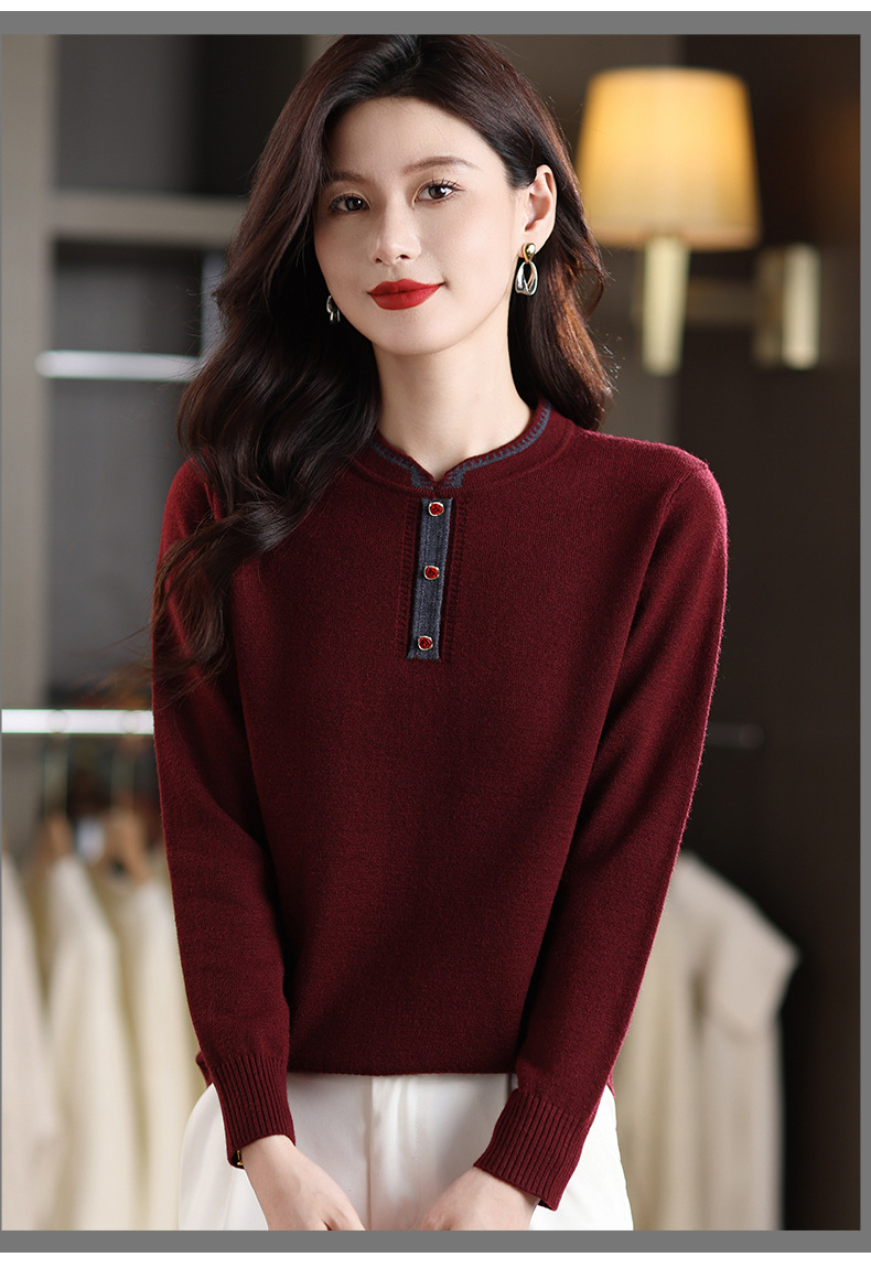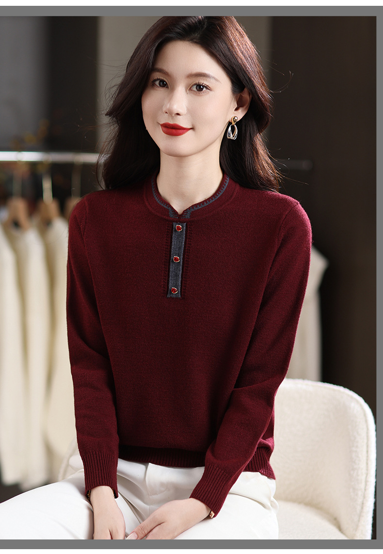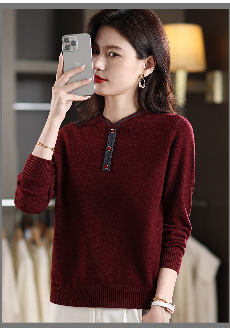 MY-1248酒红色针织衫女秋冬新款撞色纽扣装饰V领毛衣复古风宽松打底上衣