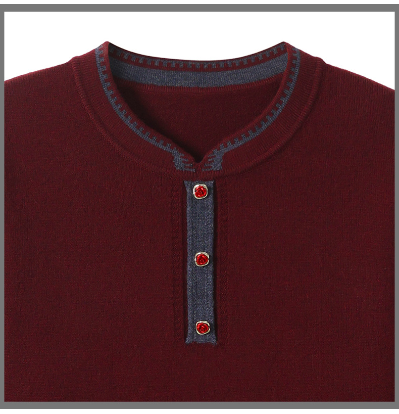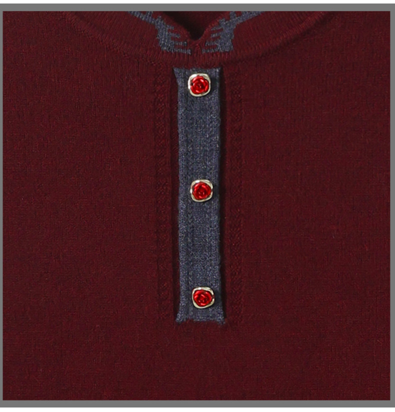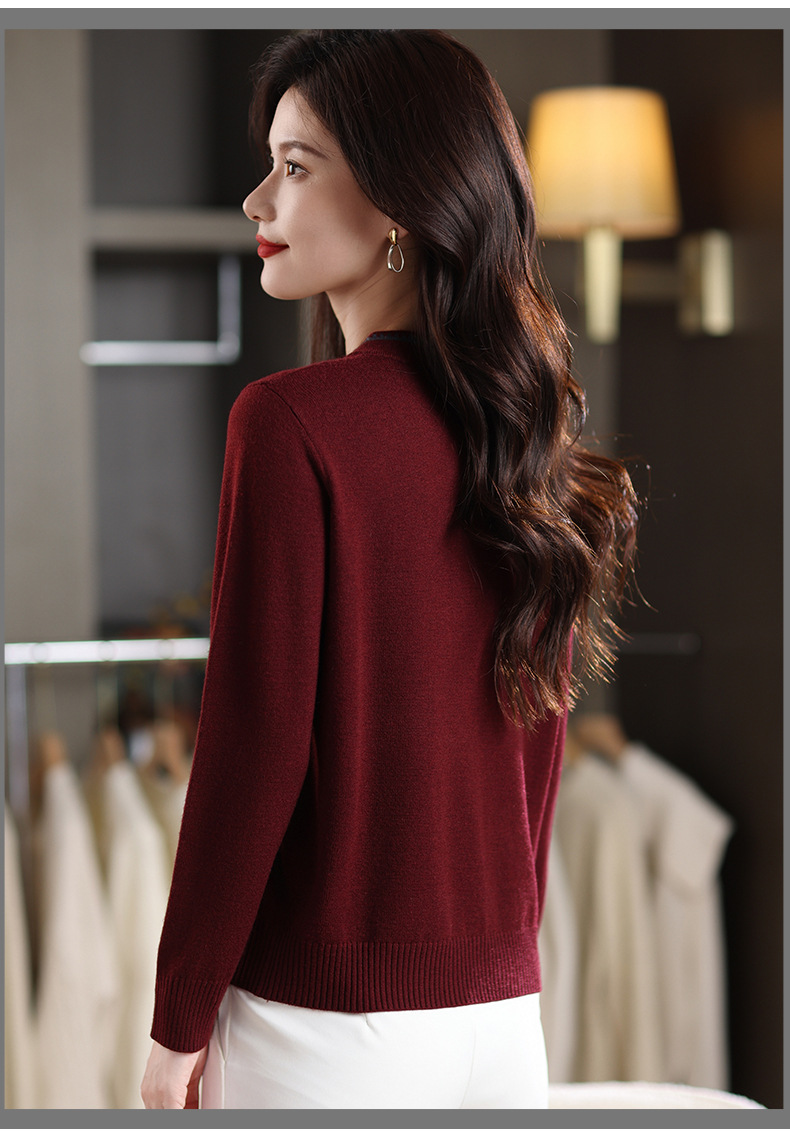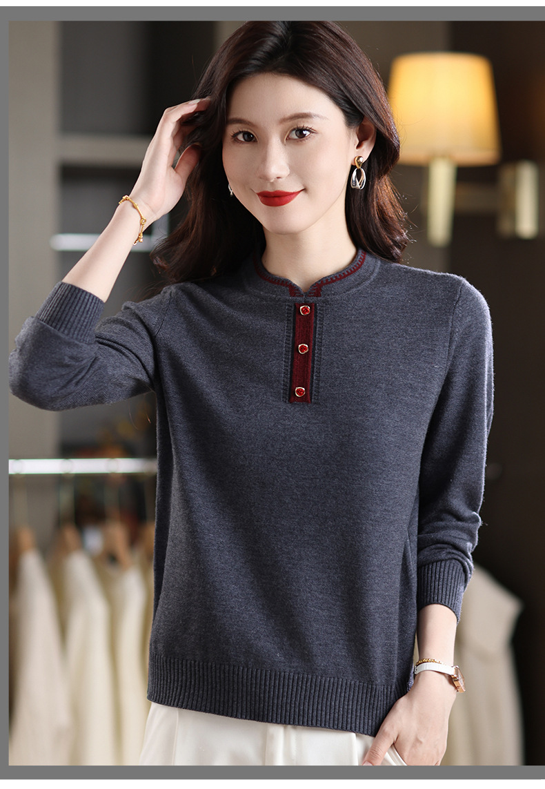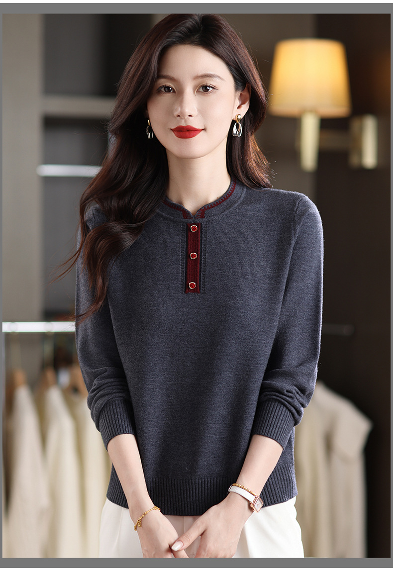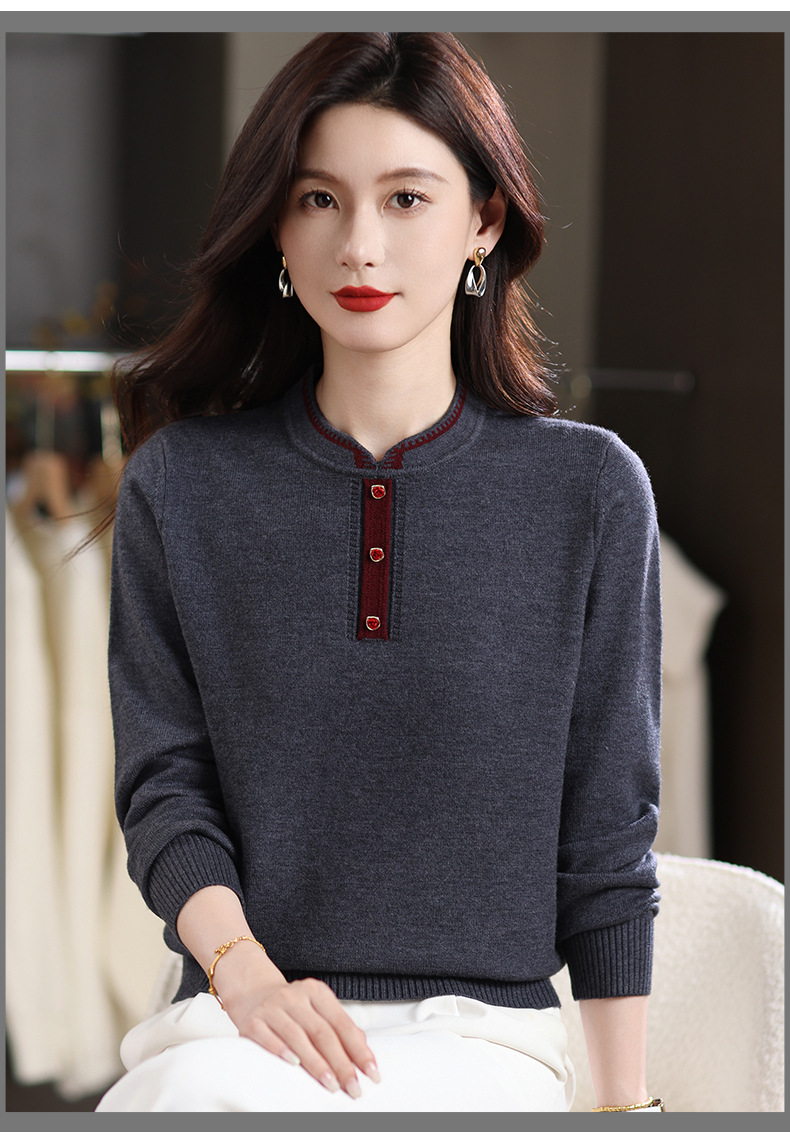 MY-1248酒红色针织衫女秋冬新款撞色纽扣装饰V领毛衣复古风宽松打底上衣