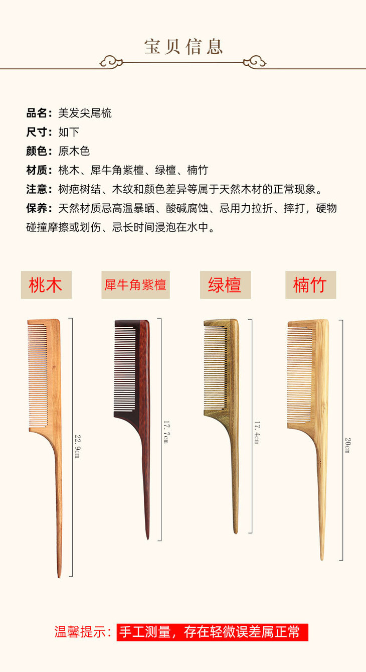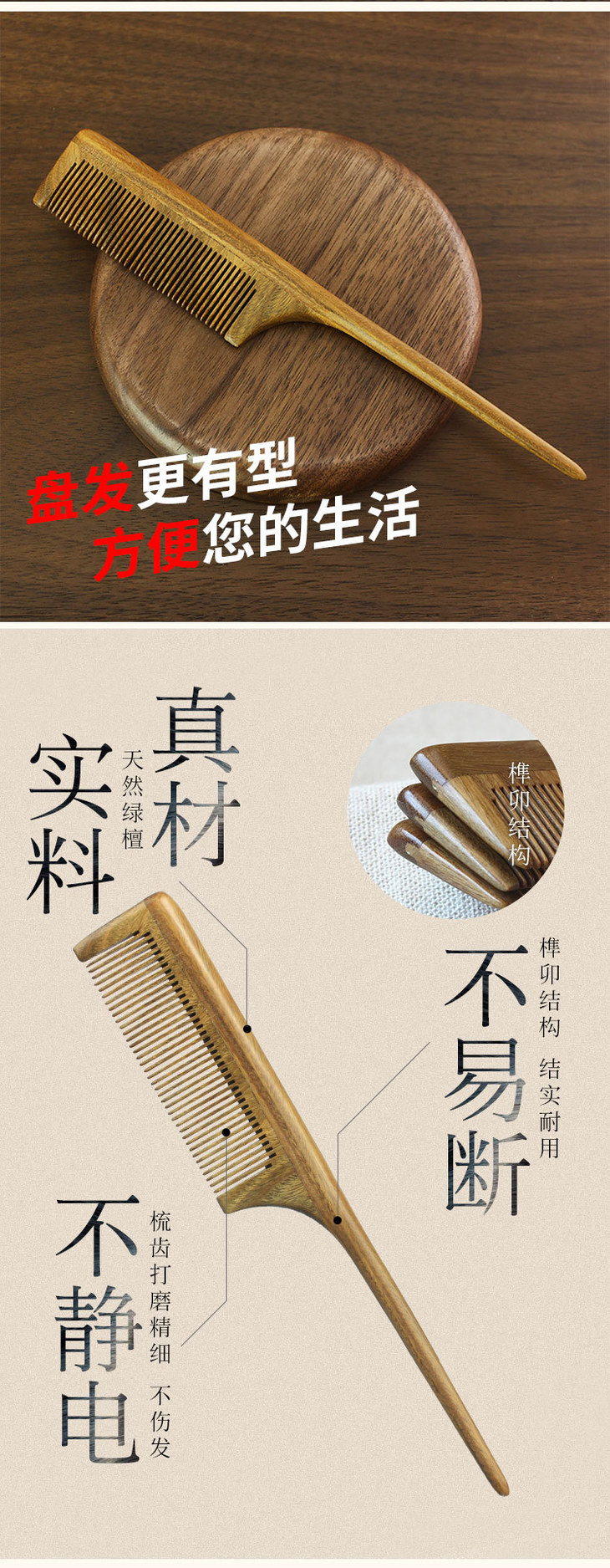 【天然檀木梳尖尾梳】顺发按摩木梳 不卡发木梳