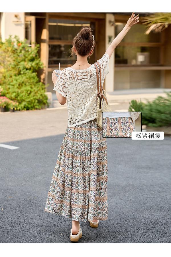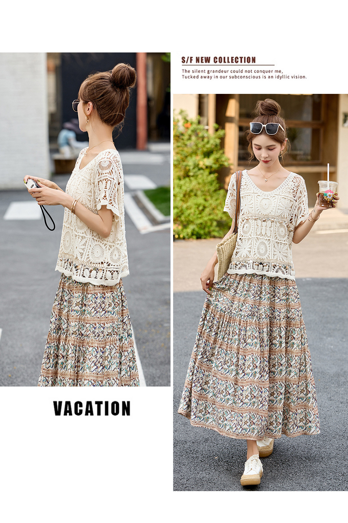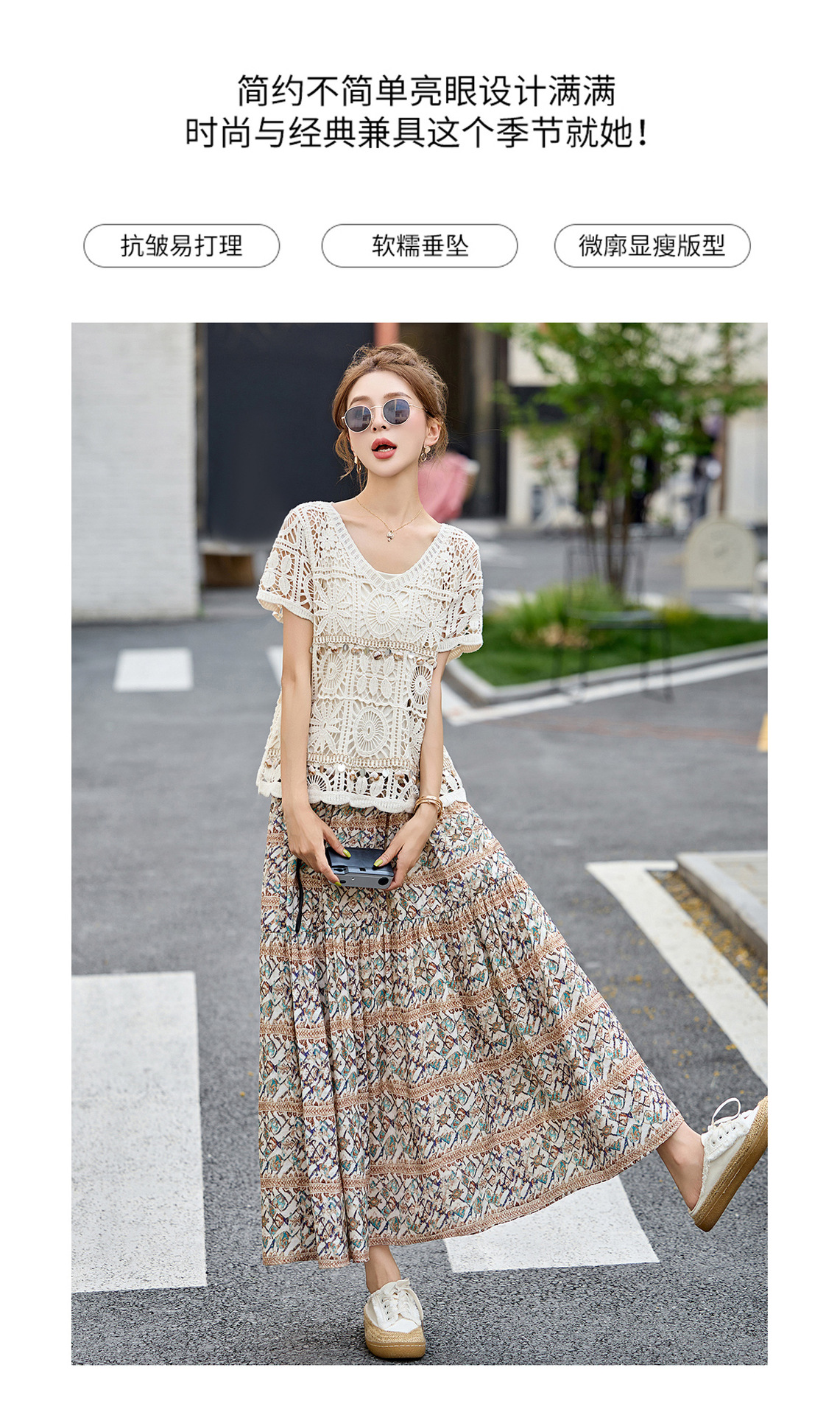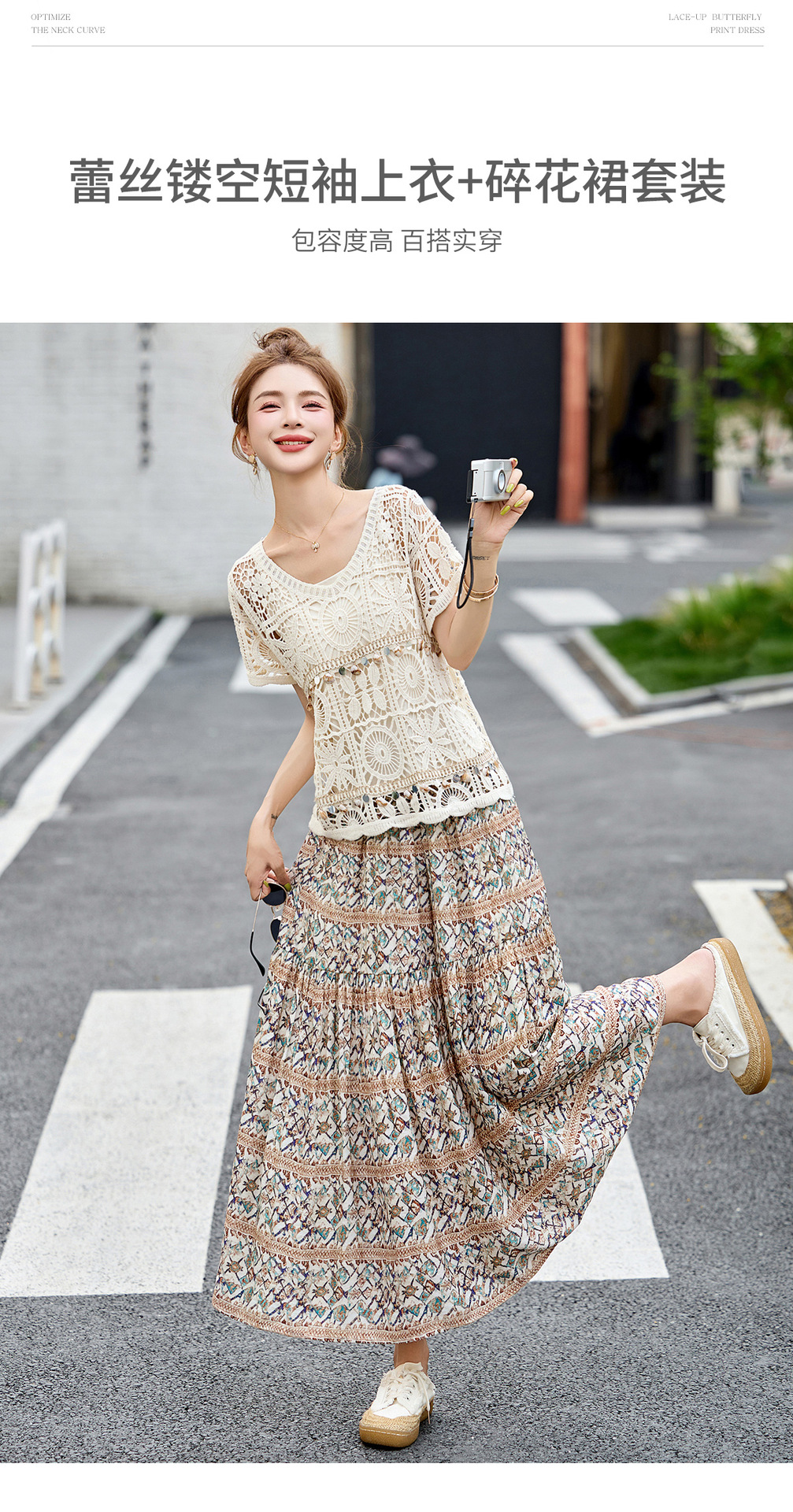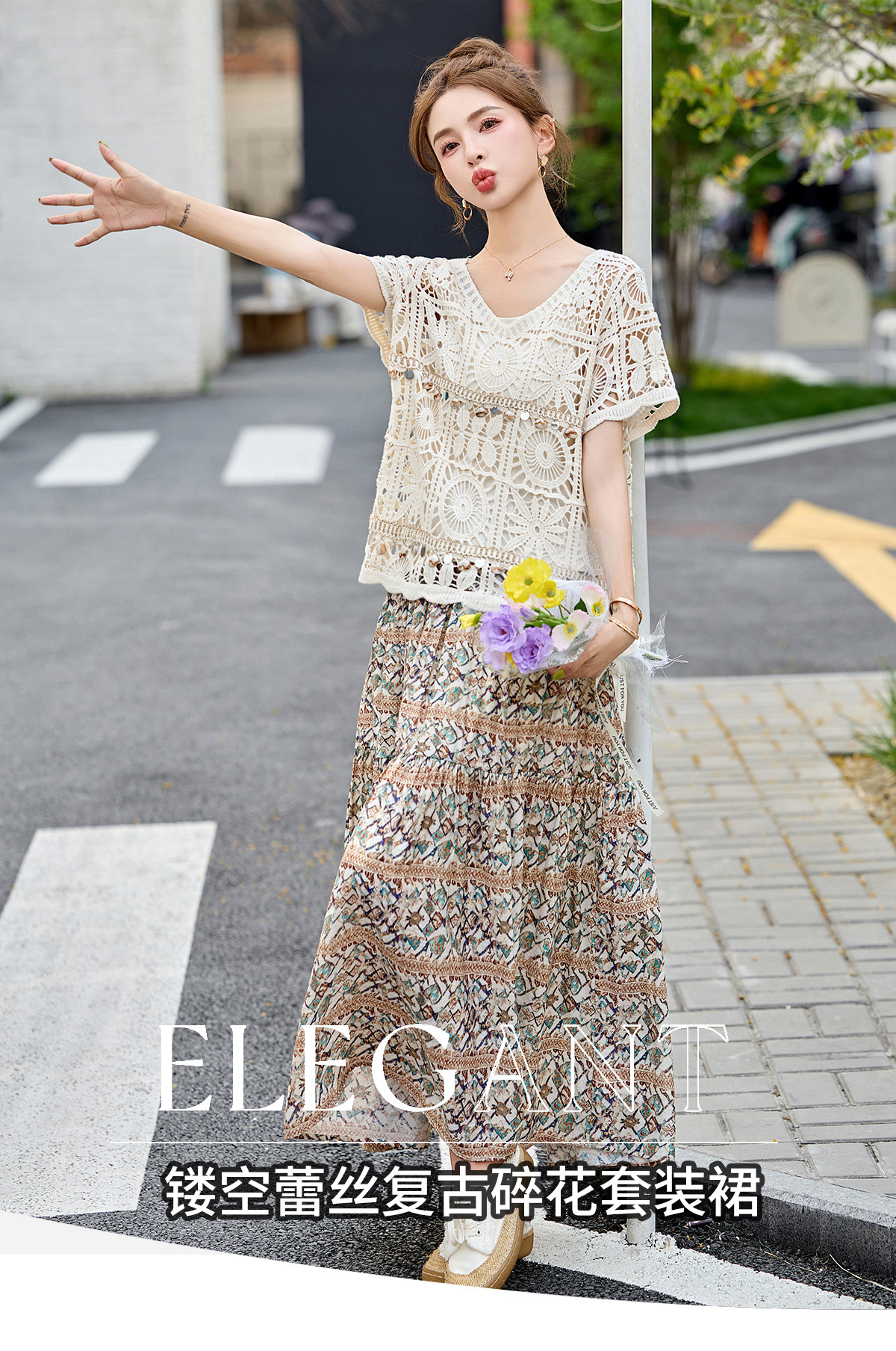 气质蕾丝镂空复古钉珠圆领波西米亚碎花裙三件套HANYUSHE2529