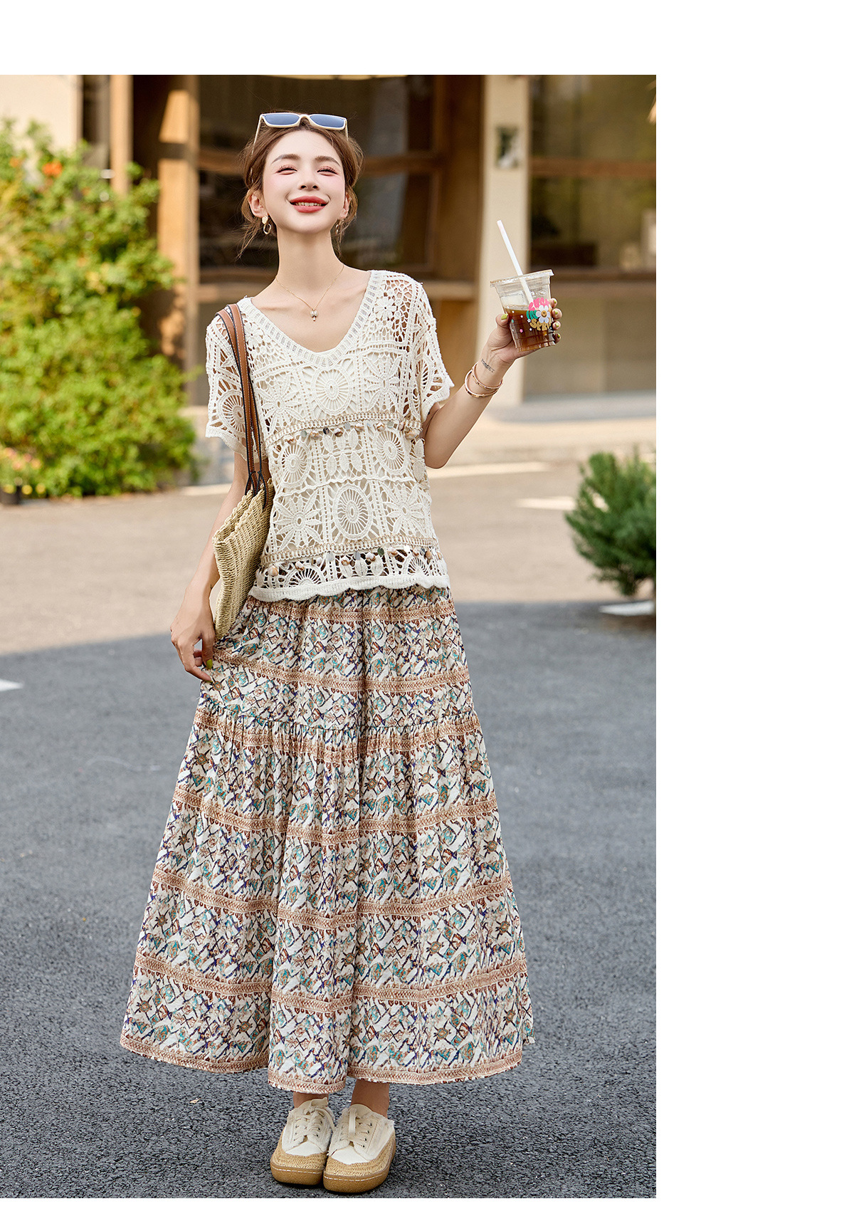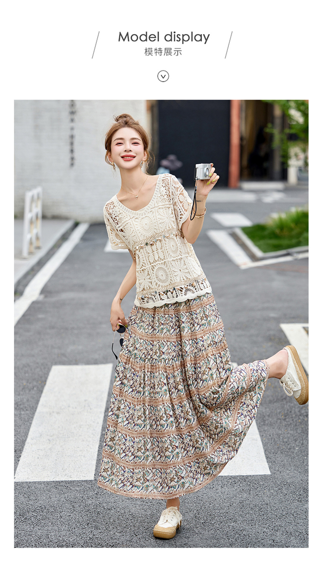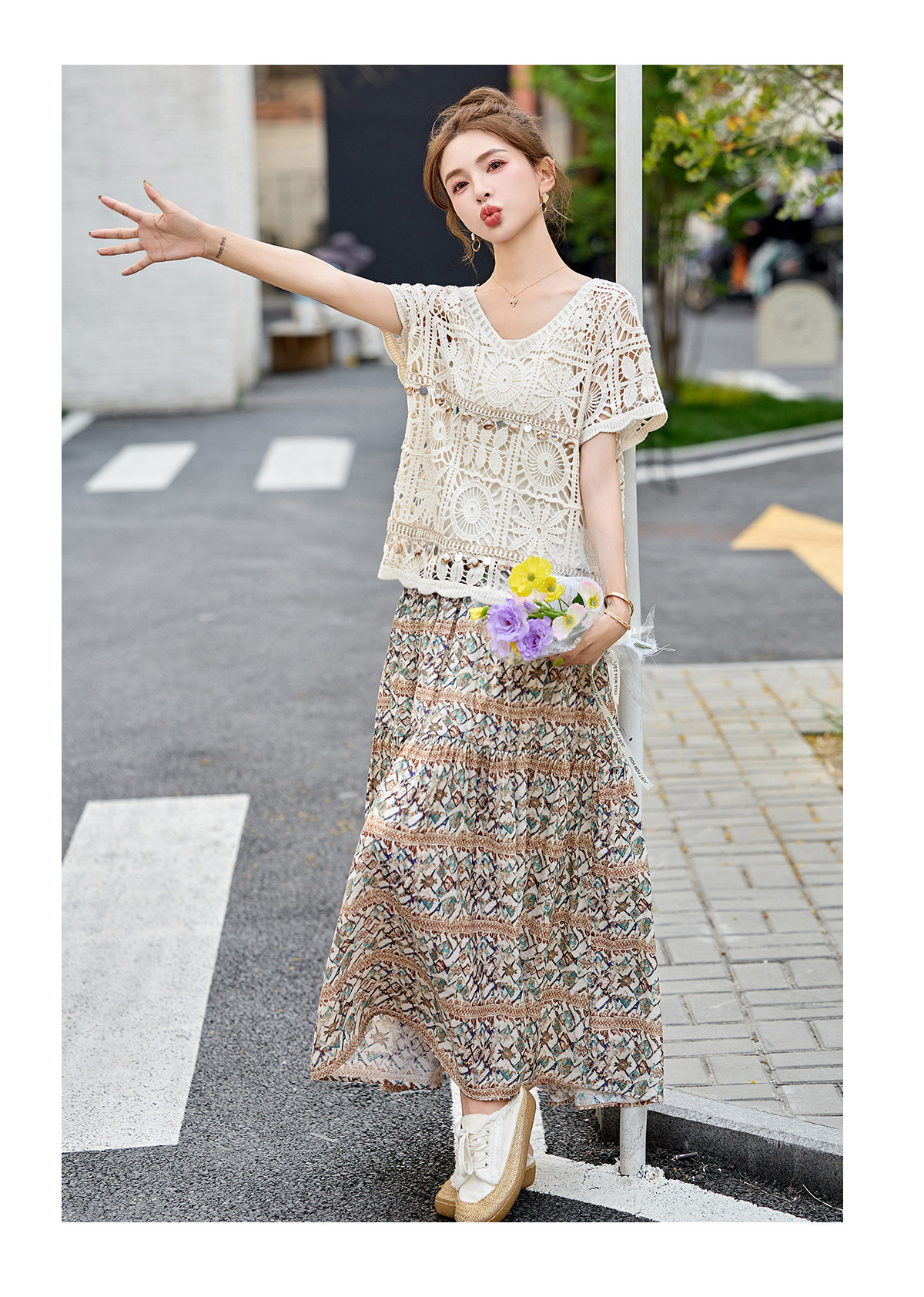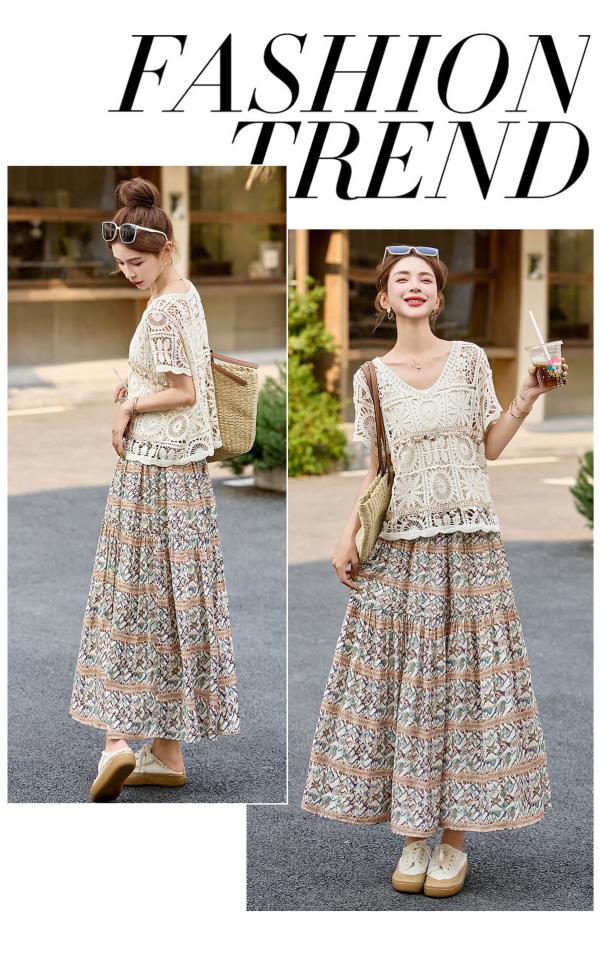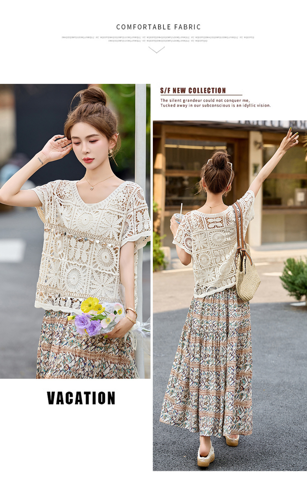 气质蕾丝镂空复古钉珠圆领波西米亚碎花裙三件套HANYUSHE2529