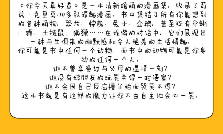 《你今天真好看》是一本清新暖萌的漫画集,收录了莉兹·克里莫150多张逗趣漫画。书中集结了所有你能想到的各种萌物,恐龙、棕熊、兔子、企鹅,甚至还有伞蜥、獾、土拨鼠、狐獴……在诙谐的对话中,它们展现出一种与生俱来的幽默感和令人艳羡的生活情趣。