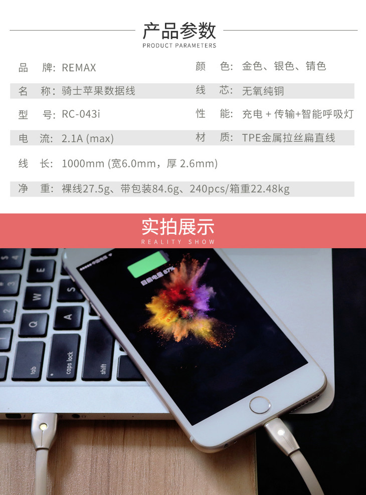 remax iphone6数据线6s苹果5手机6Plus充电线器发光数据线