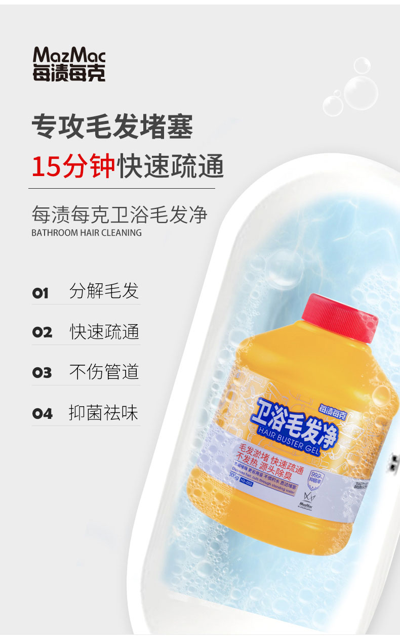 买2赠1,每渍每克卫浴毛发净,助你告别毛发淤堵,不刺鼻,不发热,专攻毛发淤堵