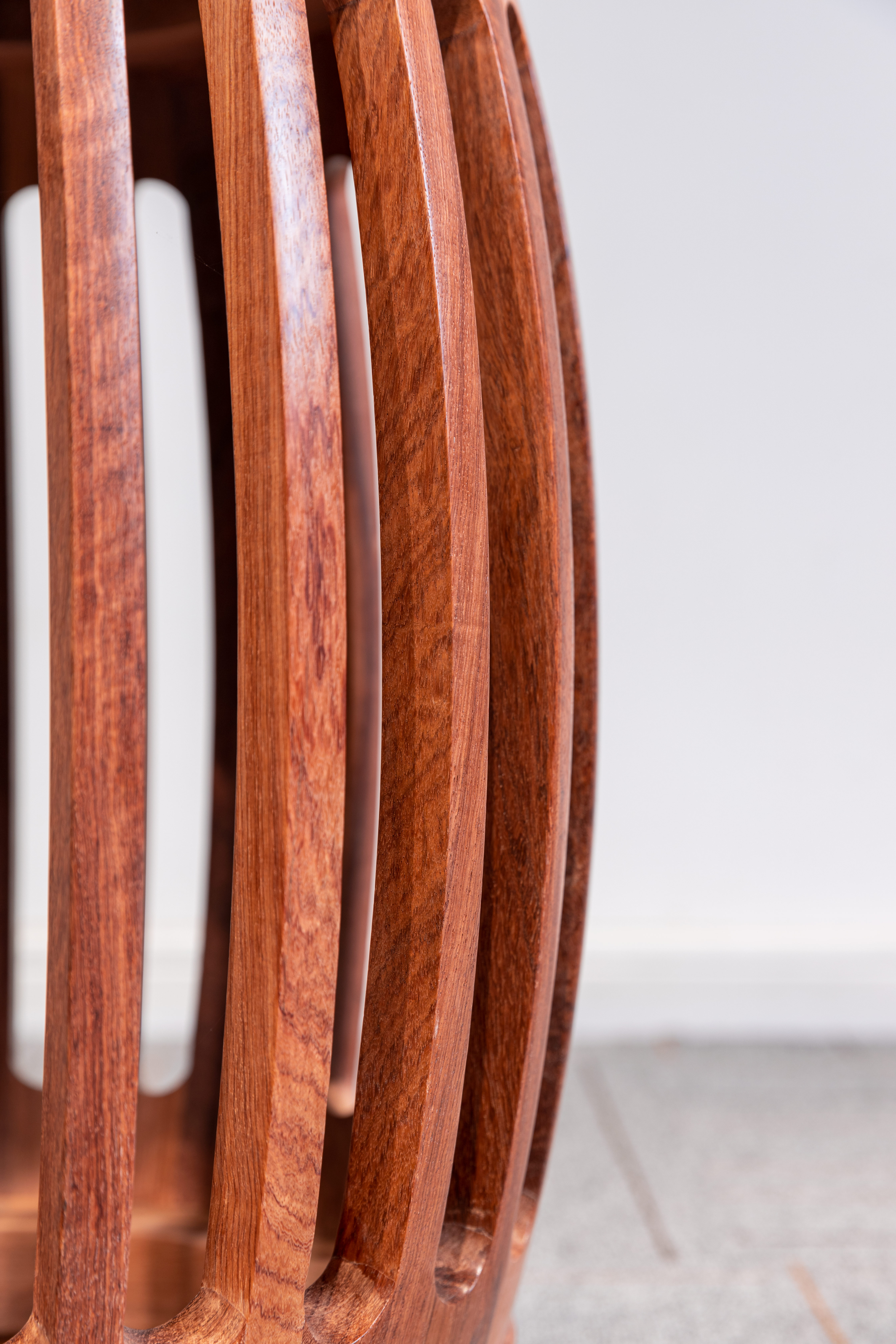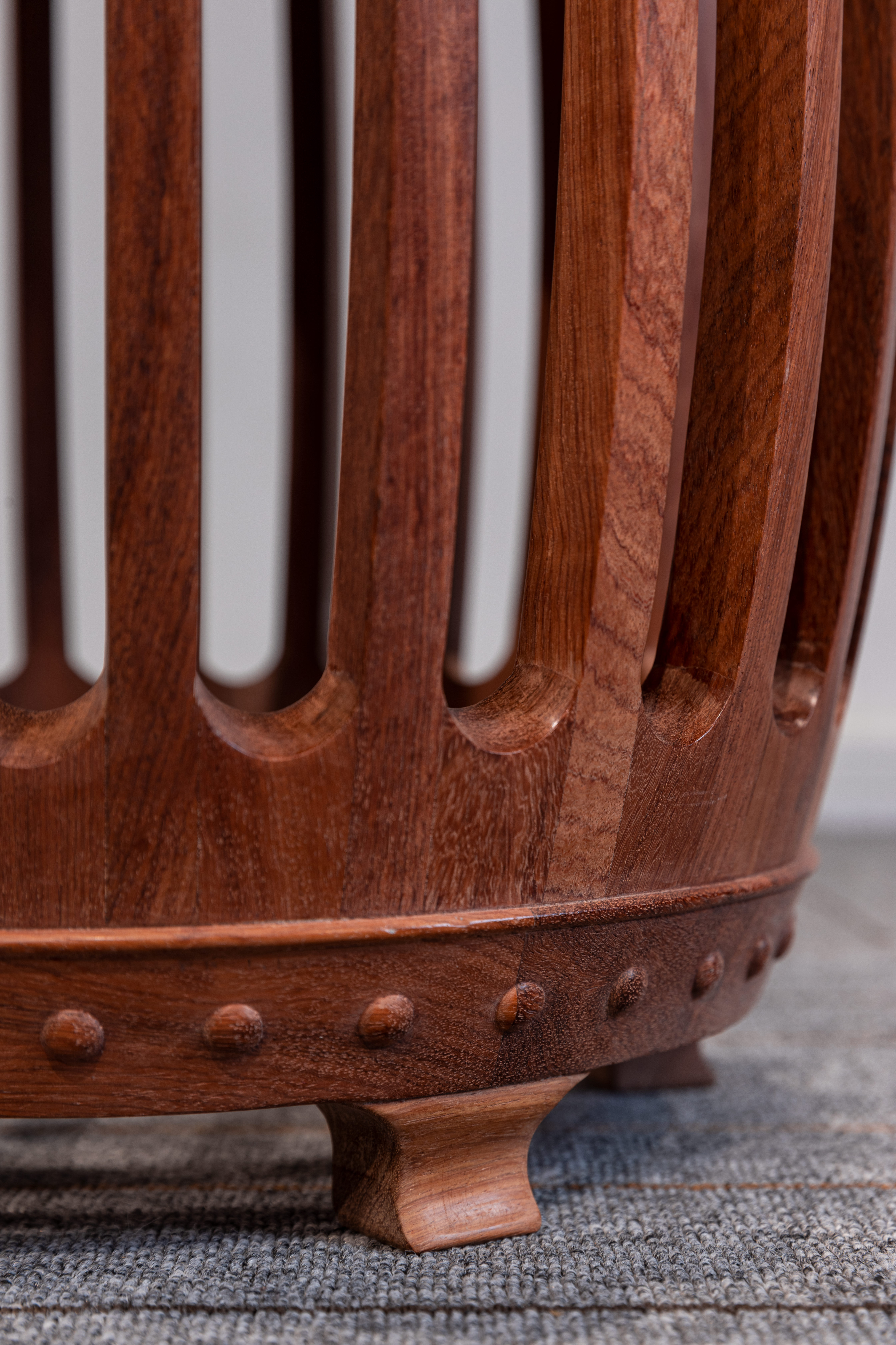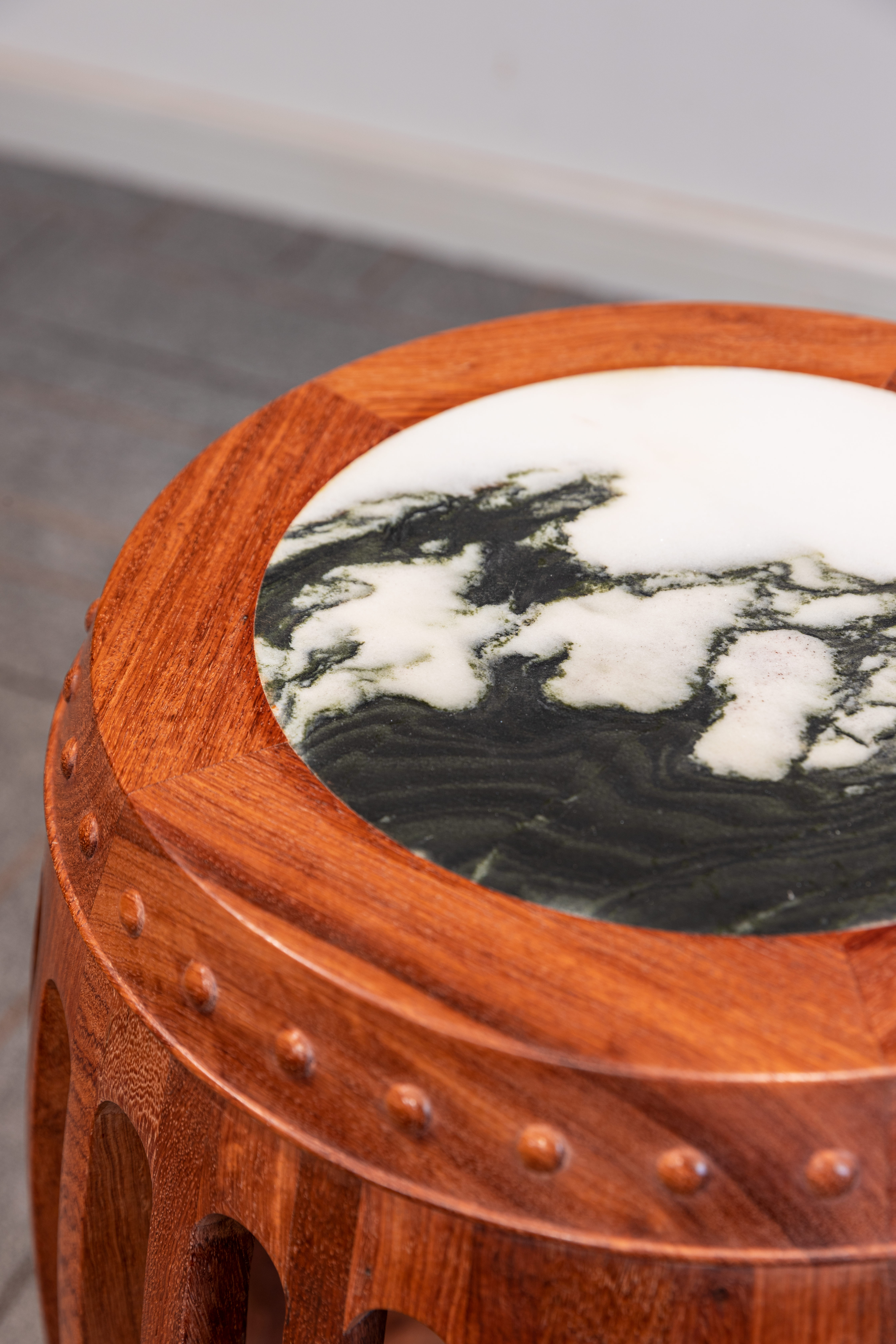 鼓凳形状似鼓,座面呈圆形,攒边框镶云石面面心;上下两排鼓钉整齐规矩,之间各起一道弦纹对称。腹部腔体膨出,由24根长条,上下各以短条相间而成,木条和短材断面皆为弧形,工艺十分考究。托泥下承六矮足,玲珑别致。整体造型通明灵秀,清雅不俗。