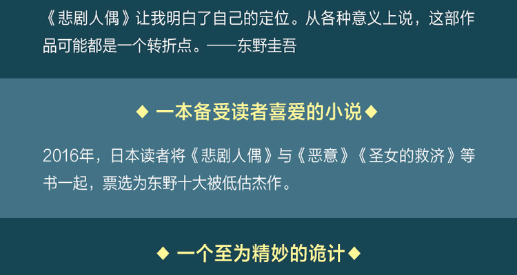 ★这本书改变了东野圭吾的写作生涯:东野圭吾说:创作《悲剧人偶》时,一开始我想写人偶视角、有巧妙构造的房子,现在回头看,我可能没意识到我渐渐对别的部分感兴趣了。《悲剧人偶》让我明白了自己的定位。从各种意义上说,这部作品可能都是一个转折点。
