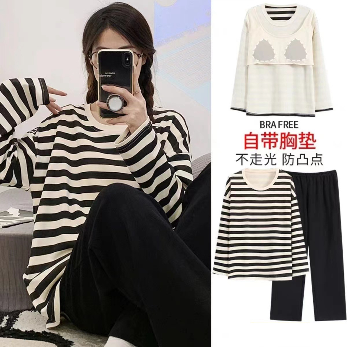 【可居家也可外穿❗️一体式设计告别繁琐】睡衣女春秋季长袖套装带胸垫2024年新款少女士大码可外穿。ja