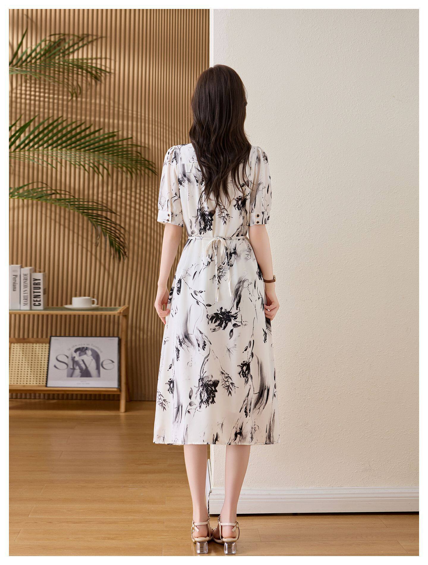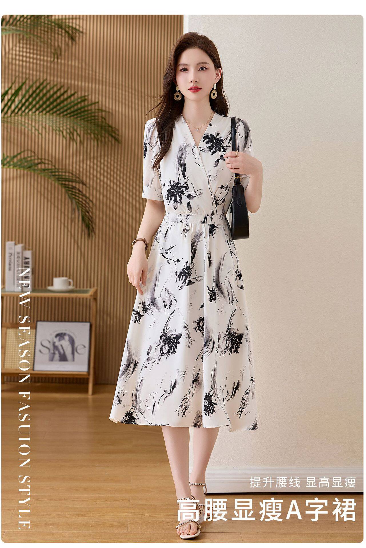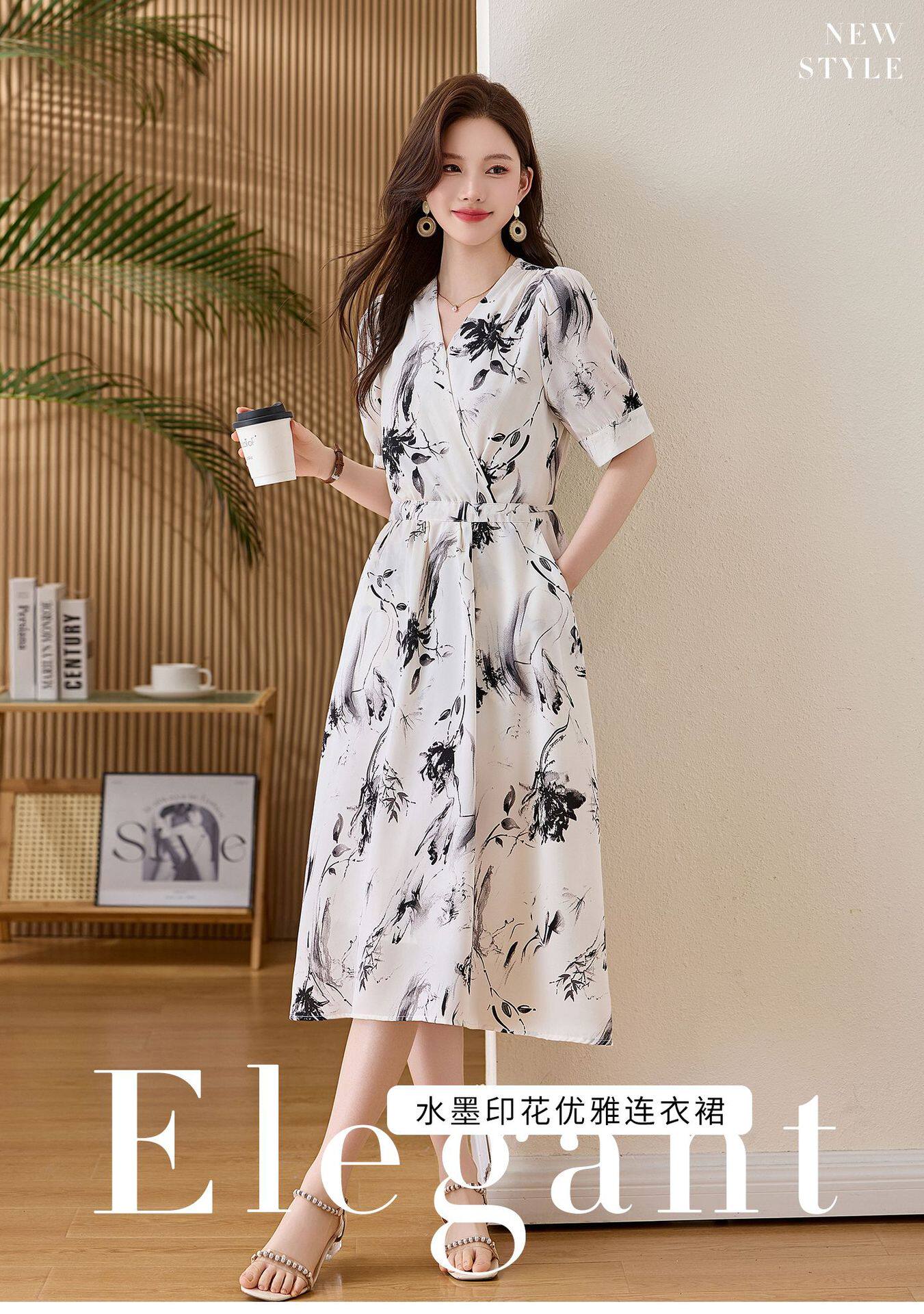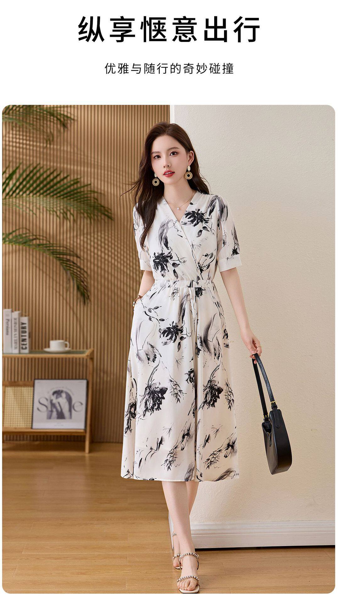「自」全新升级【铂金会员257/天猫339/差价82】(01233)洛诗琳法式水墨印花连衣裙女2026新款气质V领收腰显瘦茶歇裙