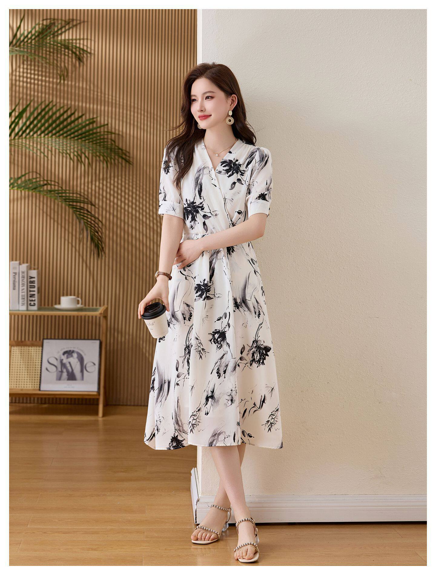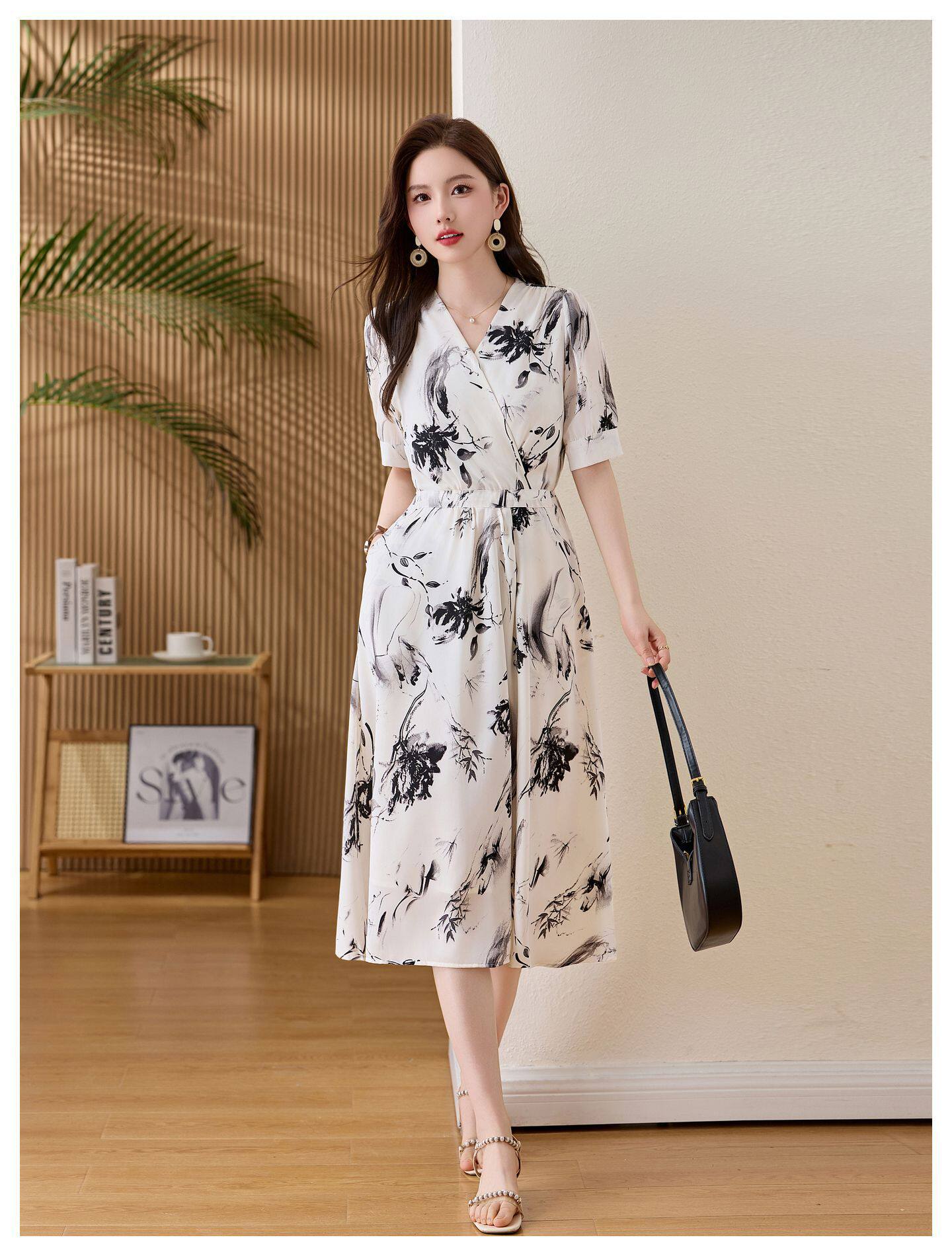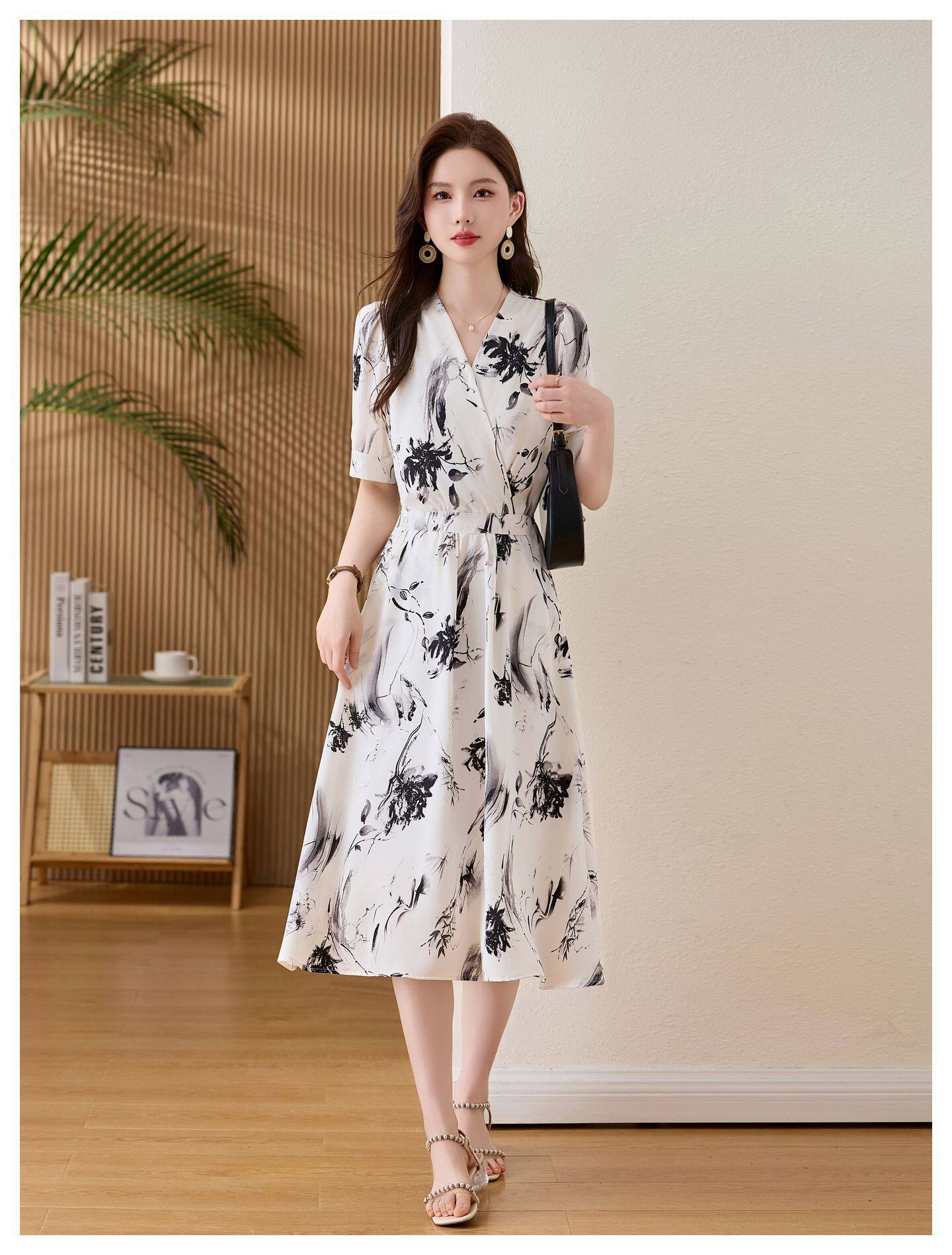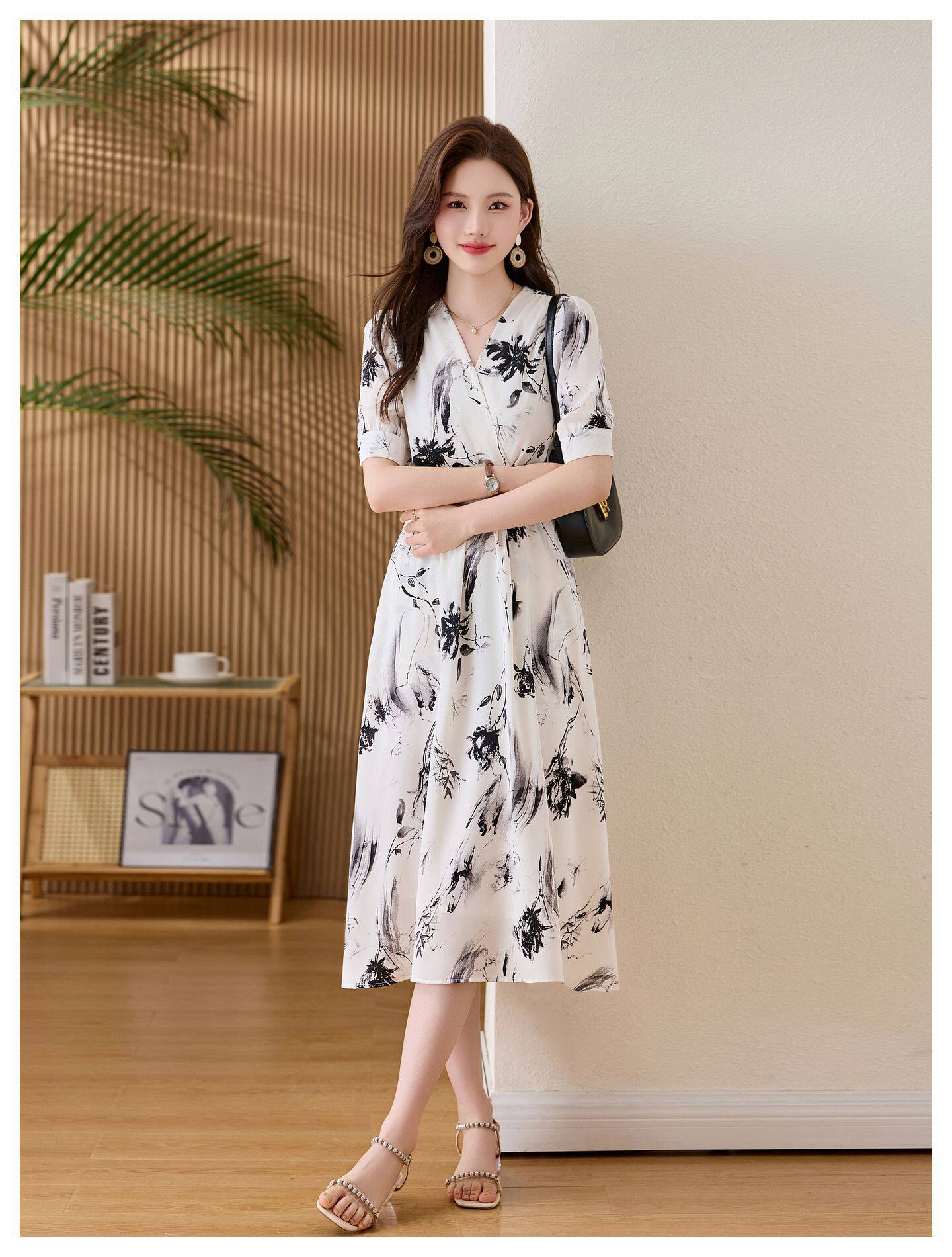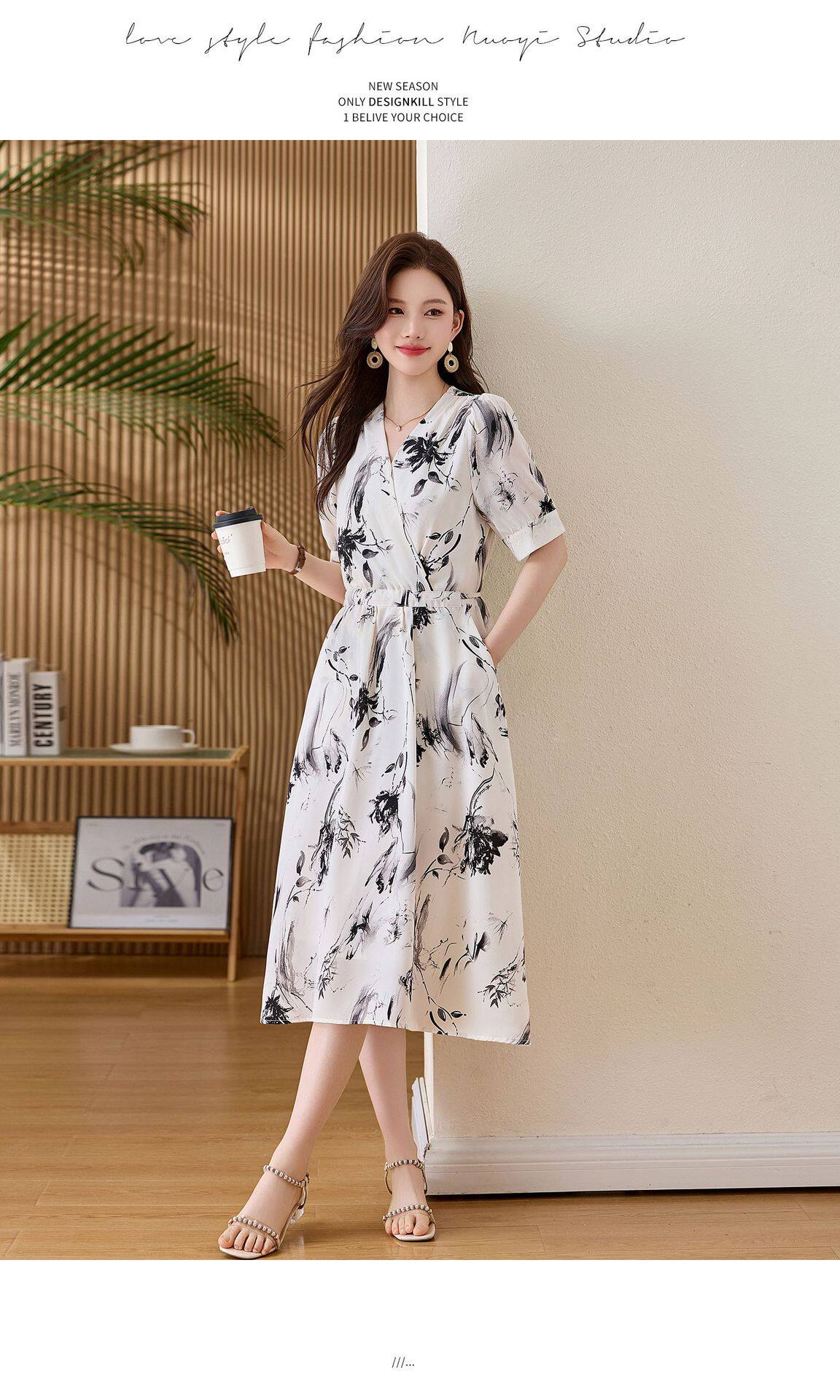 「自」全新升级【铂金会员257/天猫339/差价82】(01233)洛诗琳法式水墨印花连衣裙女2026新款气质V领收腰显瘦茶歇裙